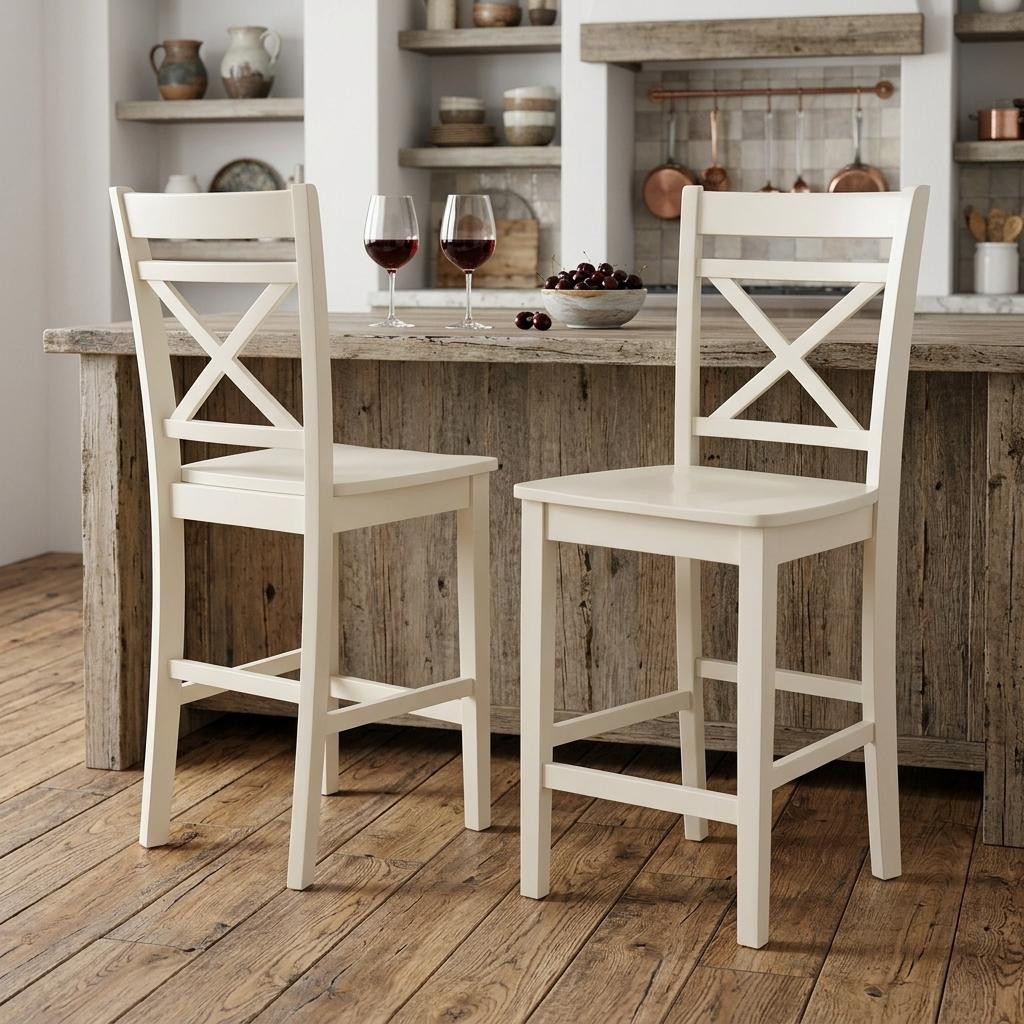 With this set of two 24-inch cream wood counter height bar chairs you can add design and extra seating to your space. A square seat design offers both comfort and style for your dining area. Crafted from durable rubberwood, the frame ensures longevity and stability. The rustic style of these chairs enhances the aesthetic of various interior themes. With a seat height of 23.7 inches, they provide the perfect elevation for counter tables. The elegant cream color enhances any decor, making them a versatile choice for your home. 39.00-inch h x 18.00-inch w x 21.00-inch d.