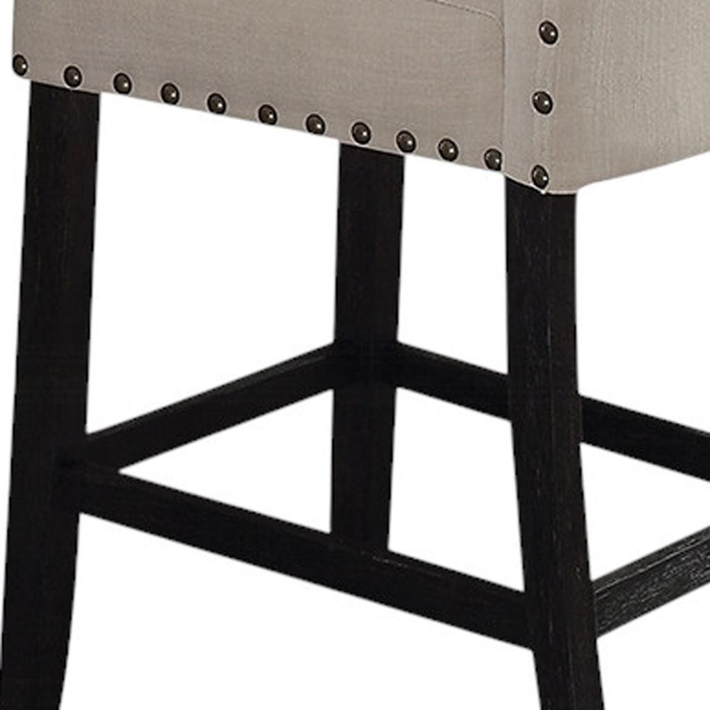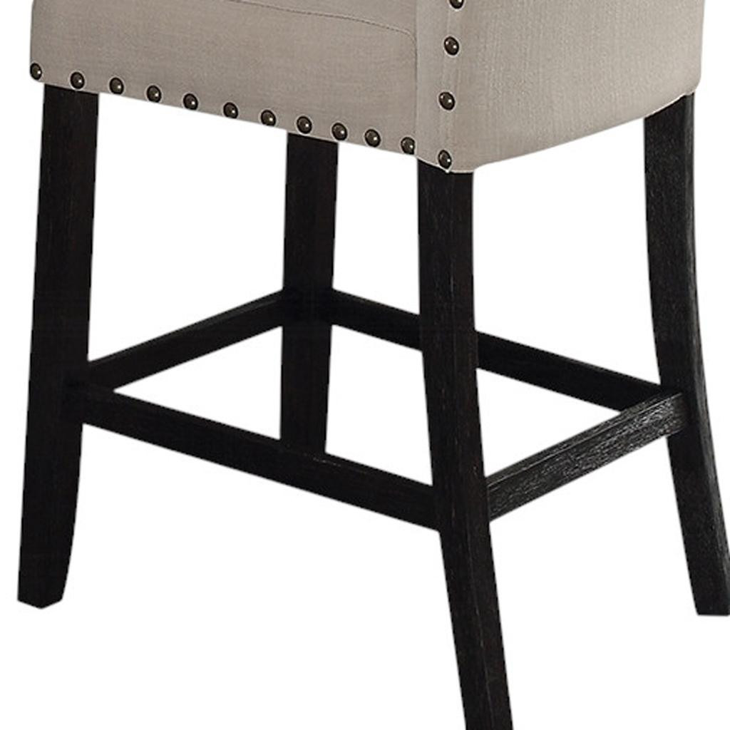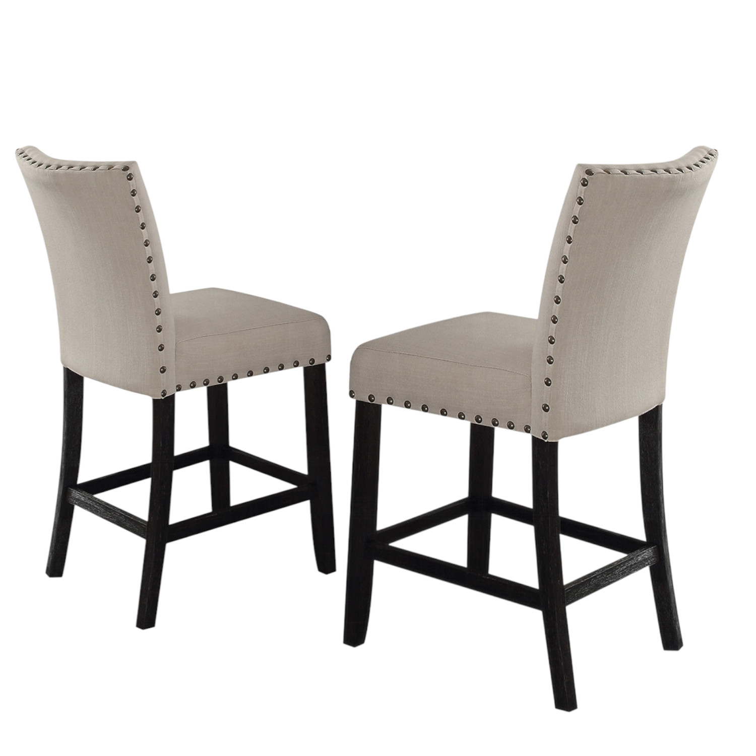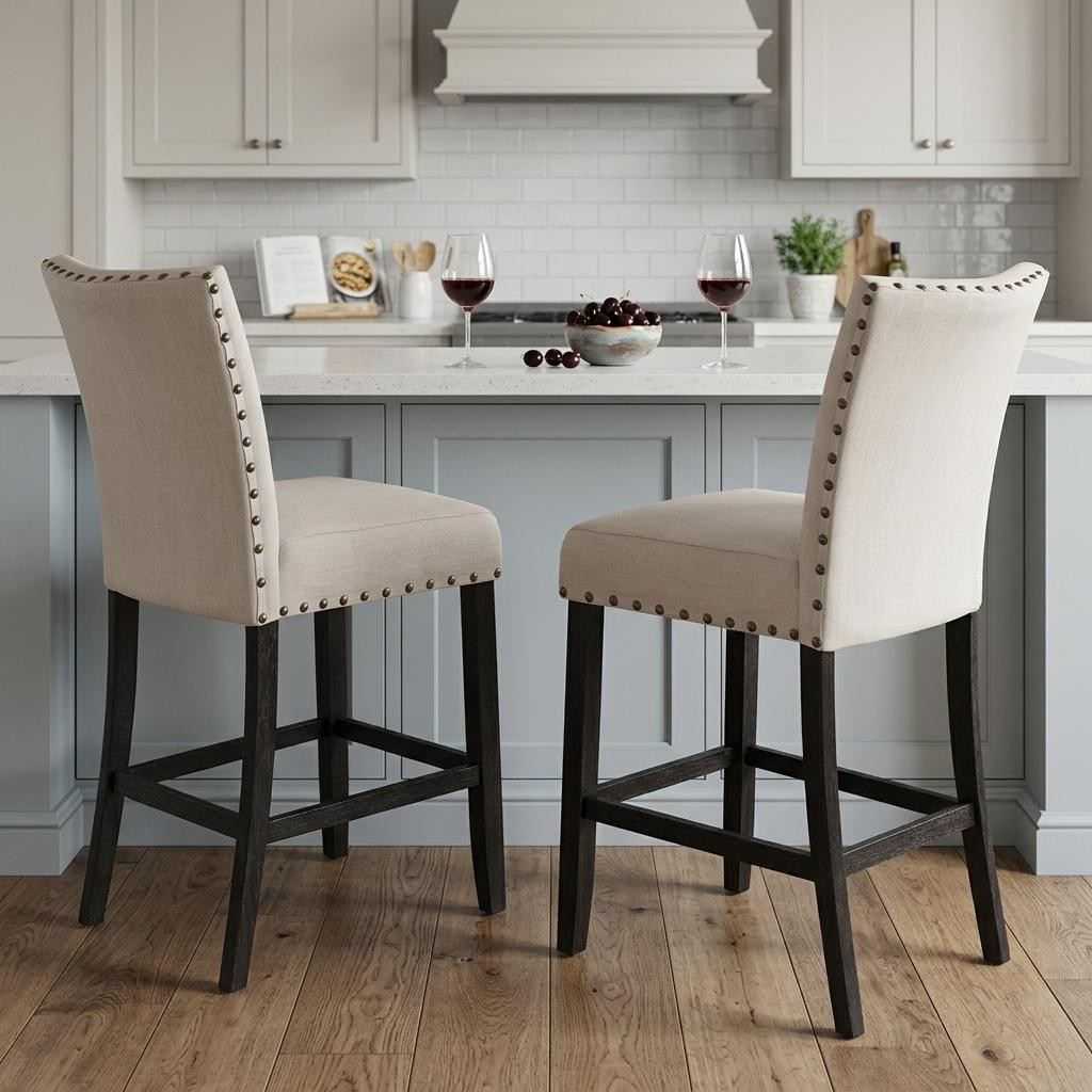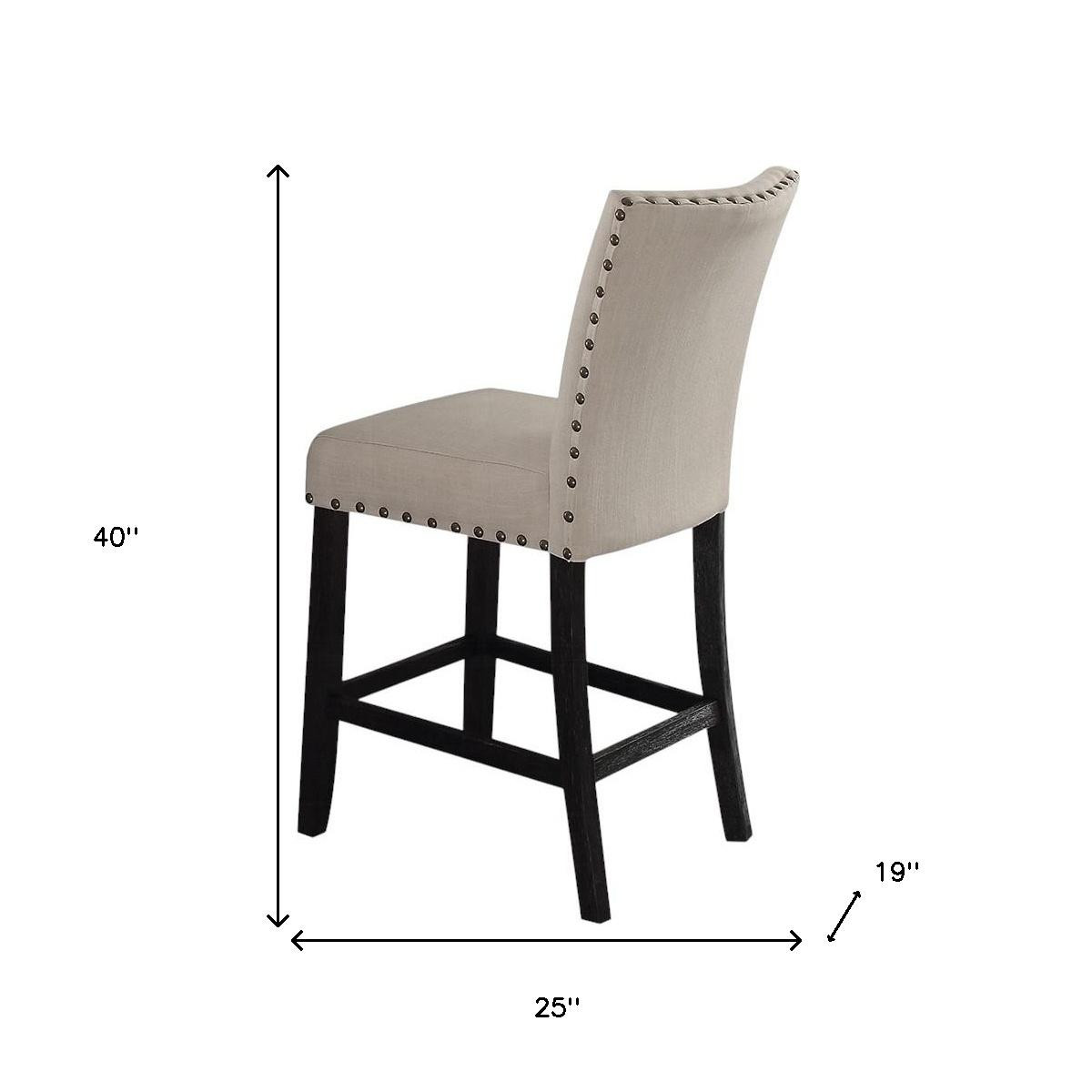 Bring a trendy bar vibe to your space, with this set of two 26-inch beige and oak solid wood and linen counter height bar chairs. A sleek beige and oak monotone color gives this solid wood and solid wood stool a fresh and updated look. The base of this stool is made from solid wood in a beige and oak color that is a nice contrast to the beige solid wood seat. 40.00-inch h x 25.00-inch w x 19.00-inch d.