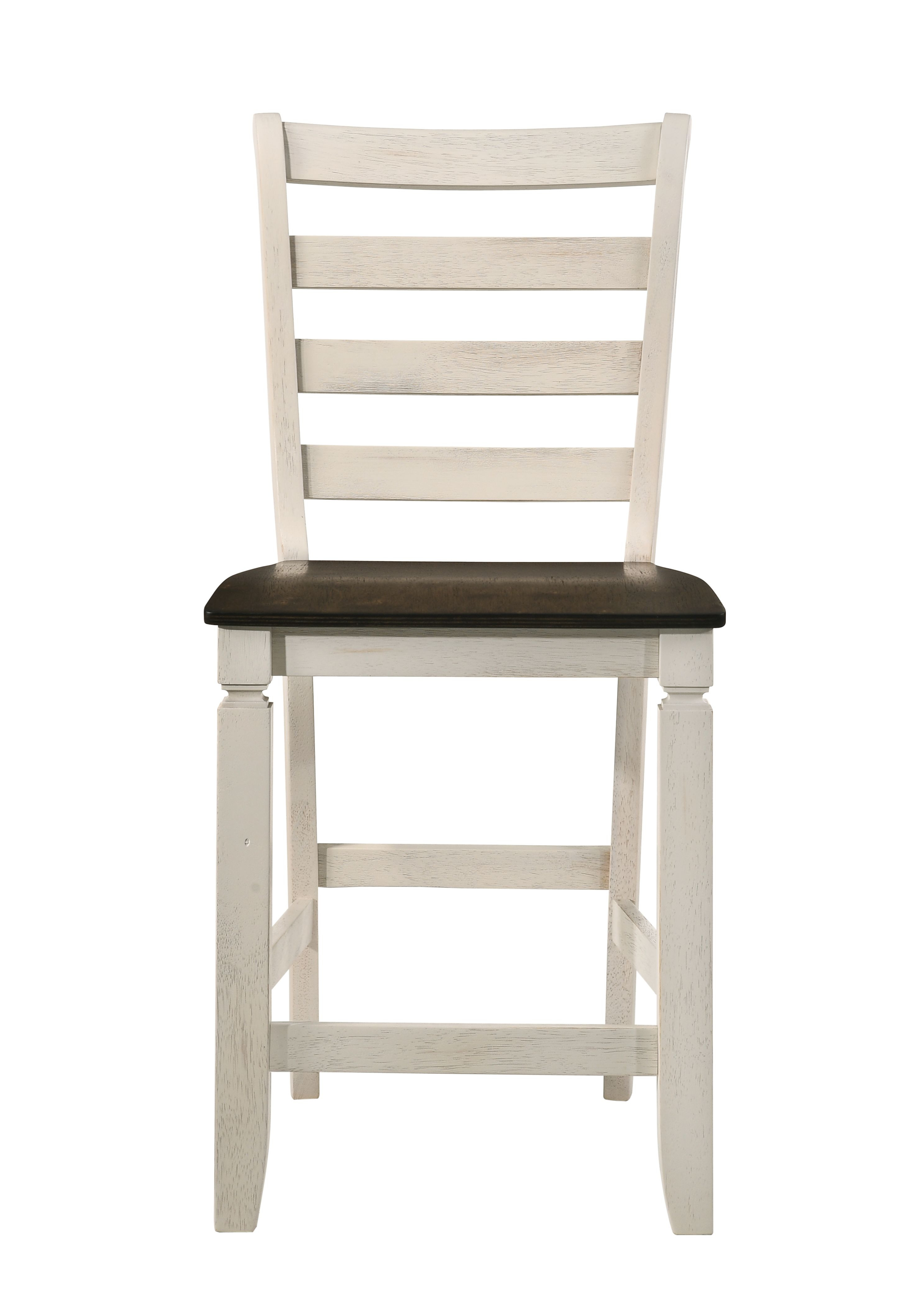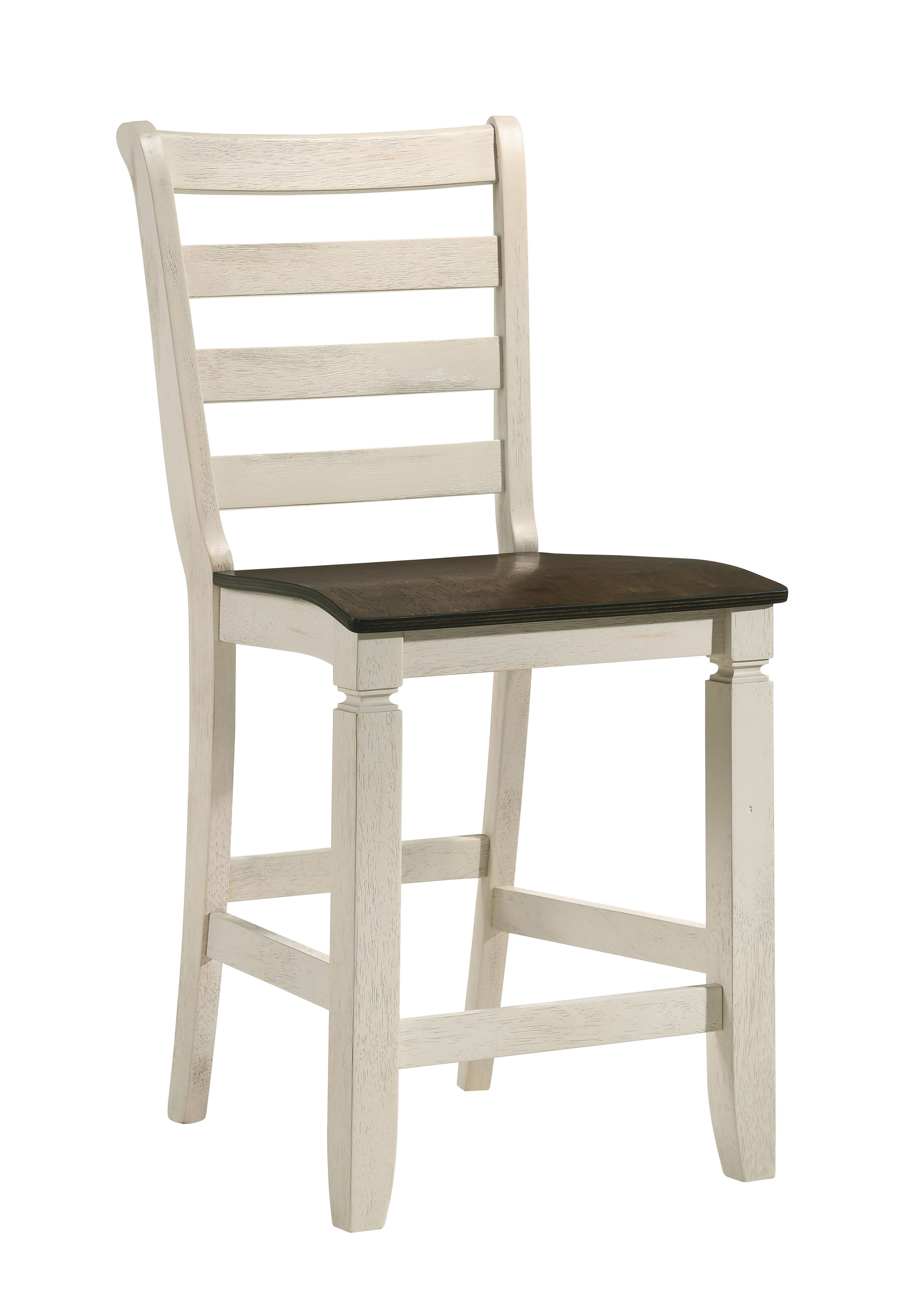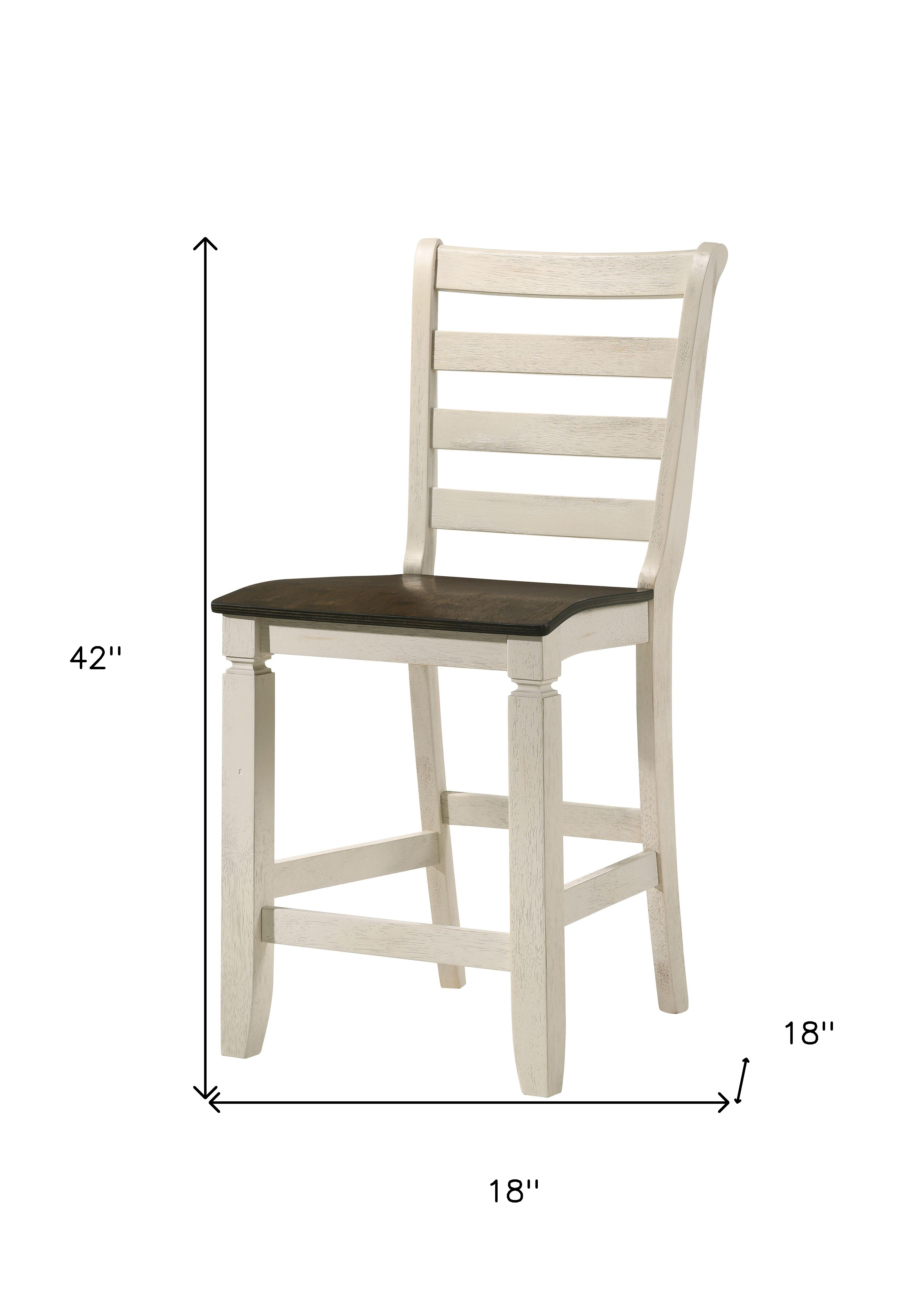 With this set of two 24-inch oak and antiqued white solid wood counter height bar chairs you can add design and extra seating to your space. The square seat style provides a modern touch, while the rubberwood construction ensures durability. Boasting a transitional style, these chairs effortlessly blend with various decor themes. The solid wood frame in an antiqued white color offers a charming aesthetic that enhances any room's ambiance, making them a perfect addition to your home. 42.00-inch h x 18.00-inch w x 18.00-inch d.