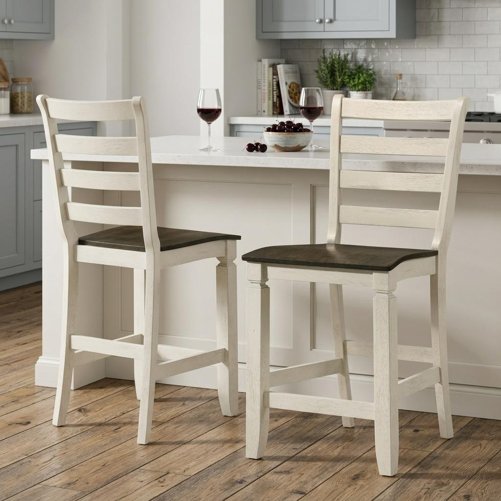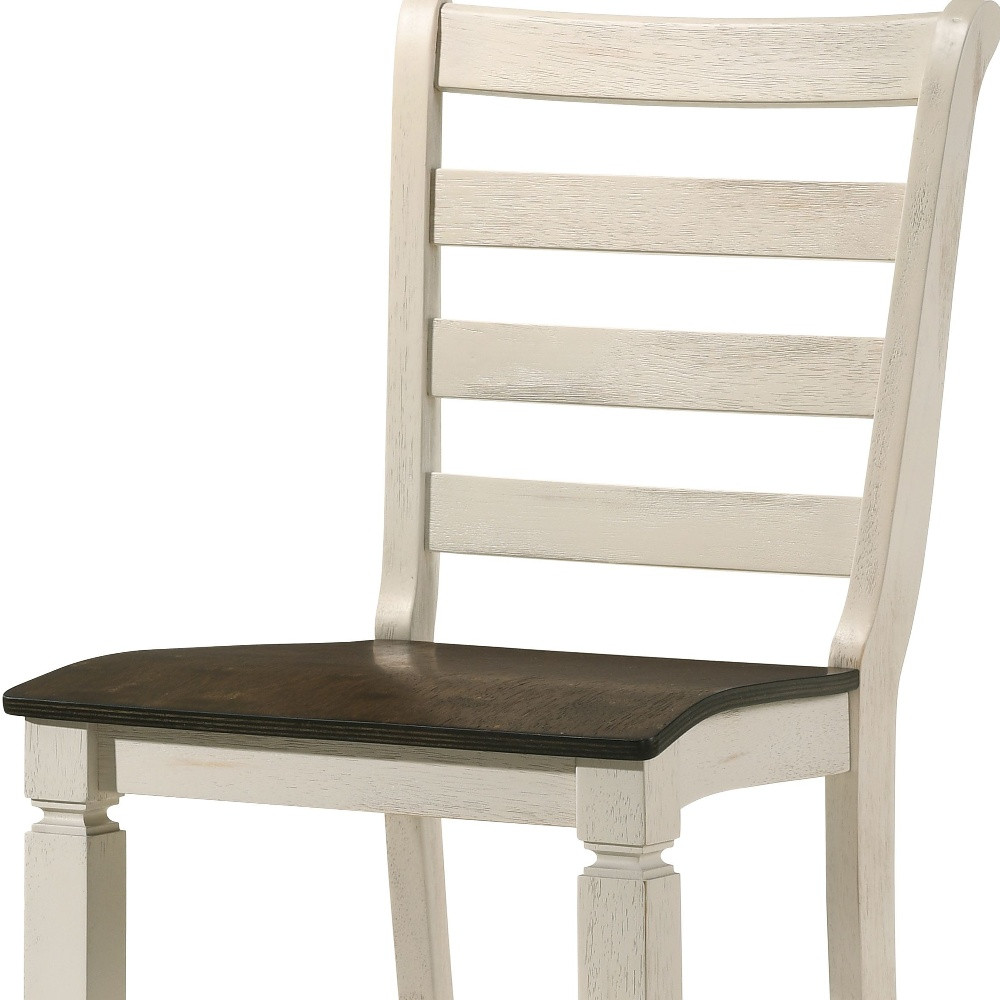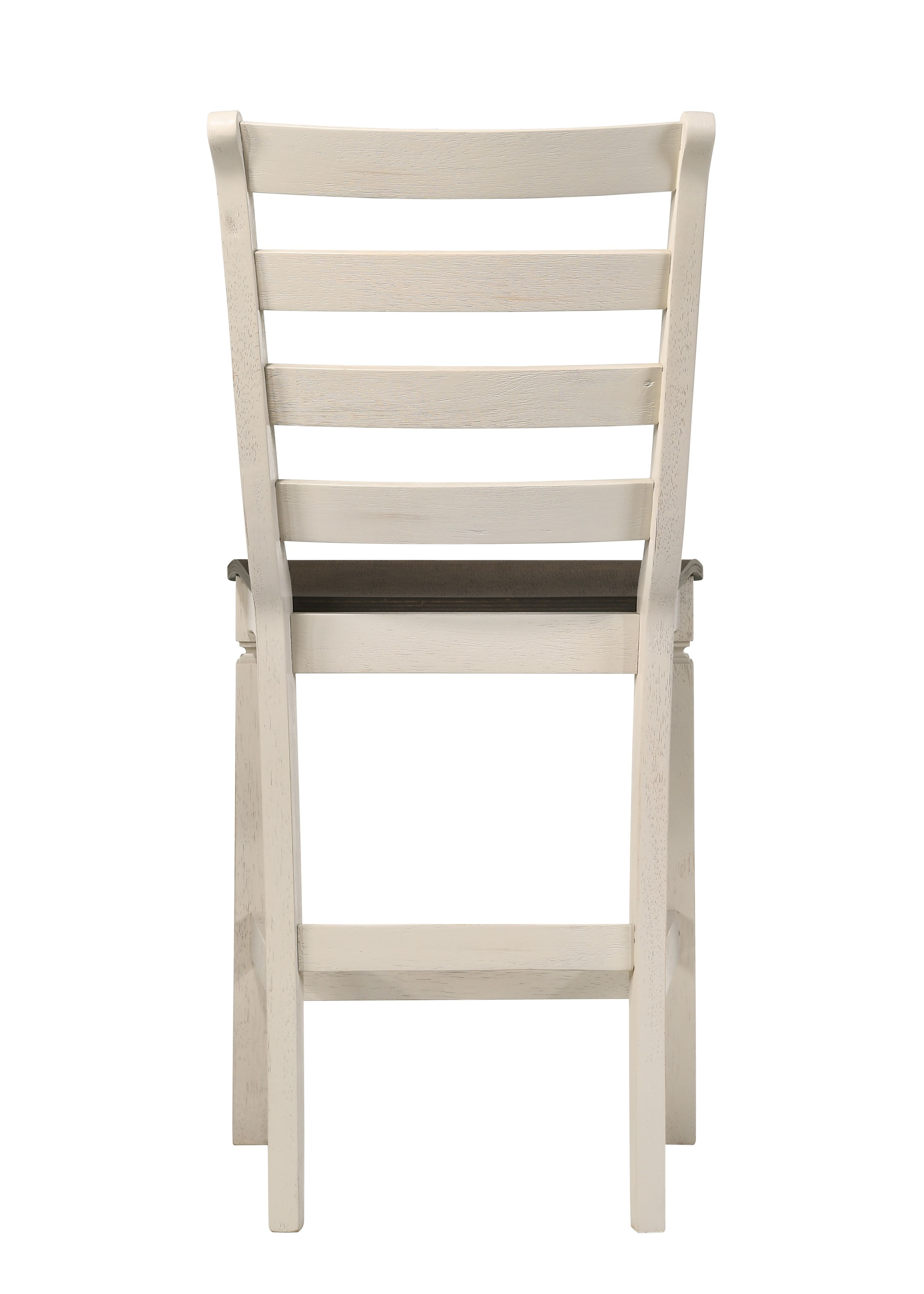With this set of two 24-inch oak and antiqued white solid wood counter height bar chairs you can add design and extra seating to your space. The square seat style provides a modern touch, while the rubberwood construction ensures durability. Boasting a transitional style, these chairs effortlessly blend with various decor themes. The solid wood frame in an antiqued white color offers a charming aesthetic that enhances any room's ambiance, making them a perfect addition to your home. 42.00-inch h x 18.00-inch w x 18.00-inch d.