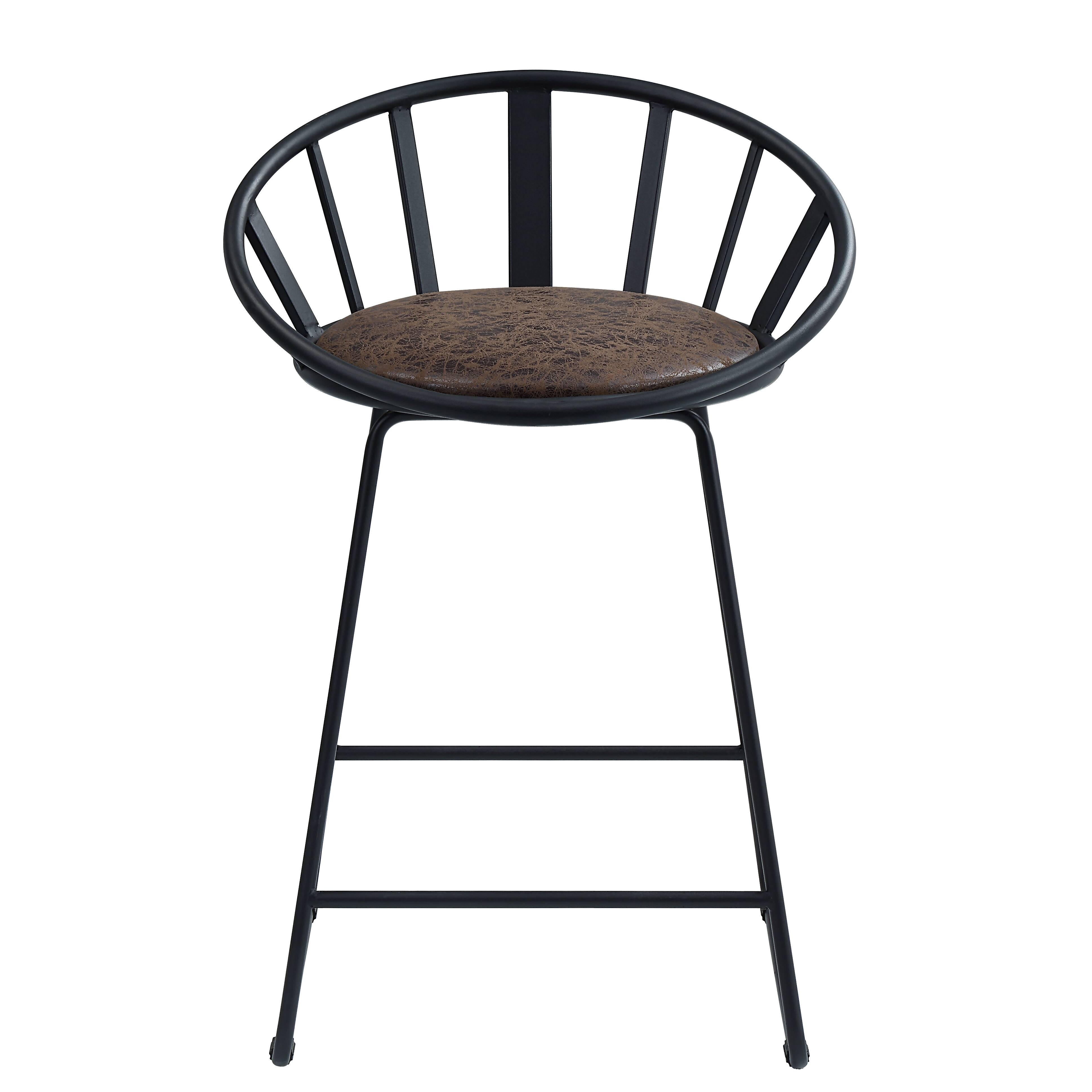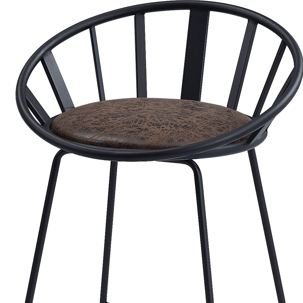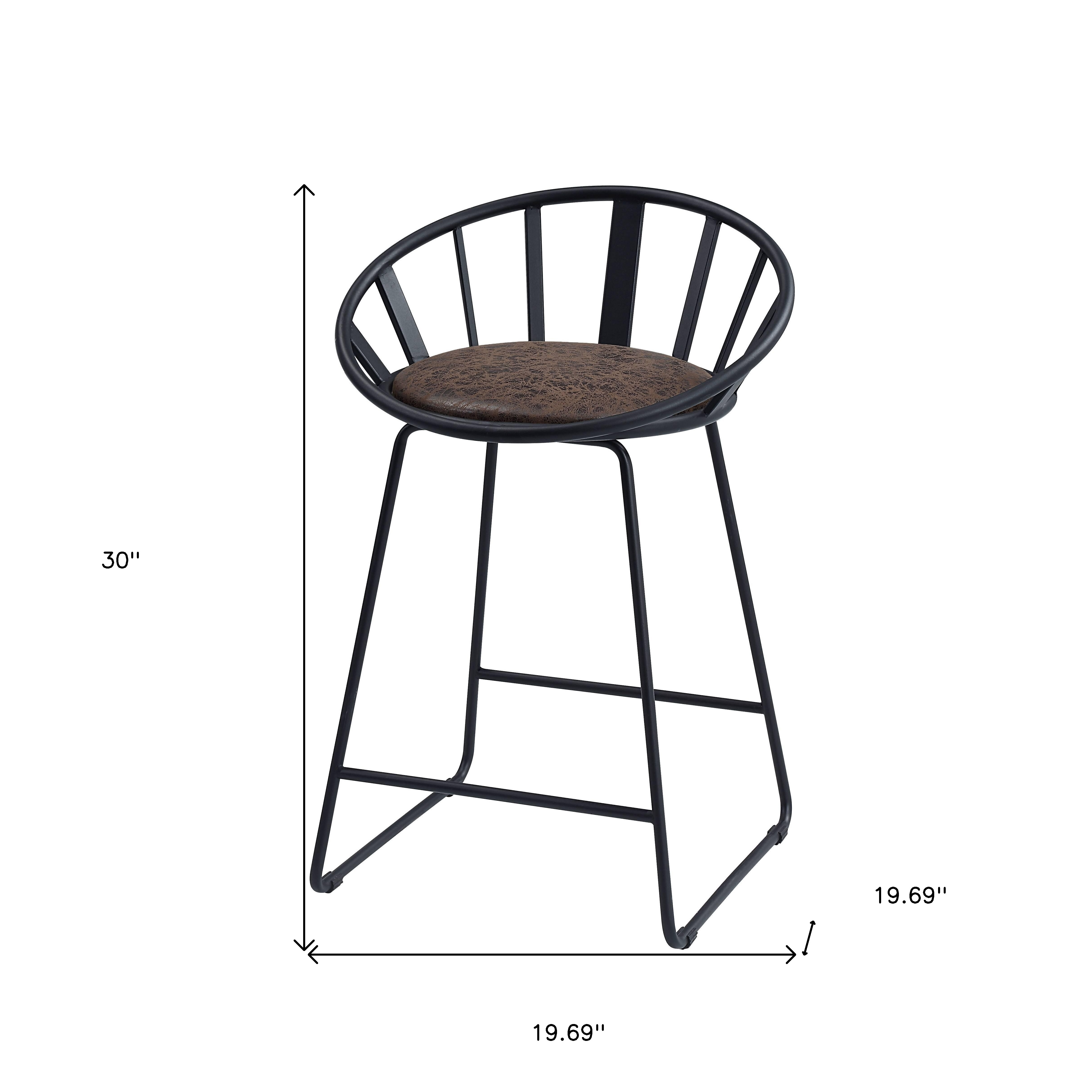 This set of two 23-inch brown and black faux leather and metal counter height bar chairs will be the perfect way to add some cool design and utility to your space similar to what you find in your favorite cafes or pubs. The chairs feature a round seat design that enhances comfort while maintaining a sleek look. Crafted with high-quality faux leather upholstery, they blend style and durability. The industrial aesthetic is accentuated by the striking black metal frame, providing a sturdy foundation for casual dining or social gatherings. Perfect for both modern and rustic spaces, these chairs will elevate your home decor effortlessly. 30.00-inch h x 19.69-inch w x 19.69-inch d.