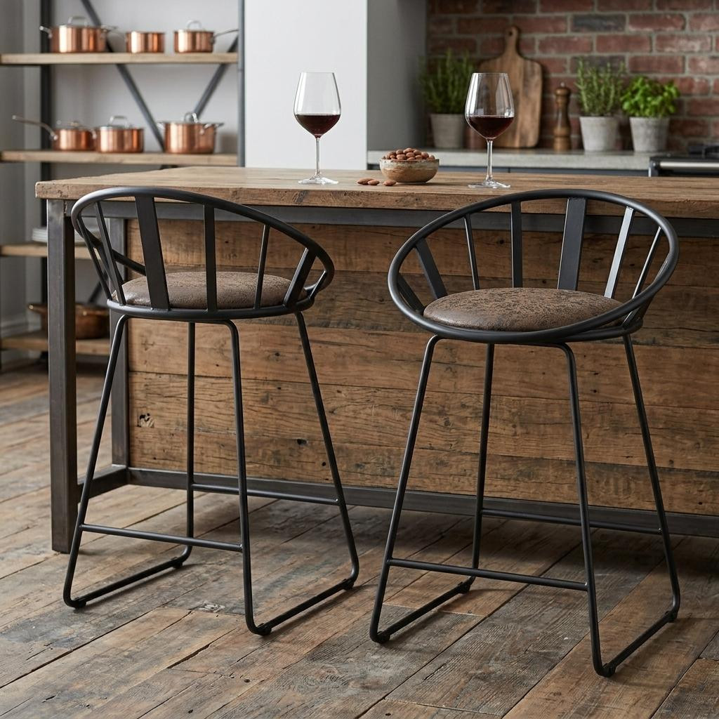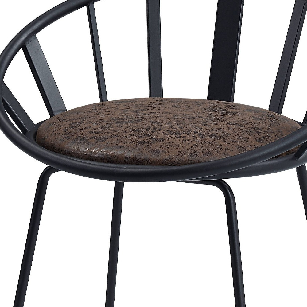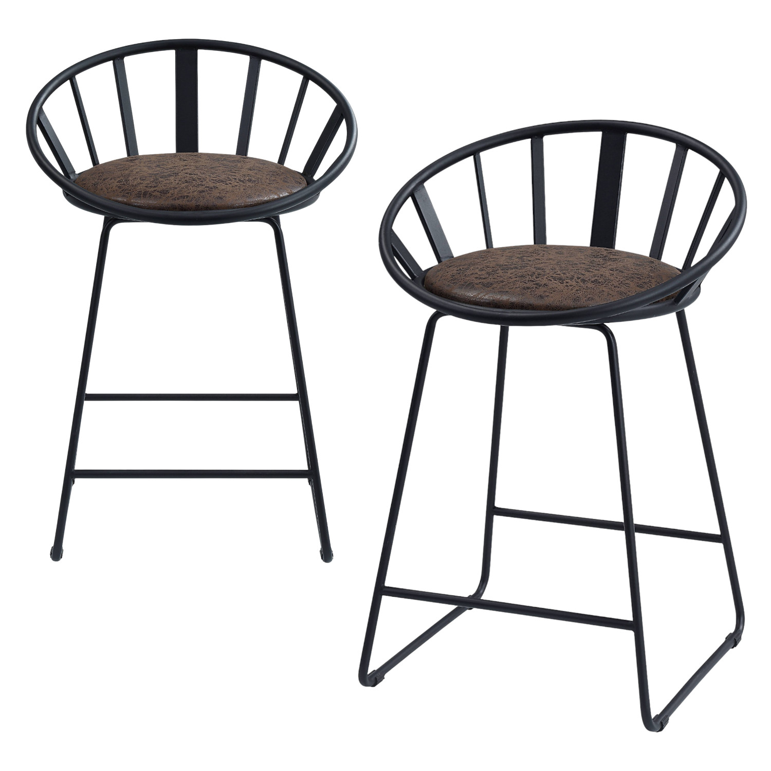 This set of two 23-inch brown and black faux leather and metal counter height bar chairs will be the perfect way to add some cool design and utility to your space similar to what you find in your favorite cafes or pubs. The chairs feature a round seat design that enhances comfort while maintaining a sleek look. Crafted with high-quality faux leather upholstery, they blend style and durability. The industrial aesthetic is accentuated by the striking black metal frame, providing a sturdy foundation for casual dining or social gatherings. Perfect for both modern and rustic spaces, these chairs will elevate your home decor effortlessly. 30.00-inch h x 19.69-inch w x 19.69-inch d.