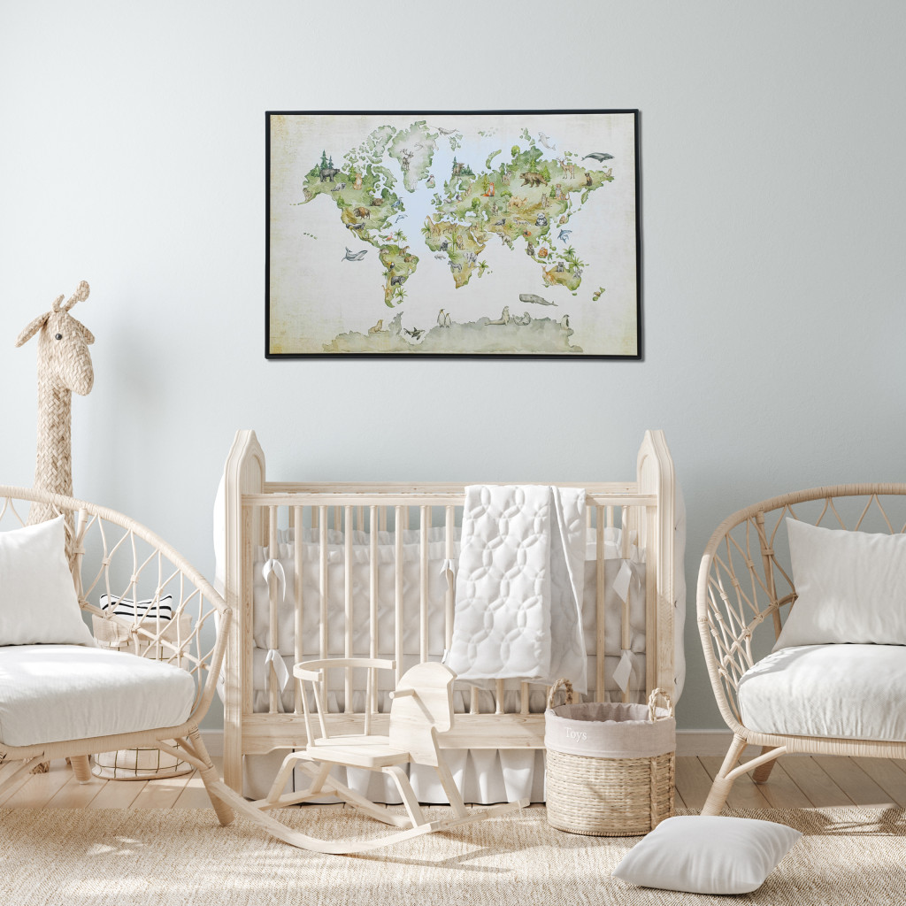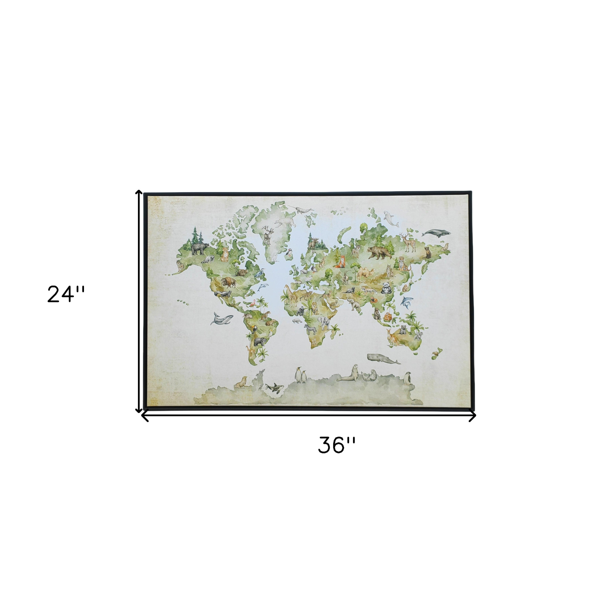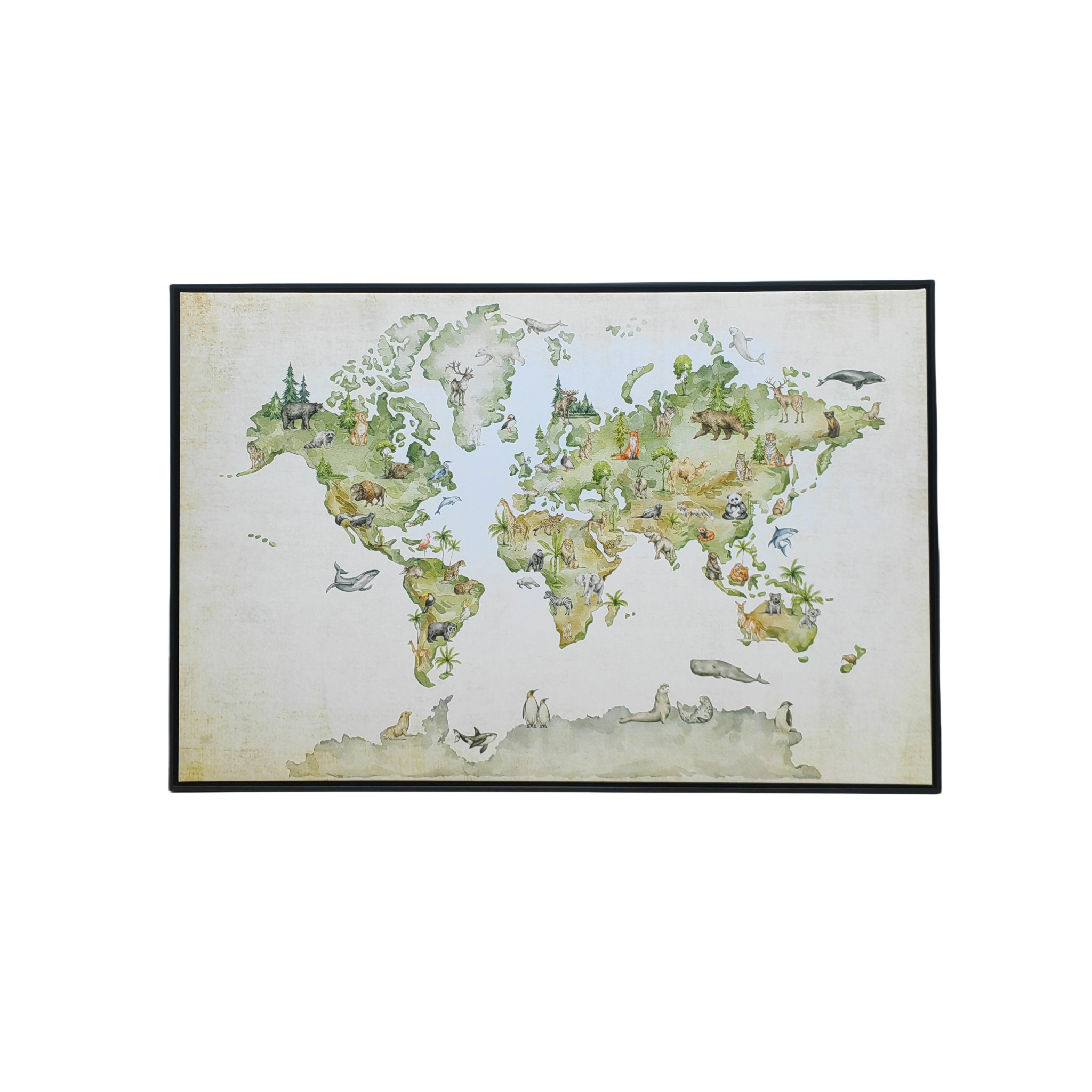 Unique and decorative, this animal world map black floater frame print wall art will leave a lasting impression. This watercolor print is a visual artistic expression that allows you to decorate your space in style. Reproduced for you on canvas, this hanging decorative accent will be a trendy and fashionable way to dress your walls. Featuring neutral colors and a slightly distressed finish, this educational and exciting art will be great to hang in a living room, den, office, child's bedroom, playroom, or nursery. 24-inch h x 36-inch w x 1.37-inch d.
