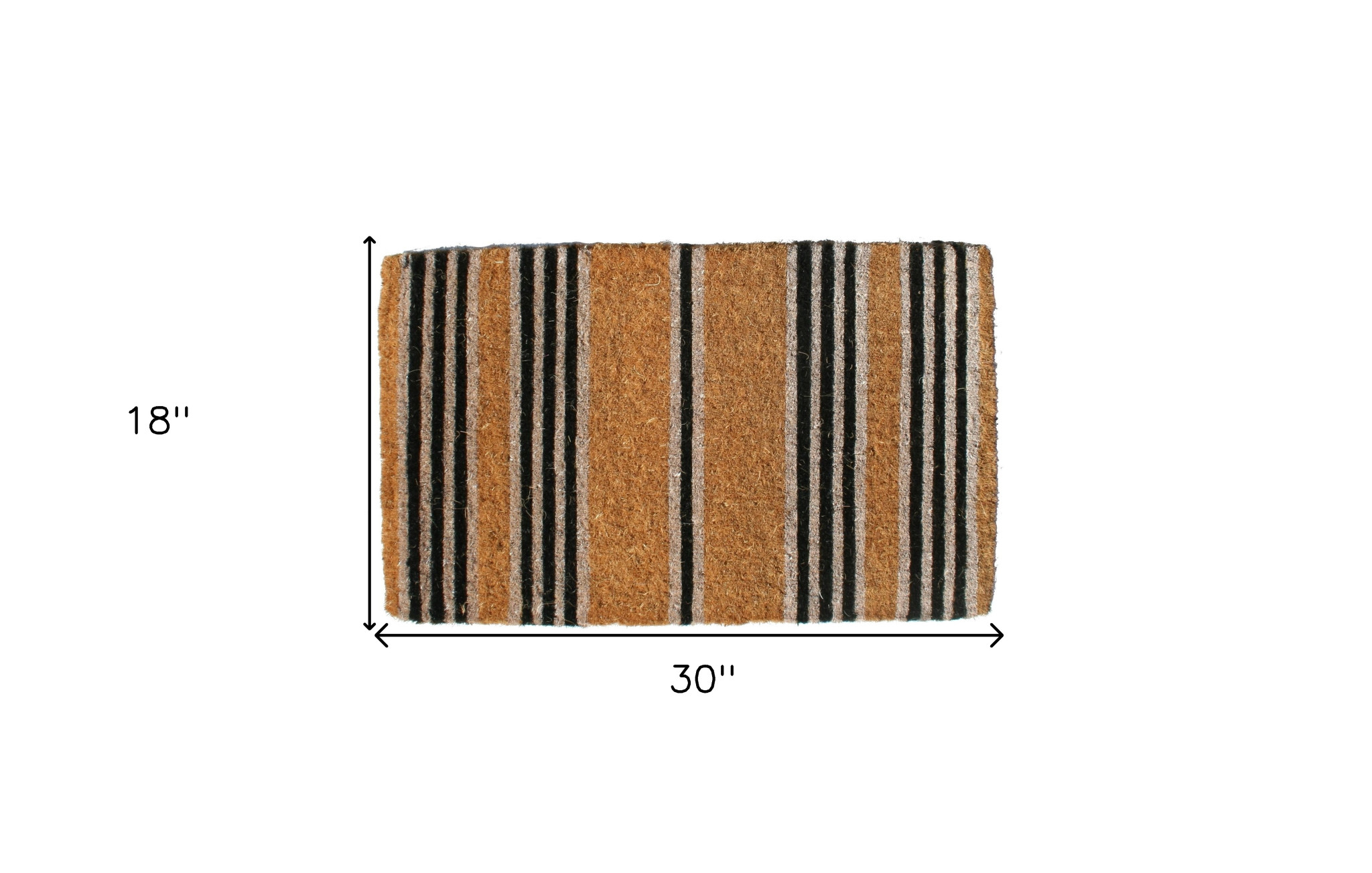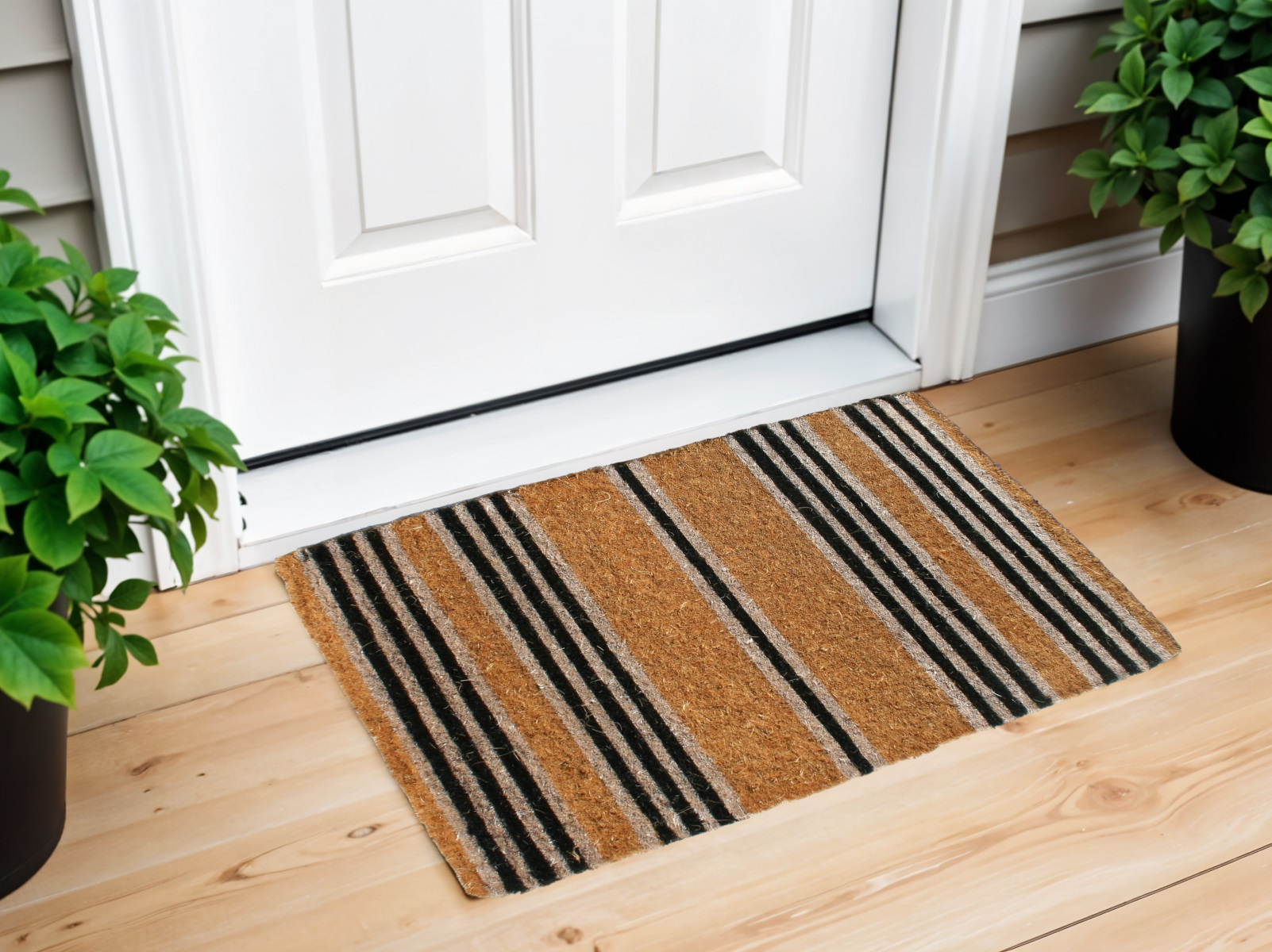Known for it's extreme durability and ability to withstand heavy foot traffic, this 18-inch x 30-inch brown and black coir striped outdoor door mat is an ideal option for the front door or entrance way of your home or business. Crafted from coconut husks, this mat is not only functional but is an an eco-friendly and visually appealing accessory. The naturally bristled texture of coir is an efficient way to clean dirt and mud from shoes and is easy to clean and maintain. Add this decorative mat to create a practical yet inviting welcome to all who enter. 18-inch H x 30-inch W x 1.5-inch D