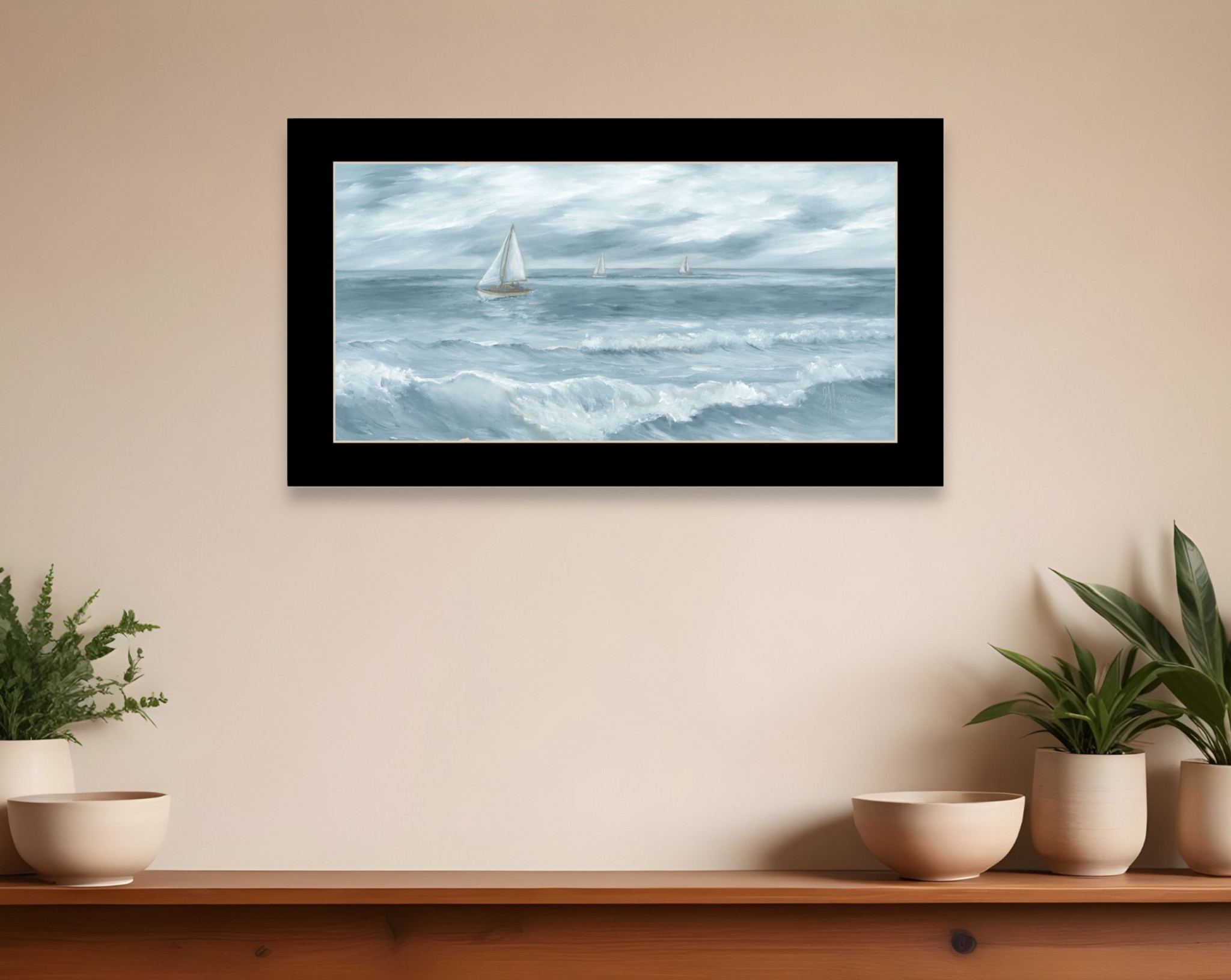 Add an air of fashion to your room and rejuvenate the space with this three sailboats ocean scene black framed wall art. This acrylic painting is a way to express your artistic style and add some fashion to your walls. Reproduced for you on paper, this hanging decorative accent will be a trendy and fashionable way to dress your walls. Adding this hanging wall art to your space to make your room feel more finished and attractive. Utilize this opportunity to create a focal point in the room with this fabulous wall decor option. 15-inch h x 27-inch w x 1-inch d.