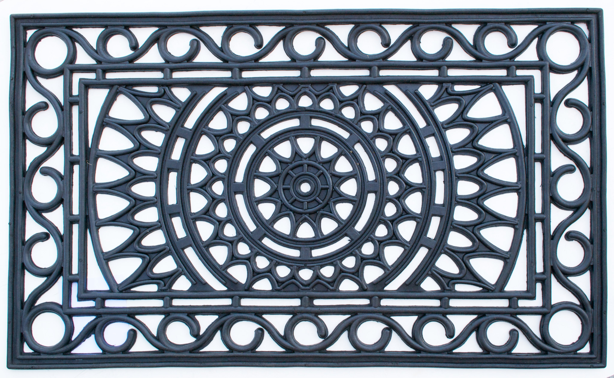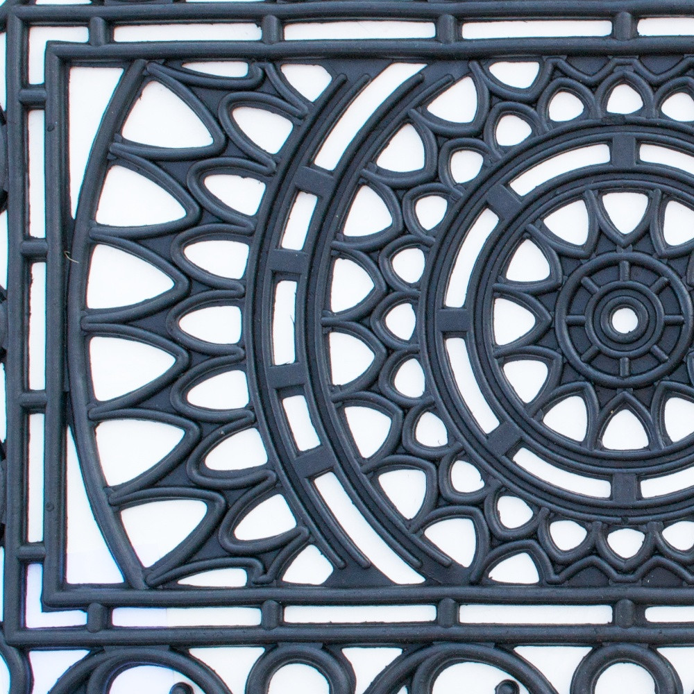 Ready to withstand heavy foot traffic, this 18-inch x 30-inch black rubber outdoor door mat is an ideal option for the front door or entrance way of your home or business. Crafted from rubber, this mat is not only functional but is a visually appealing accessory to welcome people to your home or business. Add this decorative mat to create a practical yet inviting welcome to all who enter. 18-inch H x 30-inch W x 0.5-inch D