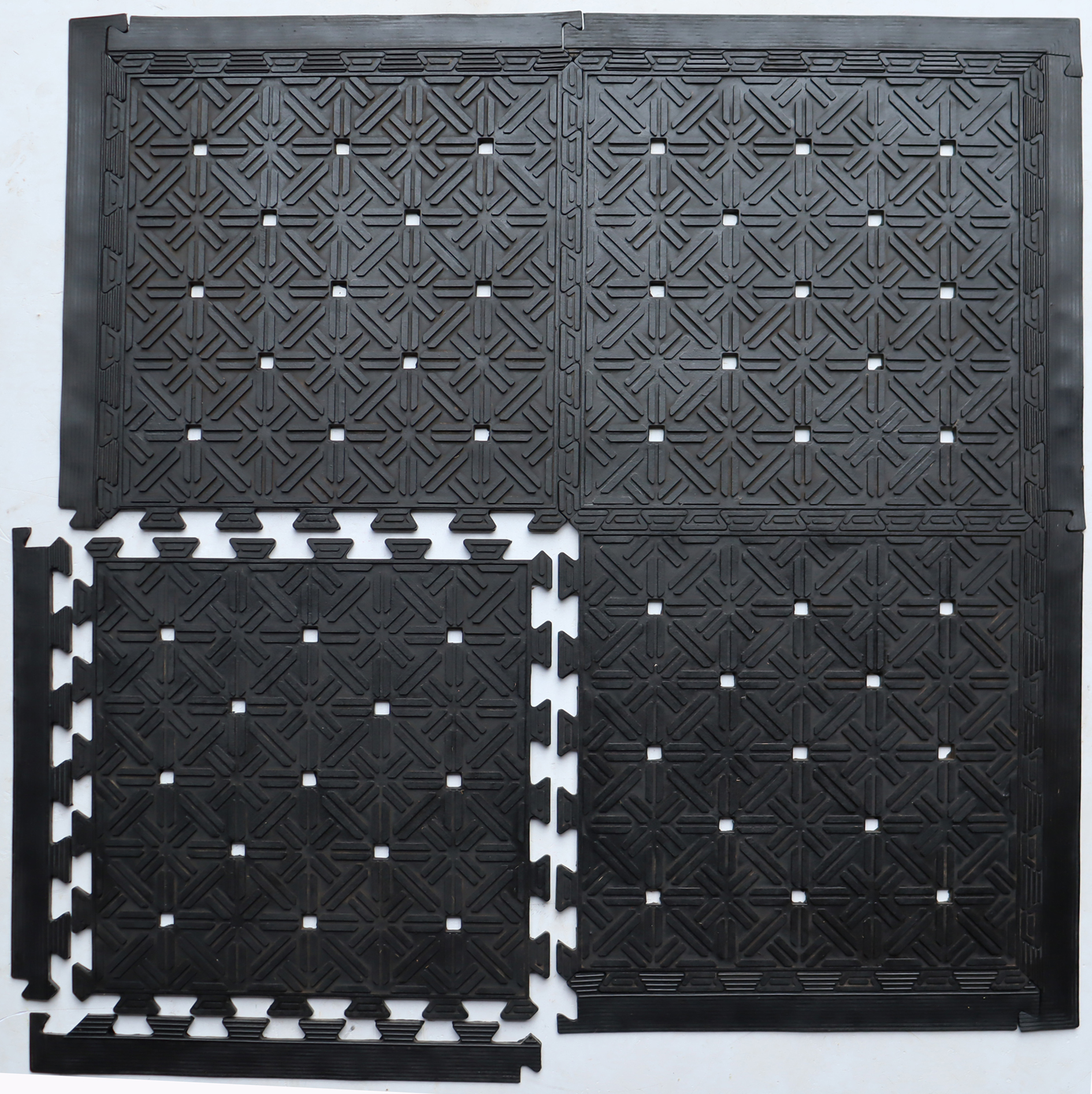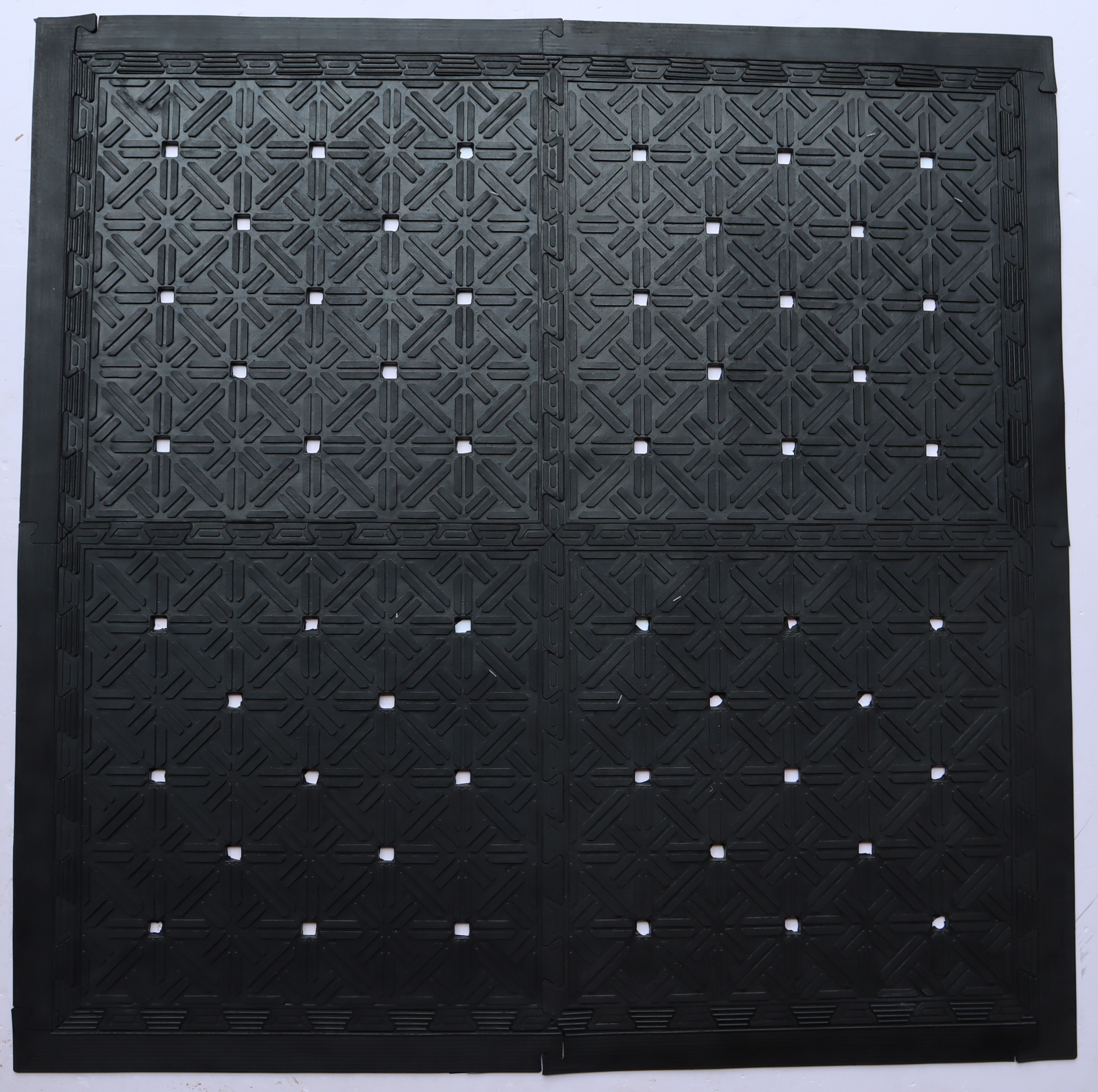 Ready to withstand heavy foot traffic, this set of four square interlocking black rubber indoor outdoor mats is an ideal option for the front door or entrance way of your home or business. Crafted from rubber, this mat features four interlocking 18-inch squares with edging that combine to make a 36-inch square mat. Can be combined with additional squares to cover a larger surface area. Durable, water, and weather resistant. 18-inch H x 18-inch W x 0.25-inch D