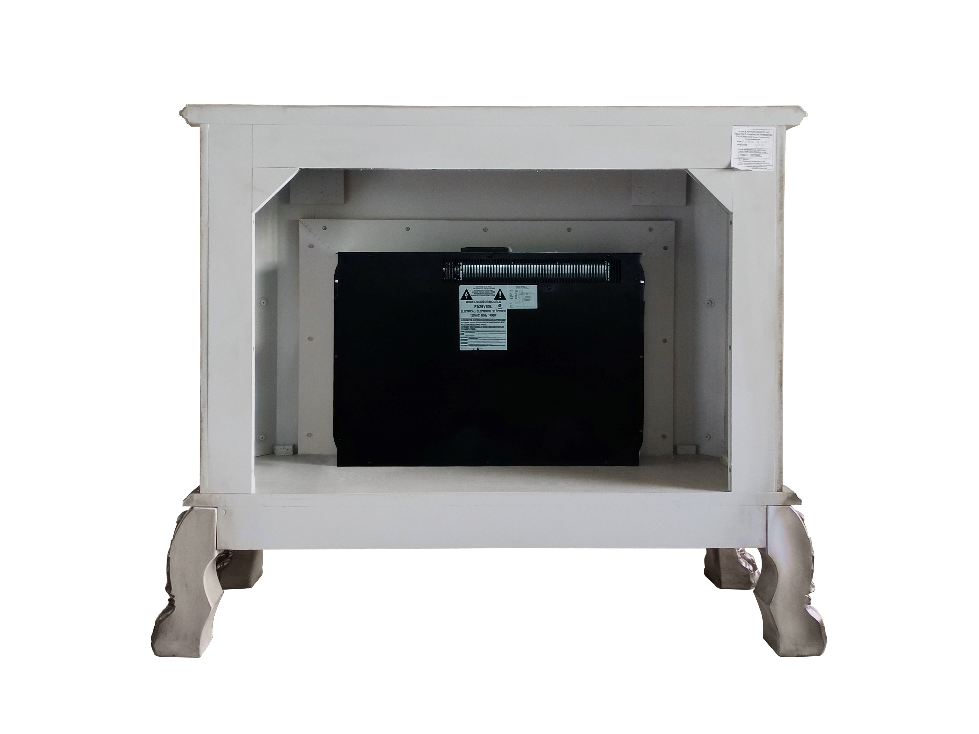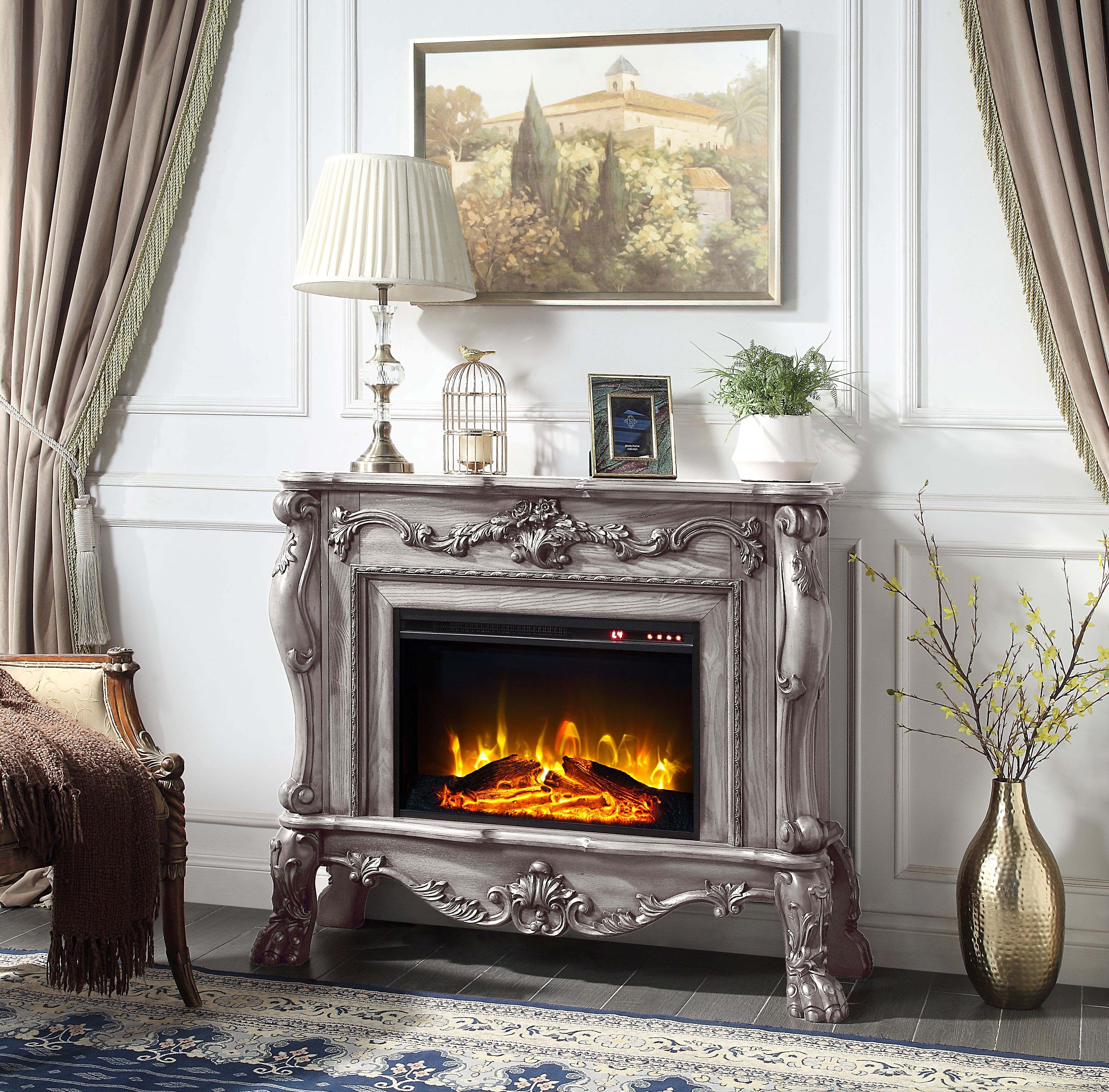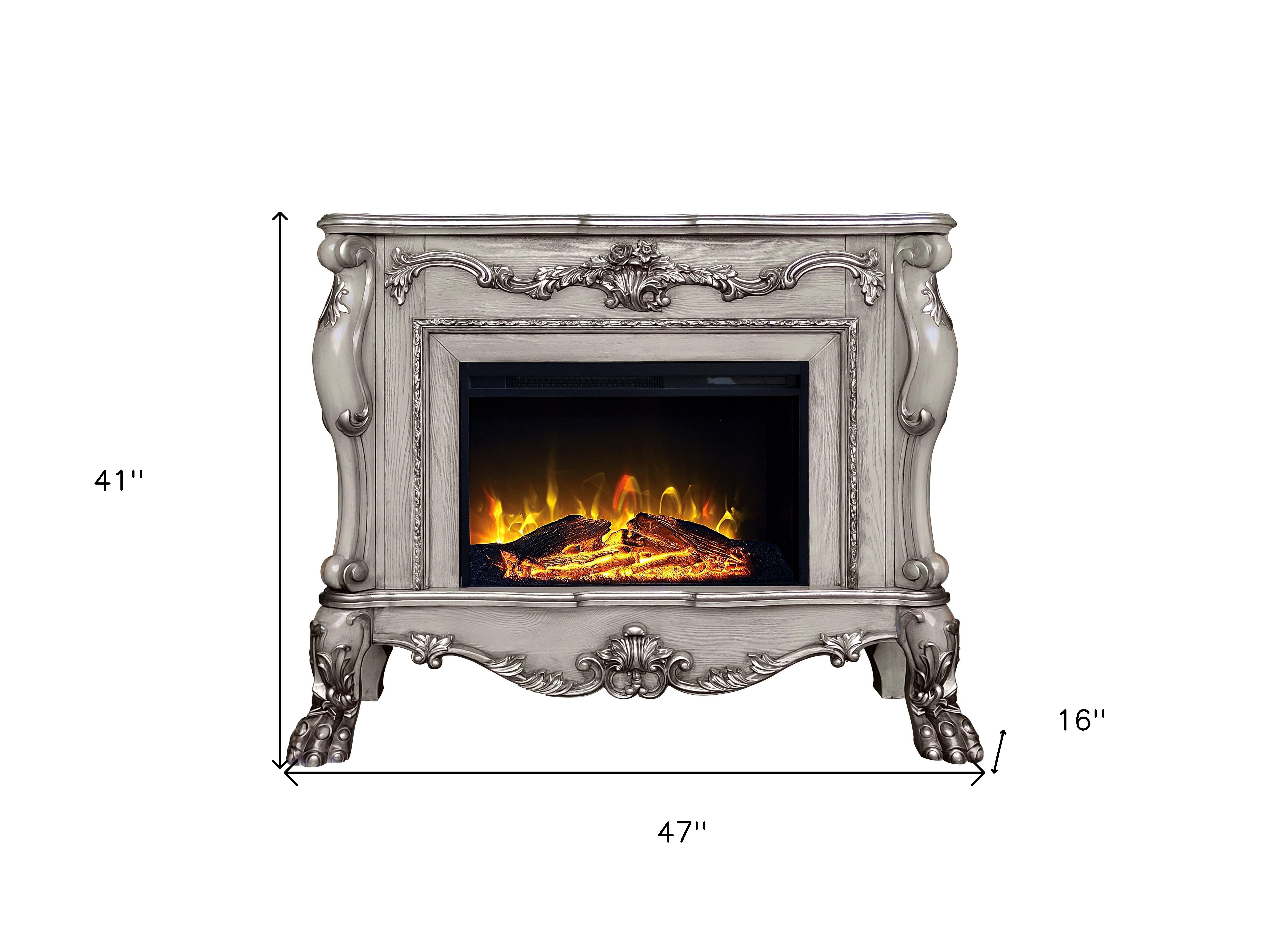 The 47-inch bone electric wood free standing fireplace combines style and functionality for a cozy atmosphere. Crafted from high-quality manufactured wood, this fireplace features a beautifully carved and detailed mantle and claw feet that showcases an antiqued bone finish that complements various decor styles. The electric feature provides the warmth of a fire without the hassle of logs or ashes, ensuring a clean and safe experience. Enjoy the ambiance and comfort it brings, perfect for family gatherings or quiet nights in. With its elegant appearance and practical functionality, this fireplace is sure to impress guests and create lasting memories in your home. 41-inch h x 47-inch w x 16-inch d.