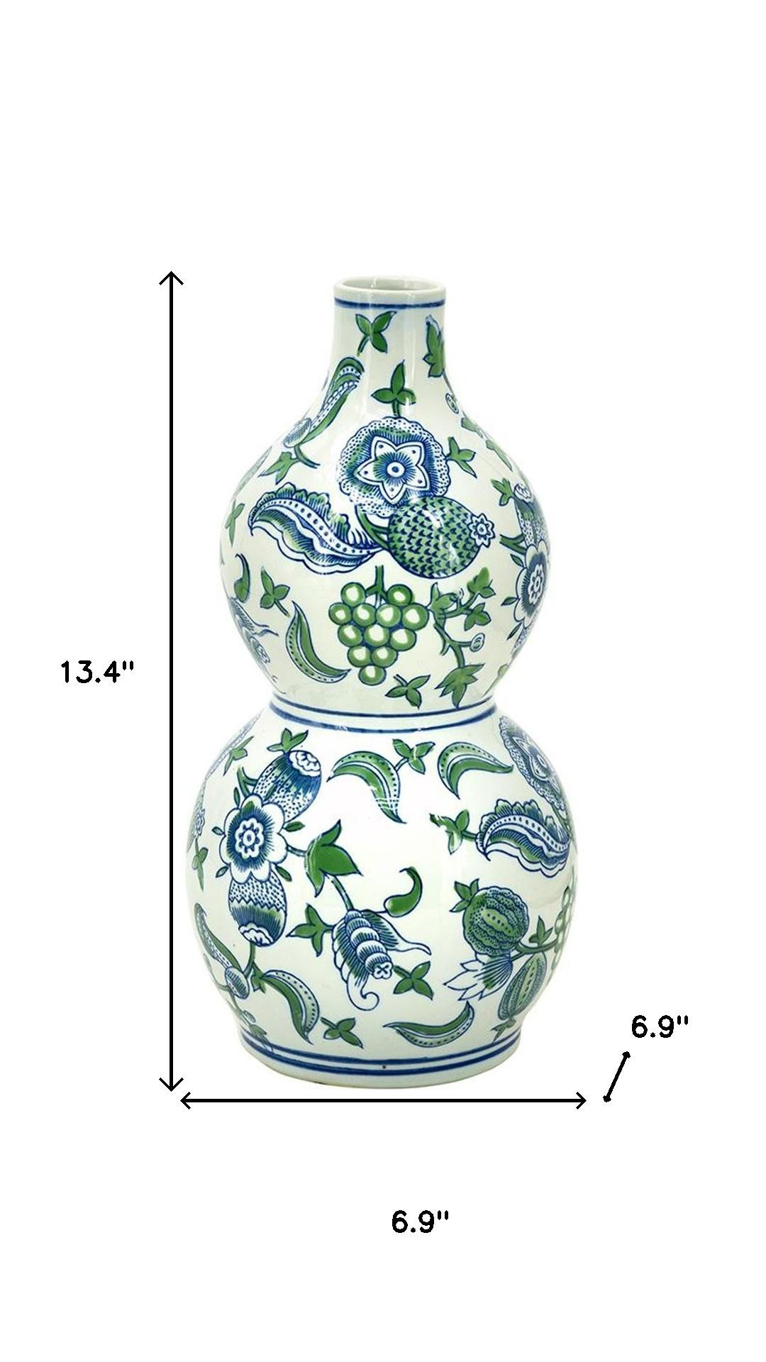 The 13-inch white blue and green floral porcelain table vase is a stunning addition to any home decor. This unique curvaceous and wavy gourd shaped vase showcases a beautiful chinoiserie cherry blossom floral pattern in captivating shades of blue and green, making it a perfect centerpiece for your dining or living area. Crafted from high-quality porcelain, it combines durability with elegance, ensuring it stands out in any setting. Its traditional style adds a touch of timeless charm, seamlessly blending with various interior themes. This versatile table vase can elegantly display fresh flowers or serve as an eye-catching standalone piece, enhancing the overall aesthetic of your space. 13.4-inch h x 6.9-inch w x 6.9-inch d.