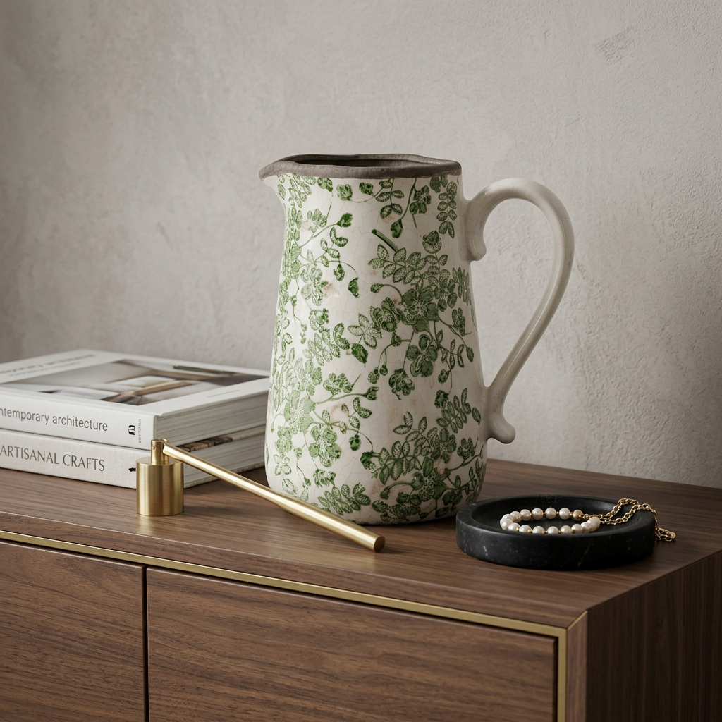 With or without flowers, this 9-inch green and white leaf ceramic round jug vase makes a great gift or decorative accent for your space. Crafted from durable ceramic, this jug vase showcases a beautiful round shape that complements any decor style. The elegant leaf design adds a touch of nature-inspired charm, making it perfect for showcasing fresh blooms or as a standalone piece. Its versatile aesthetic ensures it fits seamlessly into both modern and traditional interiors. Ideal for brightening up your living room, dining area, or entryway, this vase is sure to enhance your home with a touch of sophistication. 9.10-inch h x 8.10-inch w x 5.70-inch d.