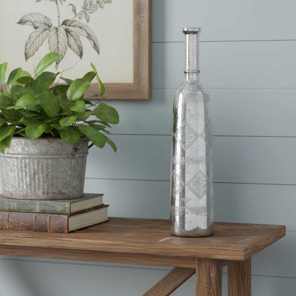With or without flowers, this 30-inch antiqued silver floral glass bottle table vase makes a great gift or decorative accent for your space. The unique shape adds a soft elegance that complements any decor style. Crafted from high-quality glass, it showcases a stunning etched design that catches the light beautifully. The purposeful coat and paint distressing gives it a vintage charm, making it a unique piece in your home. Perfect for displaying your favorite blooms or as a standalone statement piece, this vase enhances the overall aesthetic of your living area or office effortlessly. 29.90-inch h x 5.90-inch w x 5.90-inch d.
