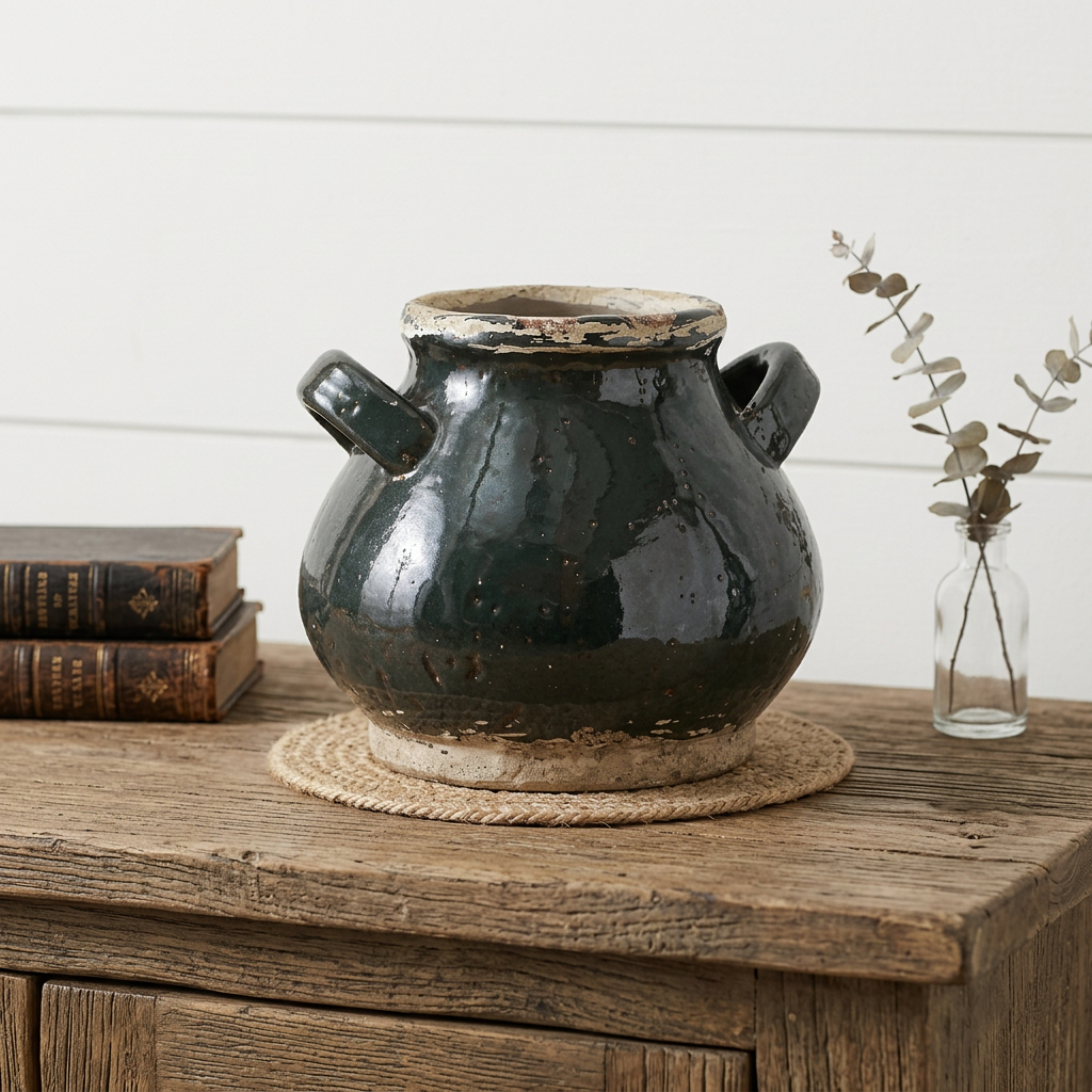 Get ready to accent your space in style with this 7-inch dark green and sand terracotta round jug vase. This unique jug vase boasts a round shape that enhances any floral arrangement. The purposeful distressing adds character and charm, creating a rustic appeal for your home decor. Hand-painted details ensure that each piece carries its own individuality, making it a perfect addition to your collection. Made from durable terracotta, this vase is designed not only for beauty but for longevity as well. Whether displayed on a shelf or used as a centerpiece, it effortlessly enhances the aesthetic of any room. 6.70-inch h x 9.40-inch w x 9.40-inch d.