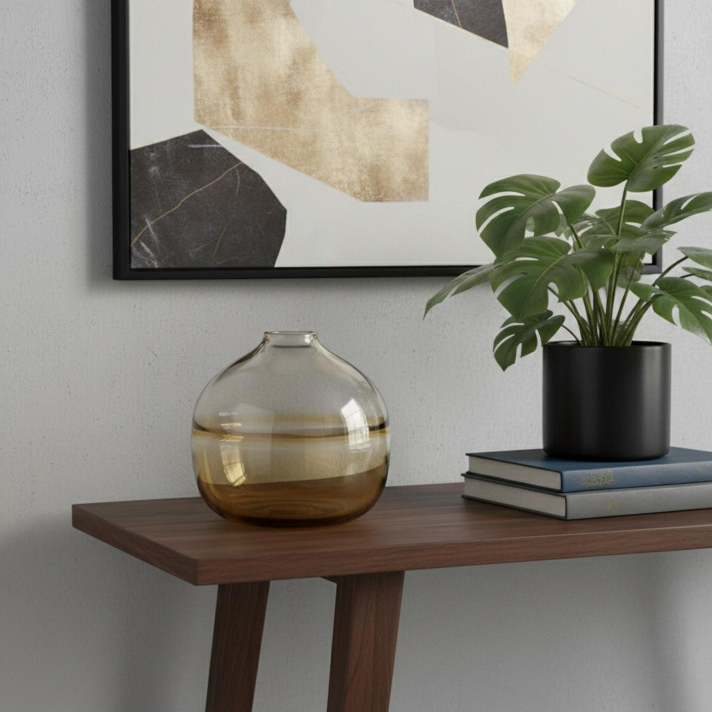 Get ready to accent your space in style with this 9-inch clear and brown ombre glass round table vase. Featuring a beautiful round shape, this vase effortlessly enhances the elegance of your decor. Crafted from high-quality glass, it provides a sleek and modern touch that complements any environment. Its unique ombre design adds depth and character, making it a striking centerpiece for your table. Perfect for showcasing fresh flowers or as a standalone decorative piece, this vase offers versatility in styling. Bring an artistic flair to your home with this stunning addition that combines functionality with aesthetic appeal. 8.50-inch h x 8.70-inch w x 8.70-inch d.