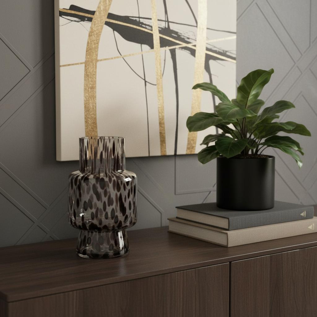 Get ready to accent your space in style with this 10-inch amber and clear abstract glass cylinder table vase. Crafted from high-quality glass, this table vase showcases a captivating blend of amber and clear hues that can complement any decor theme. Its unique cylinder shape adds a modern touch while providing ample space for your favorite floral arrangements or decorative fillers. This versatile piece serves as both a striking centerpiece and an elegant addition to shelves or tabletops. Enhance your home with the perfect balance of artistry and functionality, making it a delightful addition to your living space. 10.00-inch h x 5.90-inch w x 5.90-inch d.
