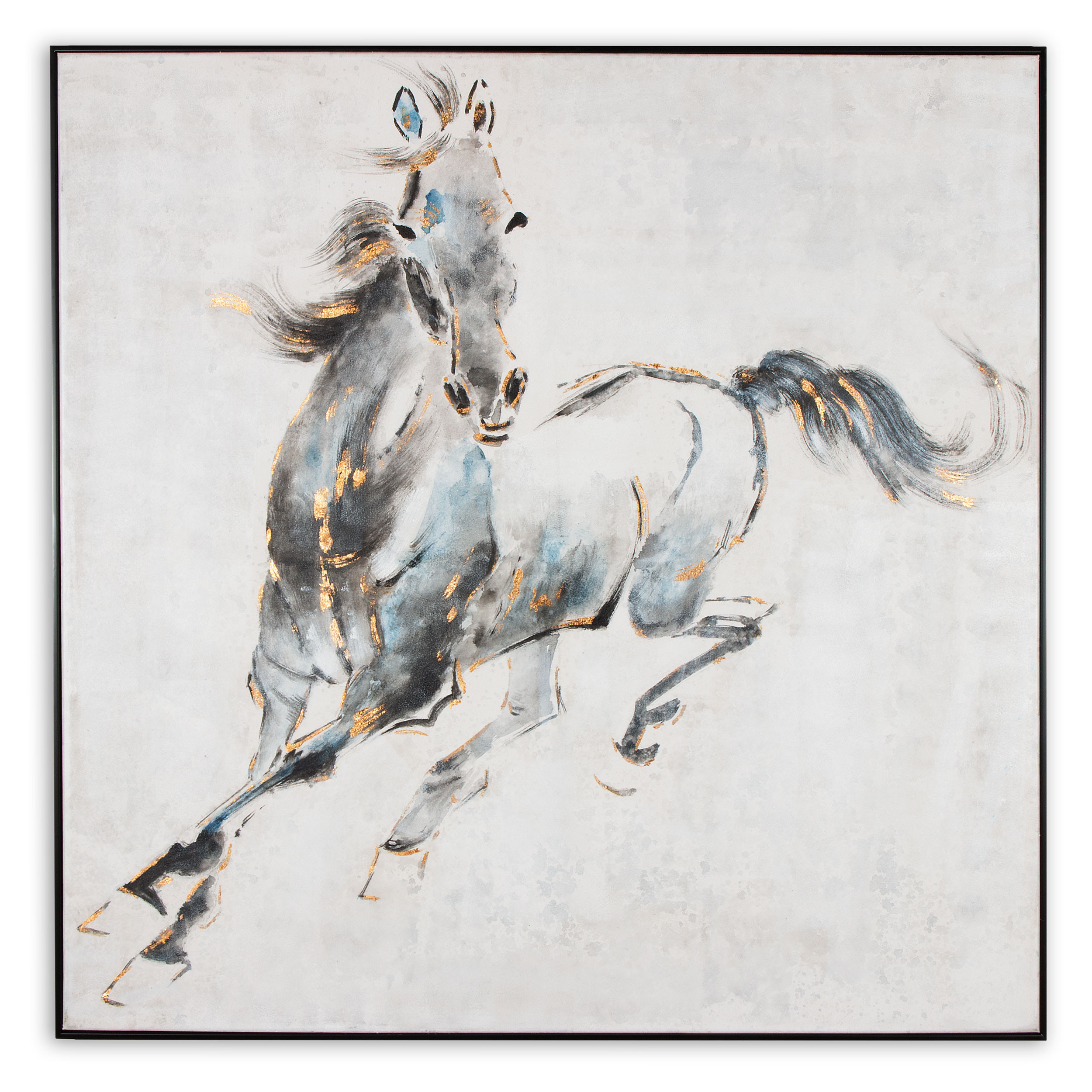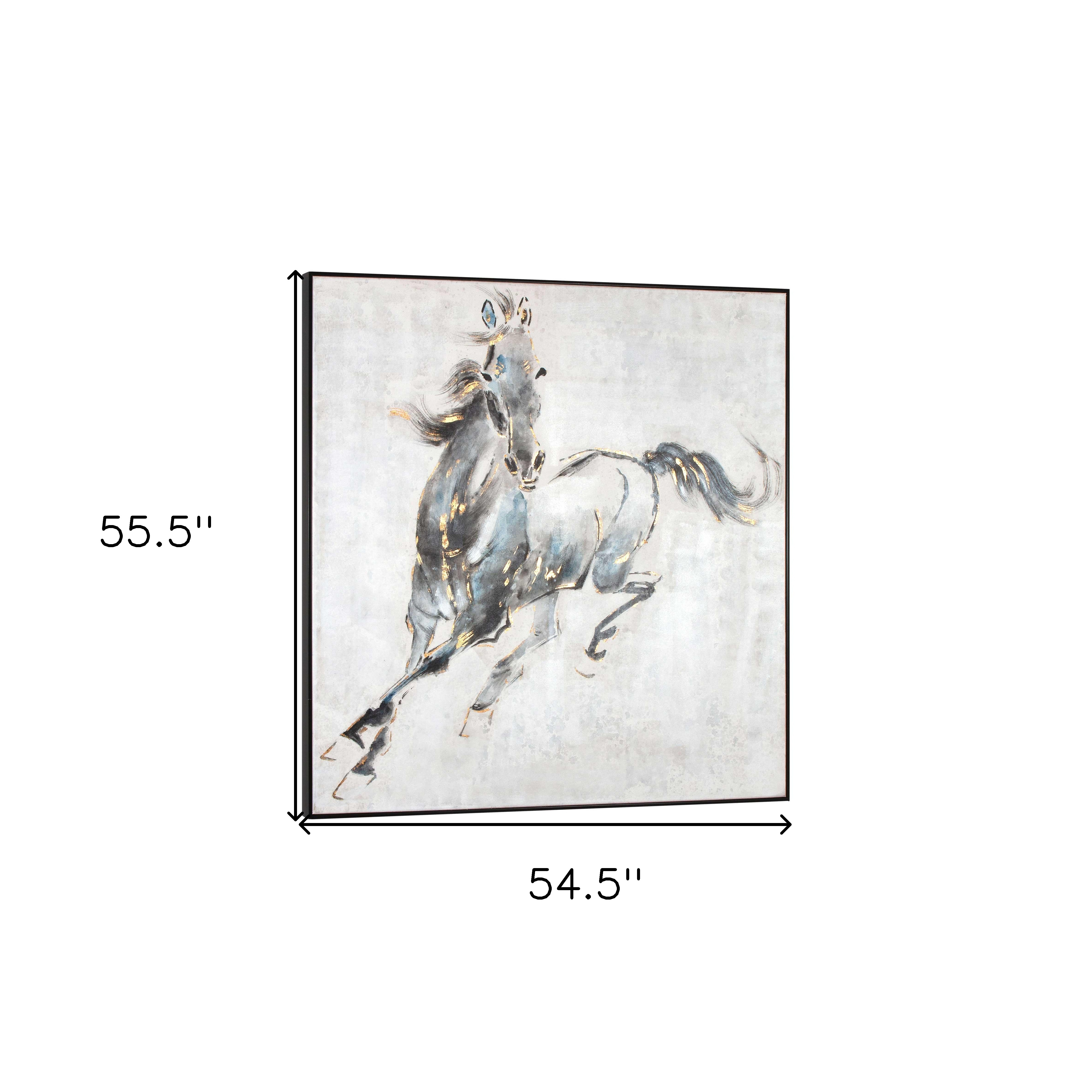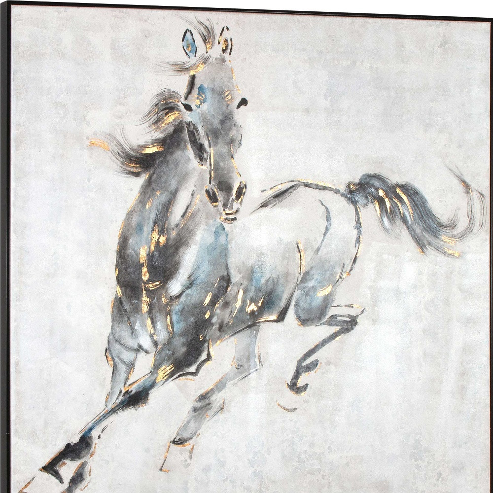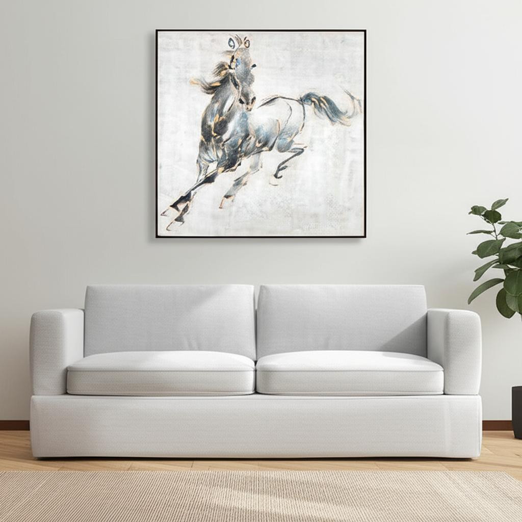 This prancing stallion black floater frame painting wall art will add a beautiful decorative accent to your decor. Bring a little bit of the farm indoors when you hang this horse artwork. Not a print, this fabulous work of art is truly hand-painted. Reproduced for you on canvas, this hanging decorative accent will be a trendy and fashionable way to dress your walls. Adding this hanging wall art to your space to make your room feel more finished and attractive. Utilize this opportunity to create a focal point in the room with this fabulous wall decor option. 54.5-inch h x 55.5-inch w x 3.5-inch d.