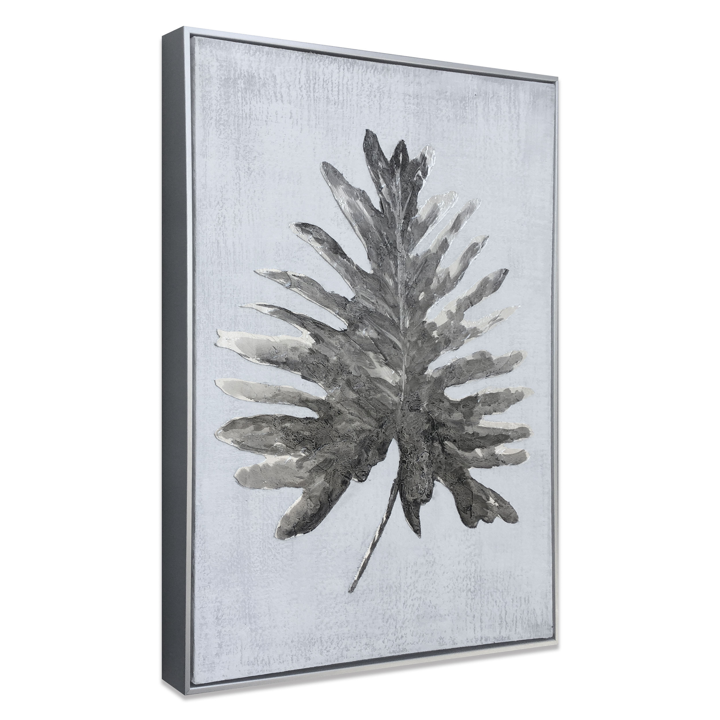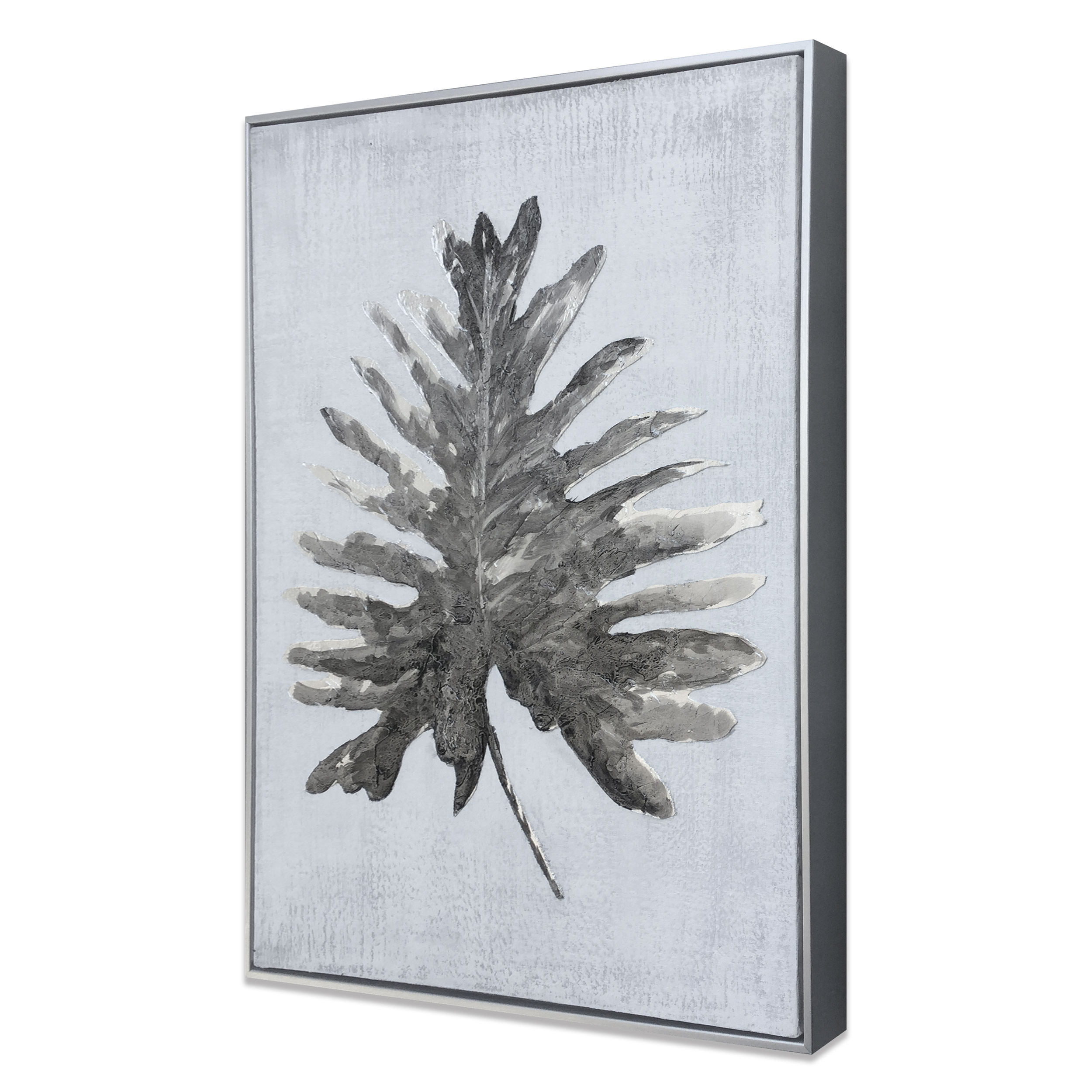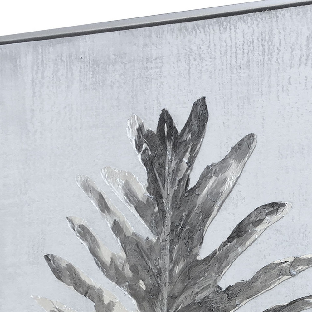 Add an air of fashion to your room and rejuvenate the space with this silver jungle i hand painted silver floater frame wall art. Not a print, this fabulous work of art is truly hand-painted. Reproduced for you on canvas, this hanging decorative accent will be a trendy and fashionable way to dress your walls. Adding this hanging wall art to your space to make your room feel more finished and attractive. Utilize this opportunity to create a focal point in the room with this fabulous wall decor option. 33-inch h x 26-inch w x 3-inch d.