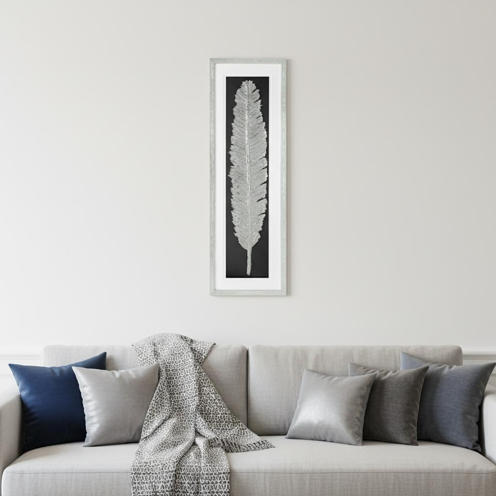 Add an air of fashion to your room and rejuvenate the space with this metallic feather silver shadowbox textual art wall art. This graphic art is a way to express your artistic style and add some fashion to your walls. Reproduced for you on paper, this hanging decorative accent will be a trendy and fashionable way to dress your walls. Hang on your wall to add some up to date fashion and decoration. Instantly liven up your space with this art that brings color and dimension to your walls. 50.5-inch h x 19.5-inch w x 4.5-inch d.