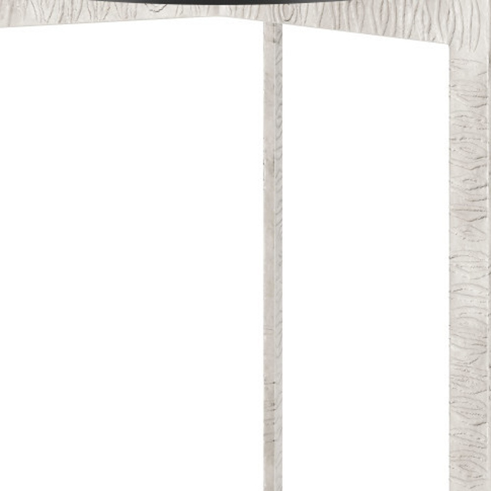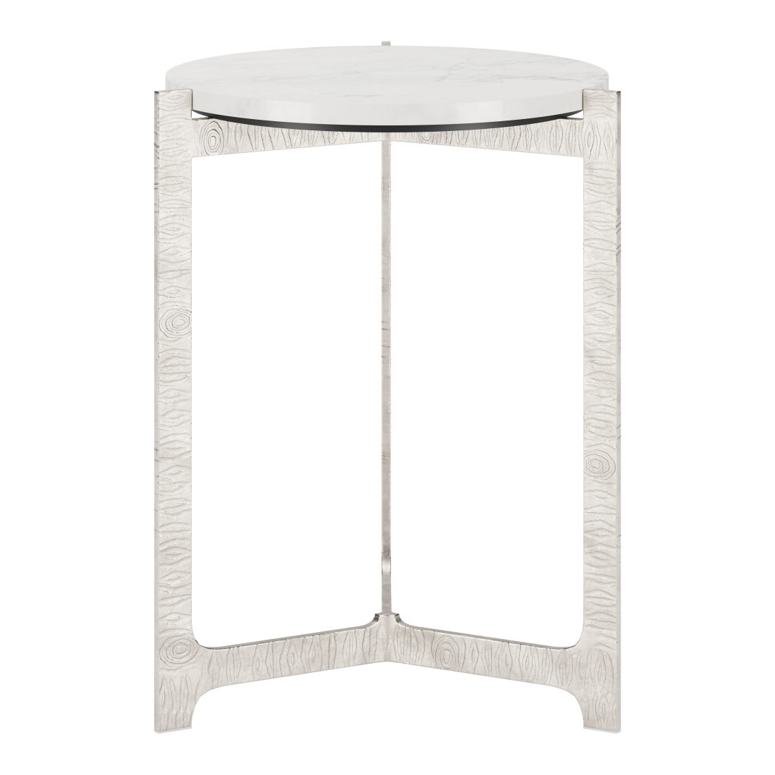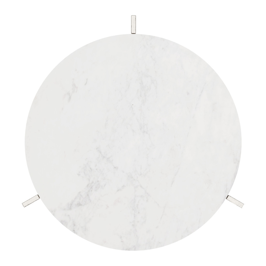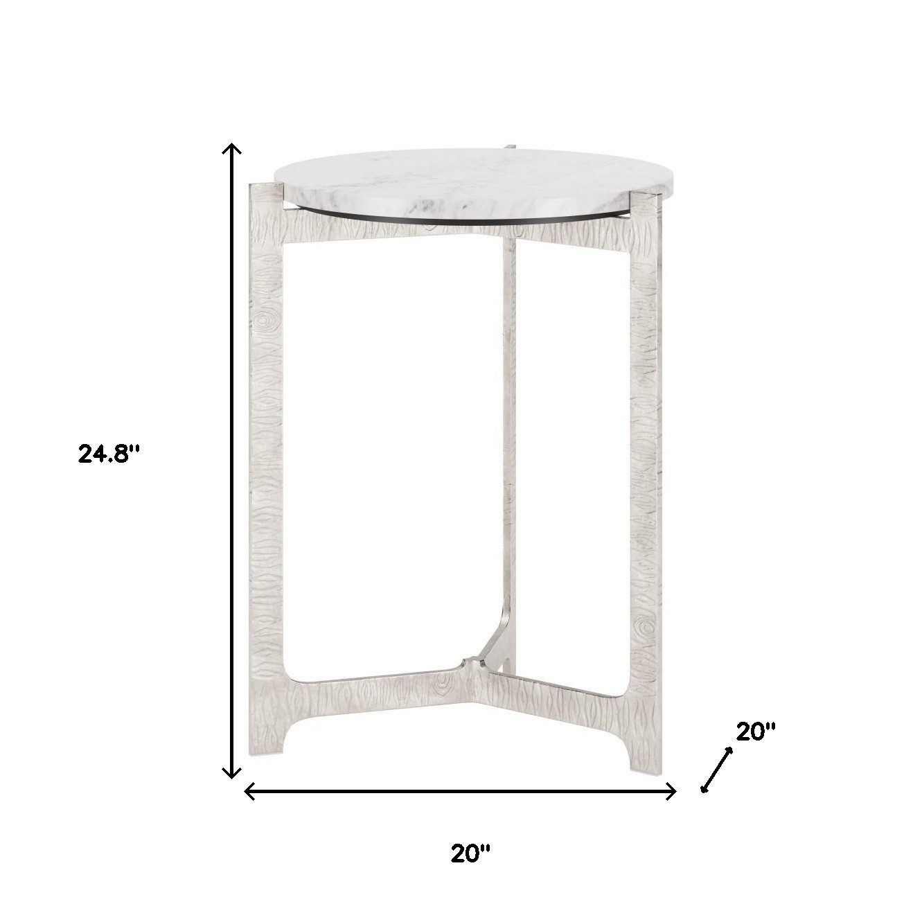 Distinctive in style the 25-inch white and silver marble and aluminum round cross legs end table radiates a versatile charm. Quality construction from the silver aluminum base combines with white marble of the top to give this table a fresh and updated look. An ideal location for placing your snacks and drinks, and a place to keep your lamp, frames, or other accessories. This versatile table is a great accent for most any room. 24.8-inch h x 20-inch w x 20-inch d.