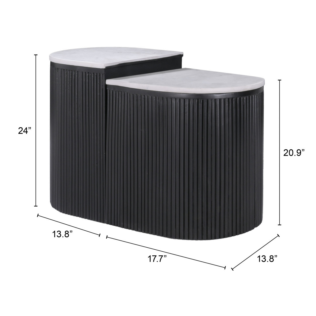 Increase your decorating options with this set of two white and black marble and solid wood oval block end tables that will enhance your space. This pair makes the ideal companion for sofa or bed and can be used apart but designed to create a unique table setting when pushed together. The black solid wood frames features textural line detailing and are finished off with a white marble top that is the epitome of quality construction and design. This sleek and modern table makes a practical and unique accent. 20.9-inch h x 18-inch w x 14-inch d.
