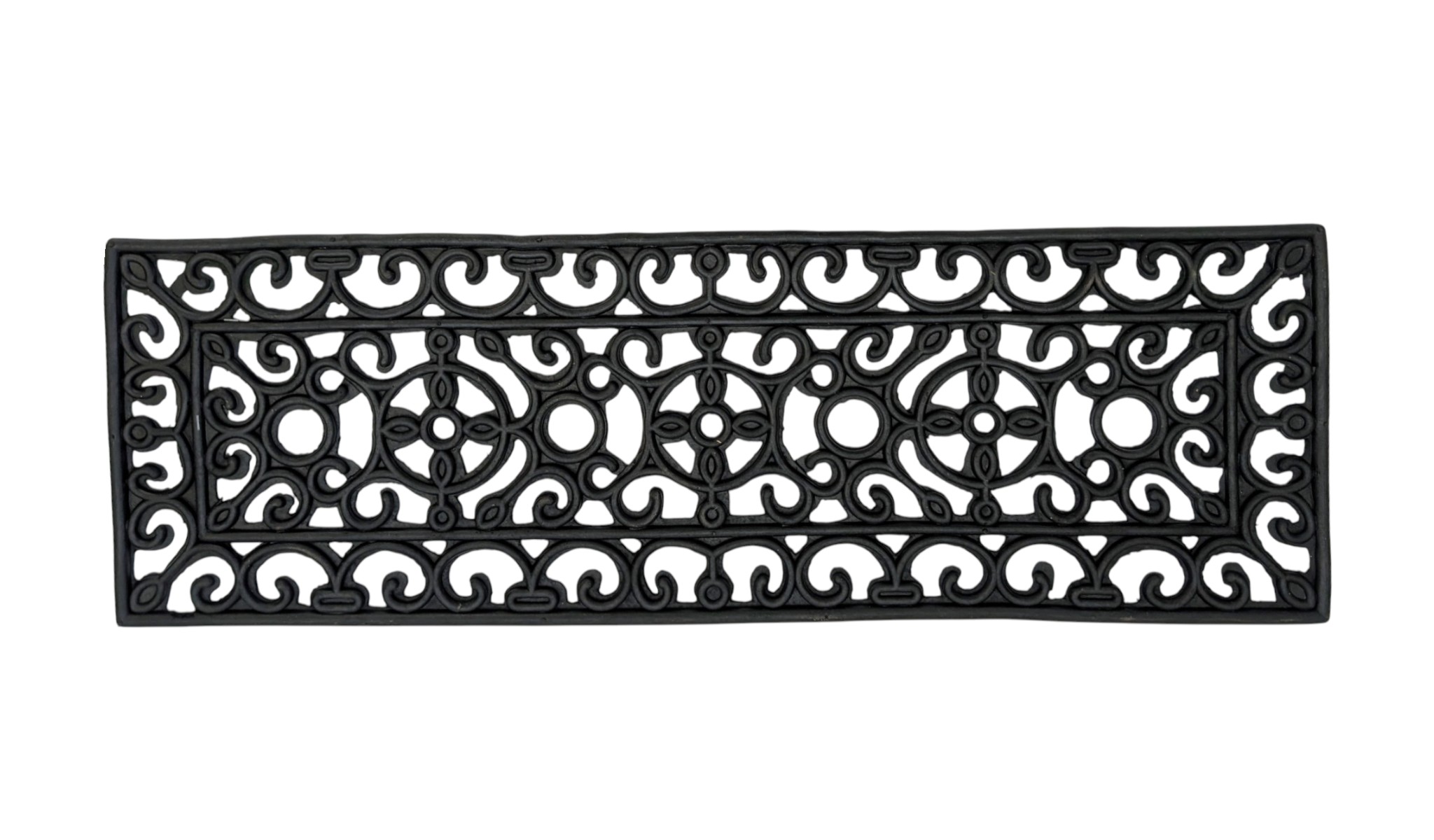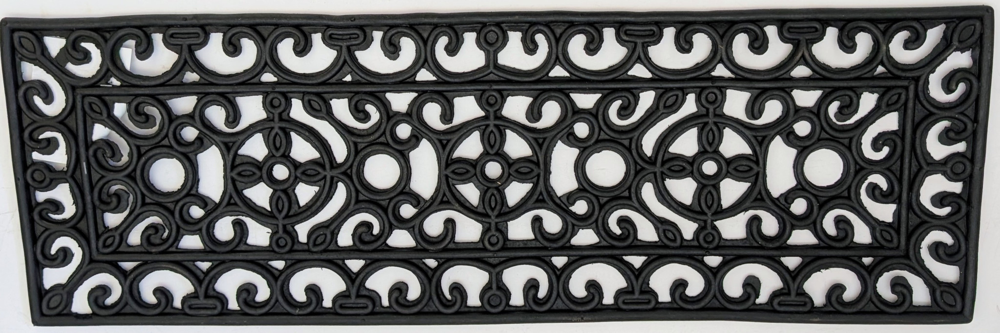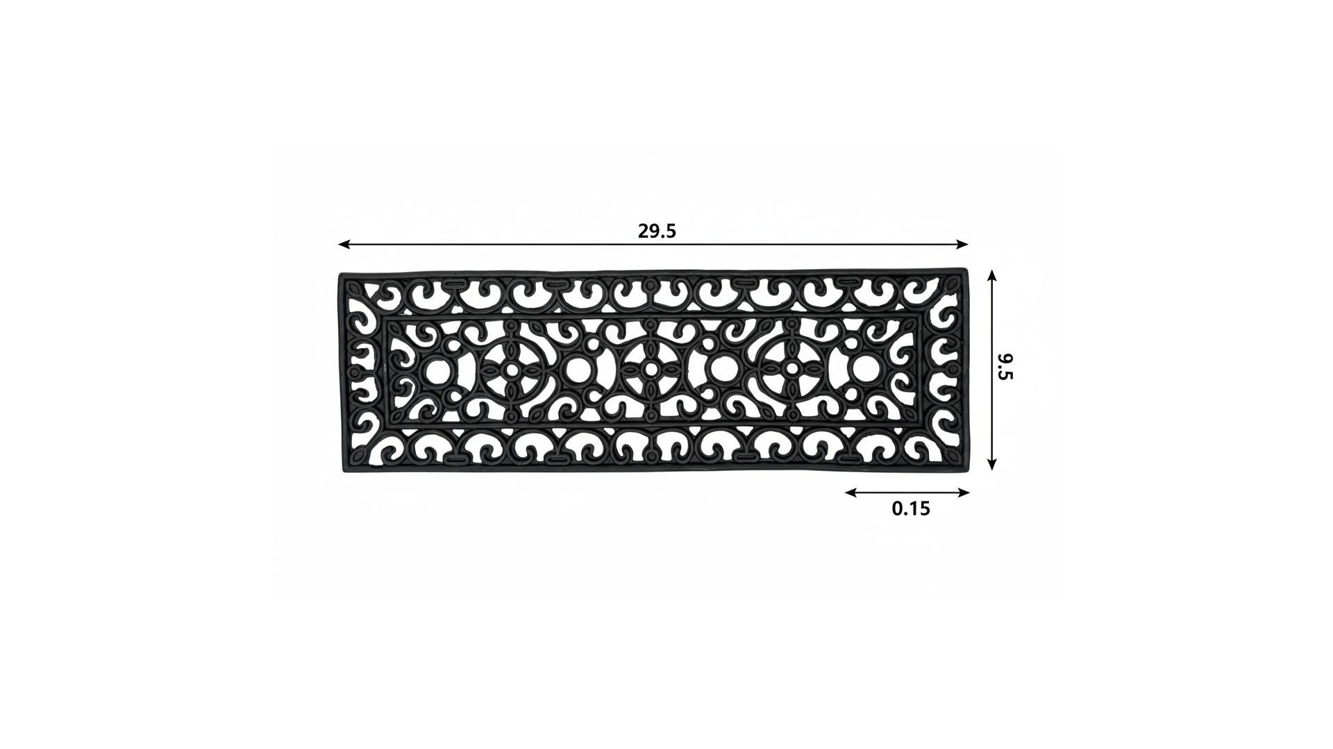 Ready to withstand heavy foot traffic, this 9-inch x 30-inch black rubber outdoor door mat is an ideal option for the front door or entrance way of your home or business. Crafted from rubber, this mat is not only functional but is a visually appealing accessory to welcome people to your home or business. Add this decorative mat to create a practical yet inviting welcome to all who enter. 9-inch h x 30-inch w x 0.15-inch d