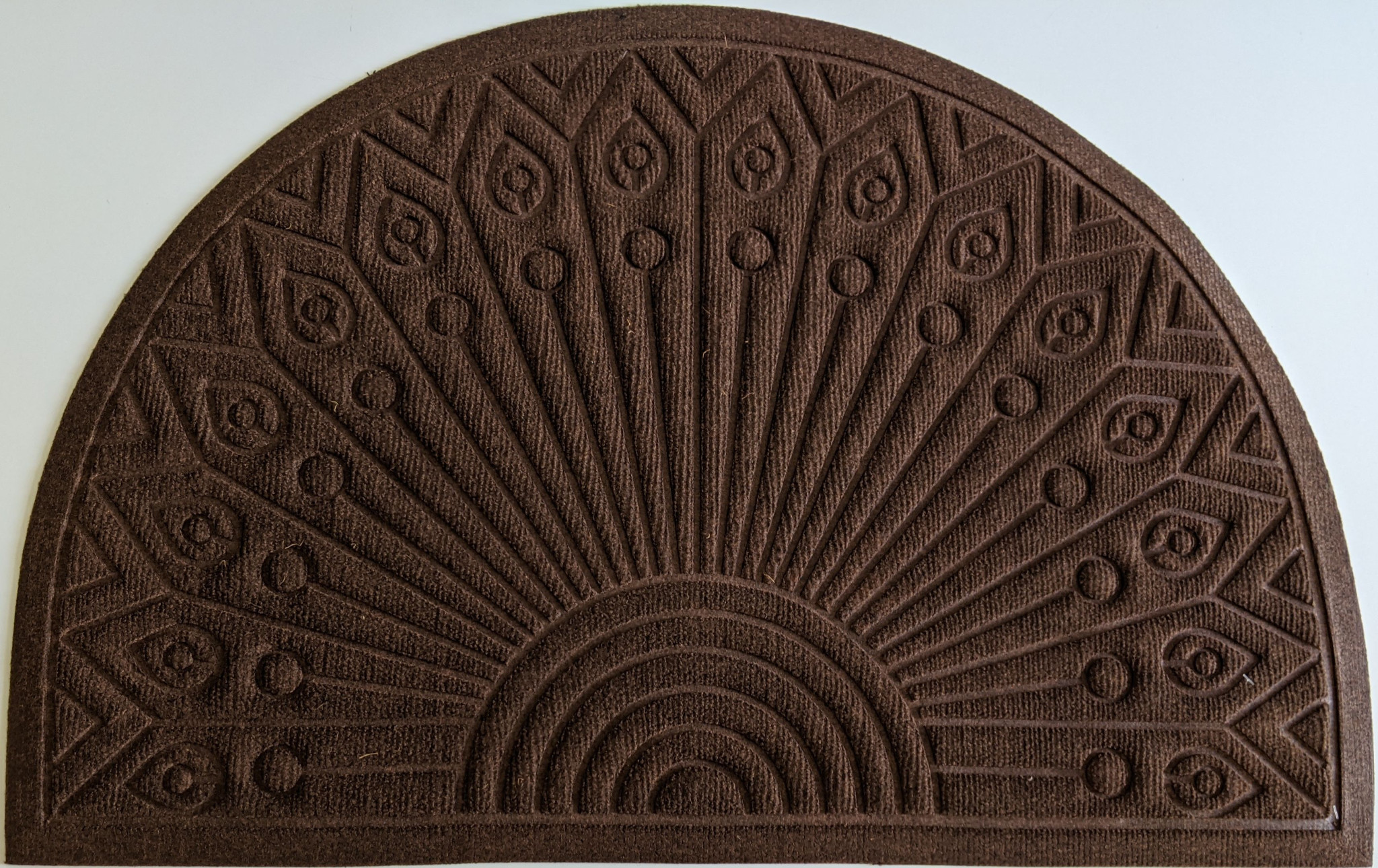 Ready to withstand heavy foot traffic, this 24-inch x 36-inch brown synthetic fiber abstract outdoor semi circle door mat is an ideal option for the front door or entrance way of your home or business. Crafted from synthetic fiber, this mat is not only functional but is a visually appealing accessory to welcome people to your home or business. Add this decorative mat to create a practical yet inviting welcome to all who enter. 24-inch h x 36-inch w x 0.25-inch d.