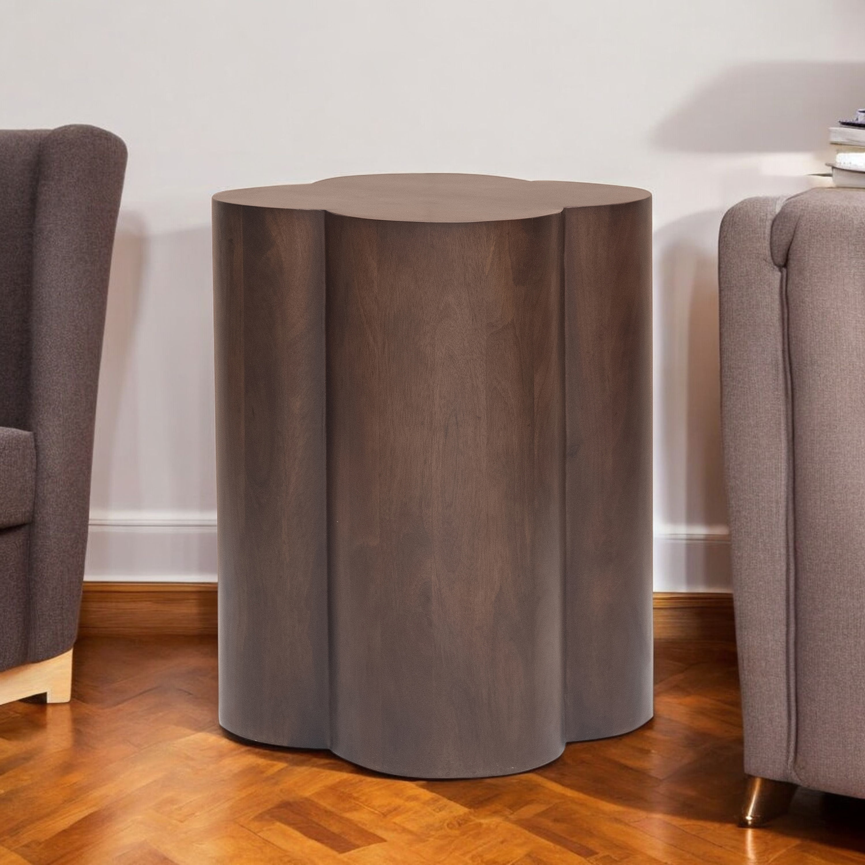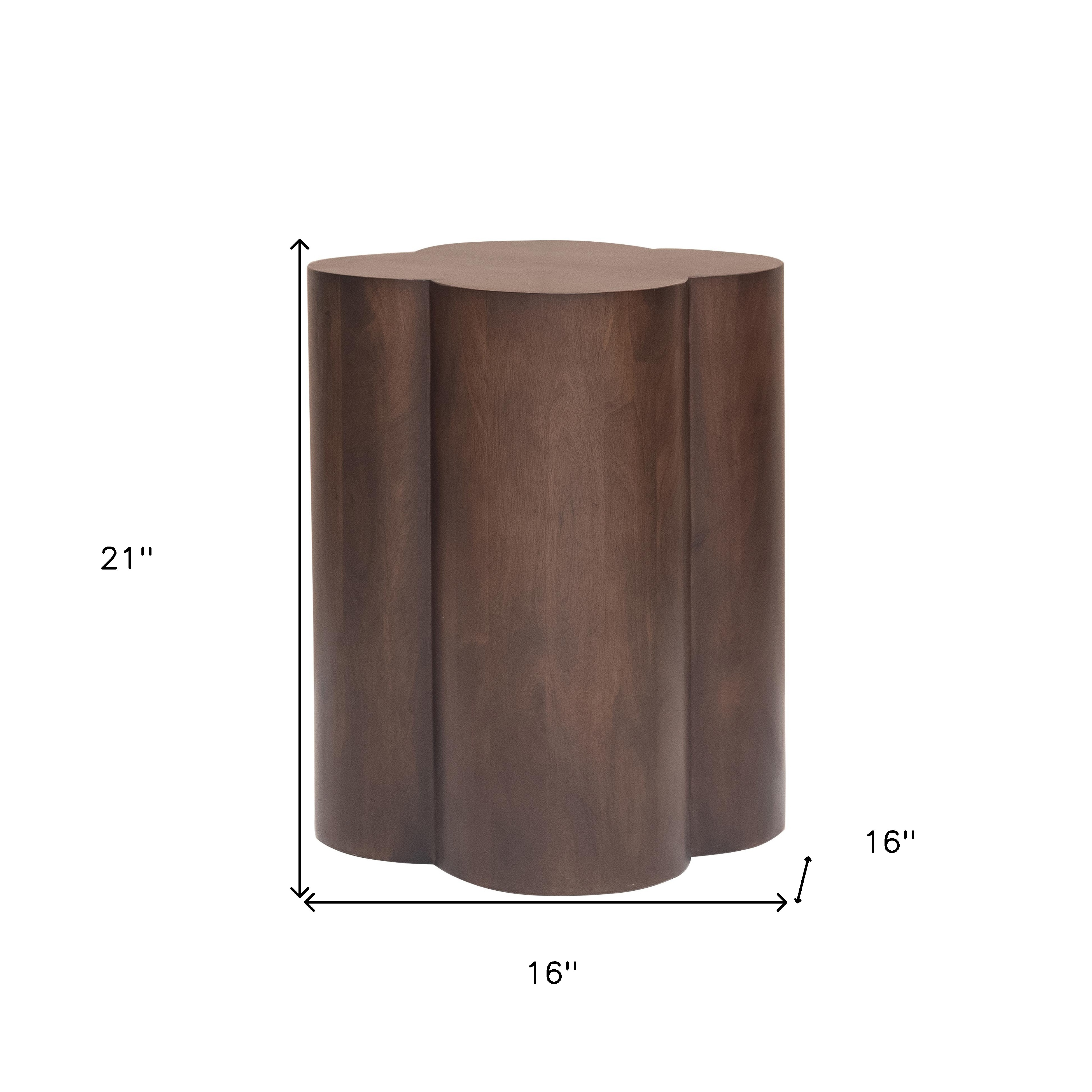 Distinctive in style the 21-inch brown solid wood end table radiates a versatile charm. The brown coloration runs throughout this good looking solid wood and unavailable table. A great accent on either side of the sofa or bed, this adorable end or side table is just what you need. This versatile table is a great accent for most any room. 21-inch h x 16-inch w x 16-inch d