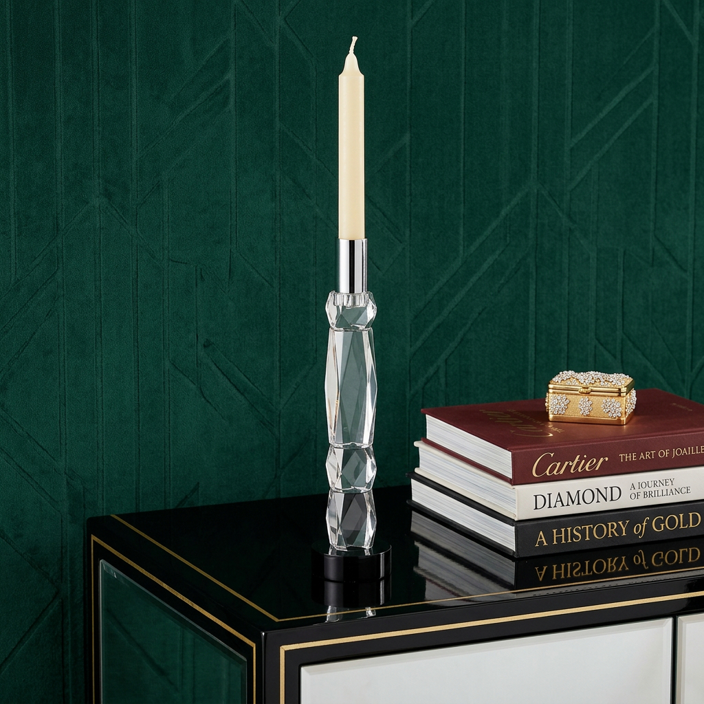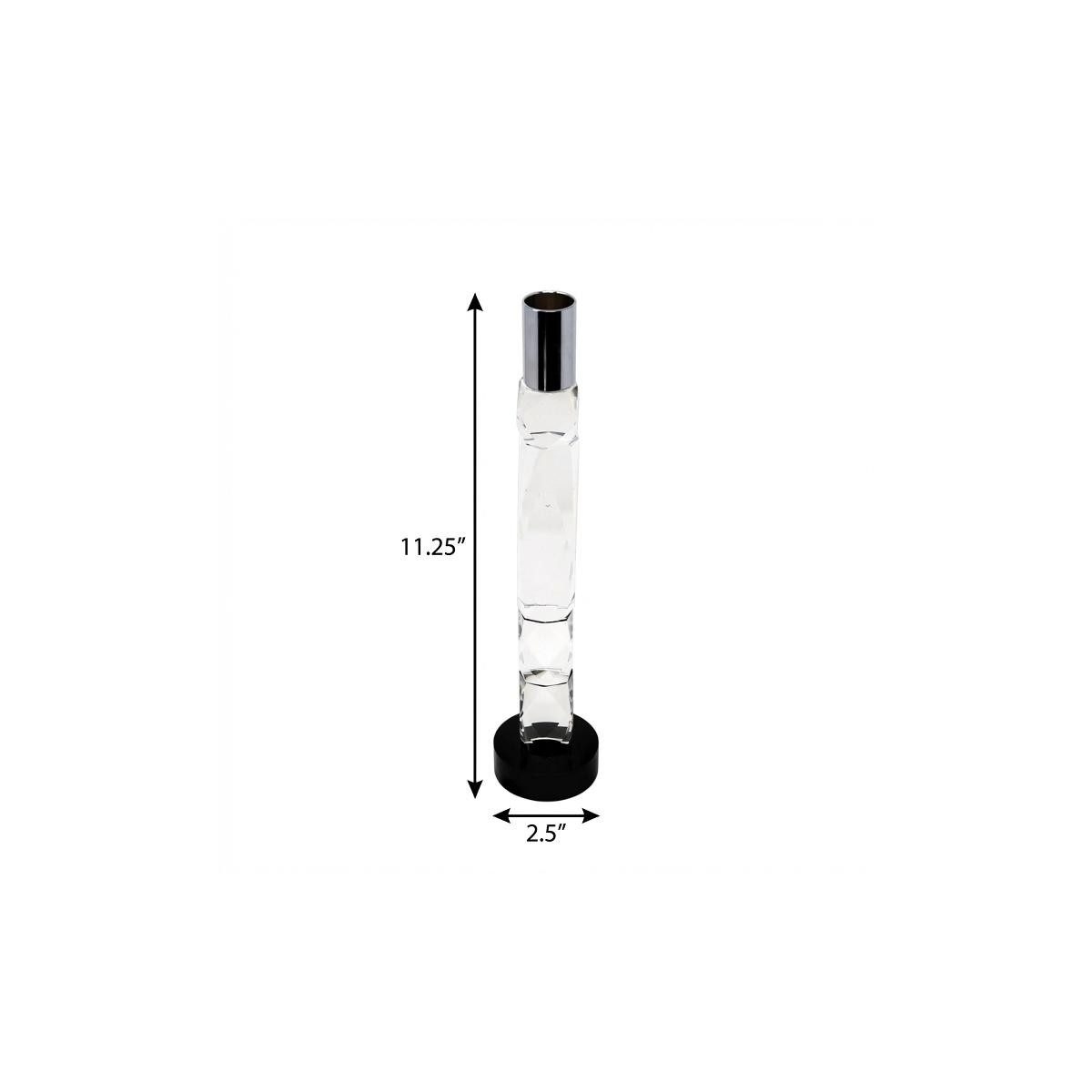 This 11-inch silver clear and black crystal tabletop taper candlestick is a great addition to your home decor. Dress up your home to impress every season with this fabulous candleholder. Features a modern and contemporary optical crystal layered geometric design in a chic clear and black color combination accented with silver at the top. 11.25-inch h x 2.5-inch w x 2.5-inch d.