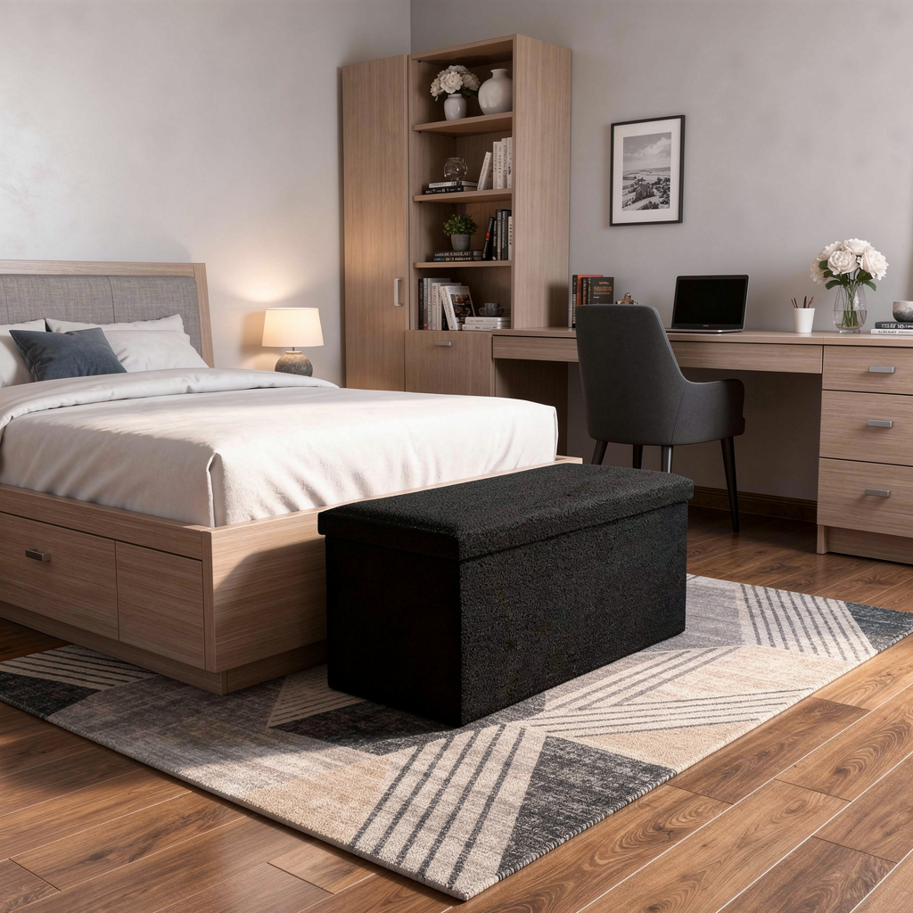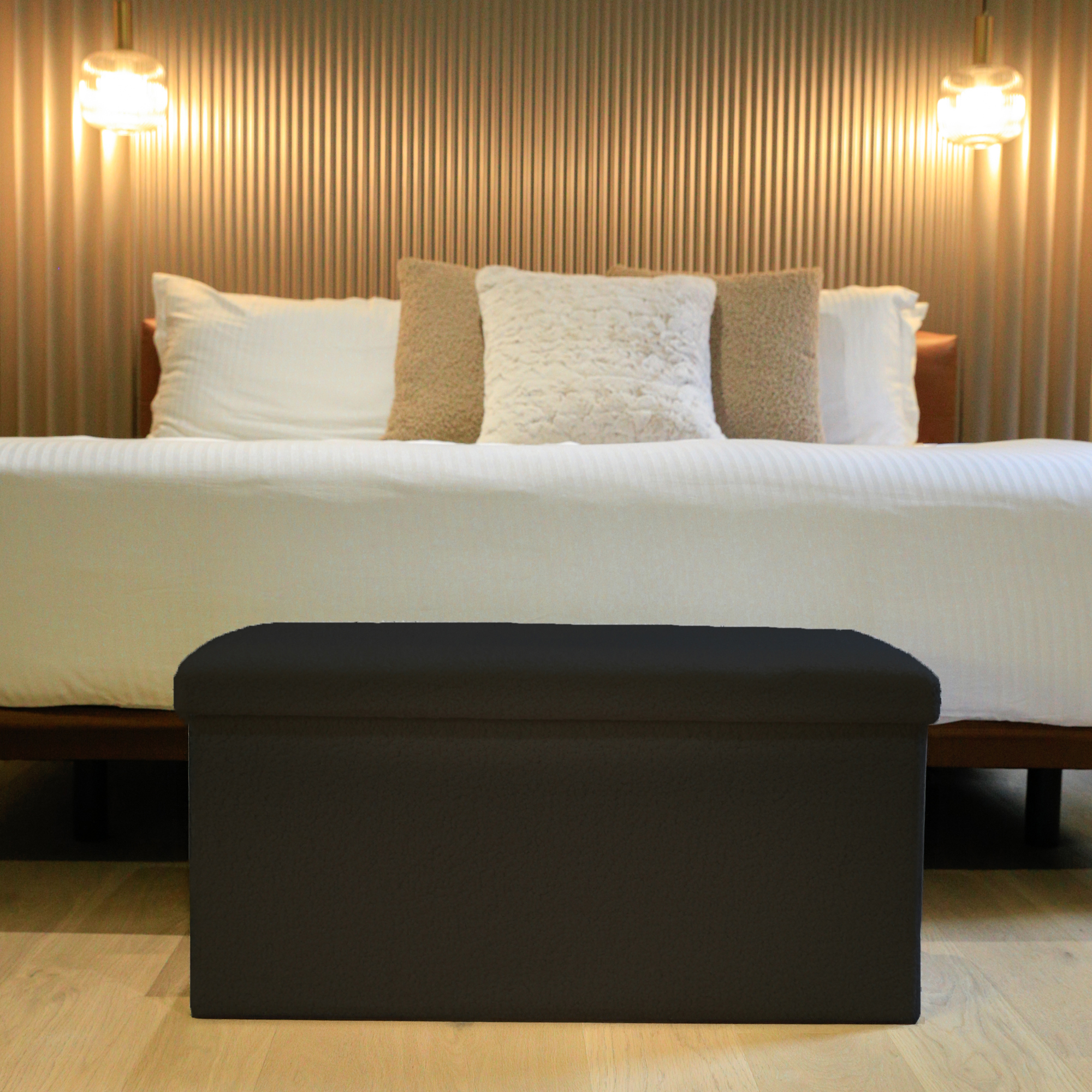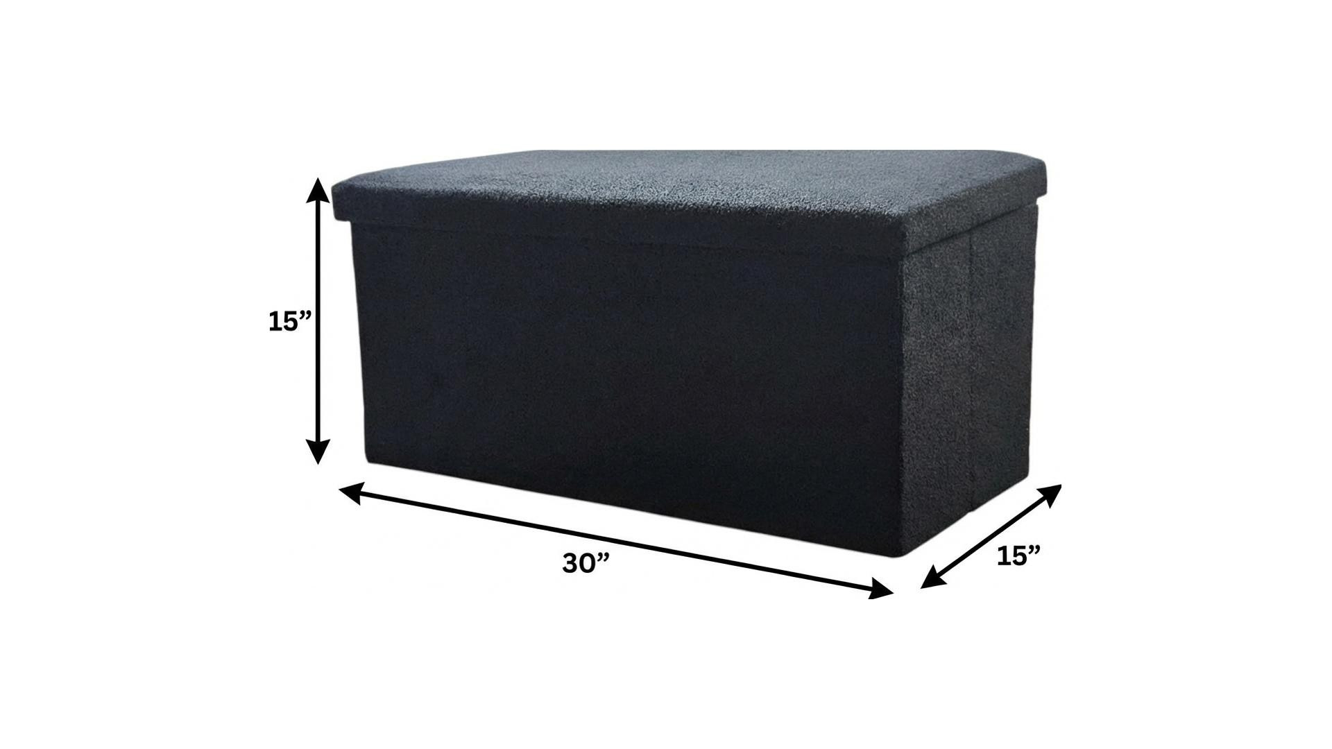 Get ready to relax with this 30-inch black boucle storage ottoman. Designed to discretely add hidden storage to your room without sacrificing seating or foot rest space. The upholstery top of this ottoman is a nice contrast to the upholstery material. Expertly upholstered with padding in a soft solid color boucle, this ottoman is as comfortable as it is good looking. Ottomans are multi-functional additions to your space that add fashion and practical value. 15-inch h x 30-inch w x 15-inch d.