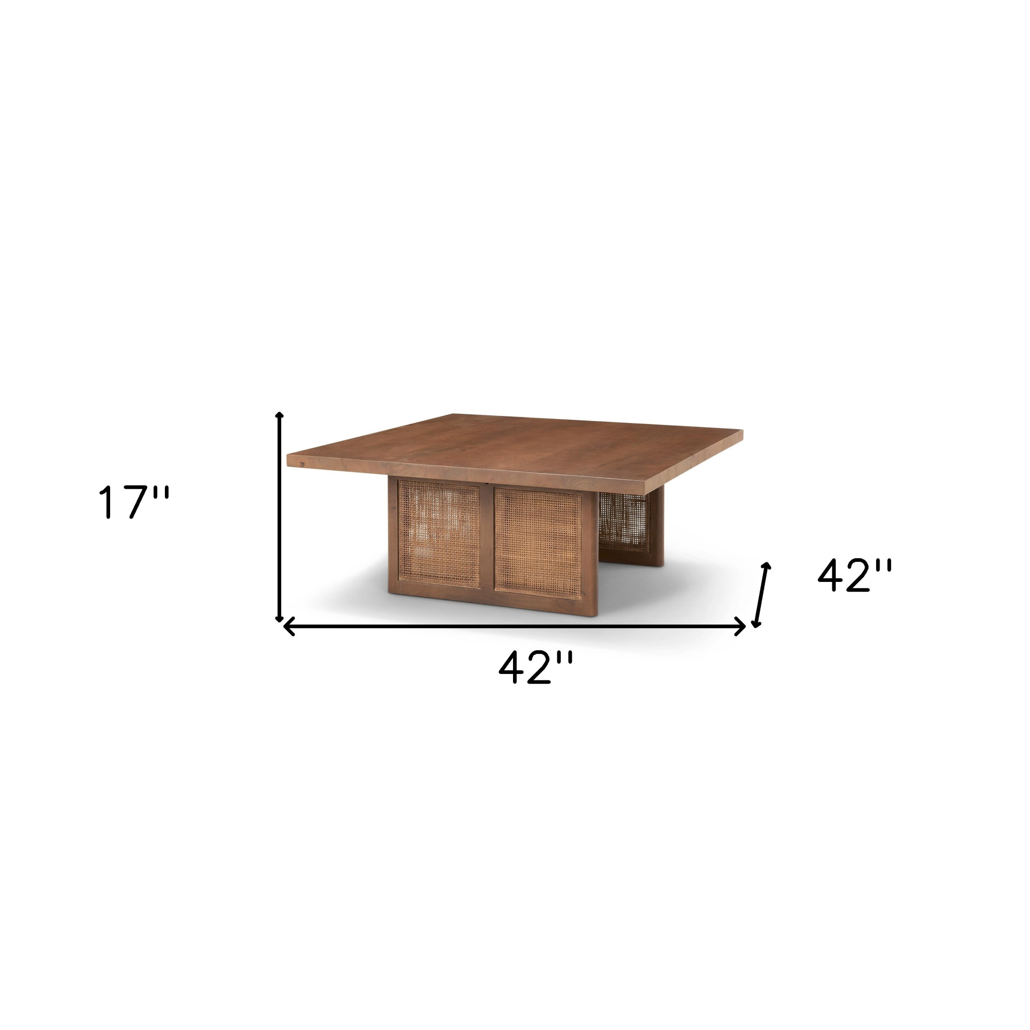 Stylish and super sturdy, the 42-inch brown and natural solid wood and wicker square double pedestal coffee table is an amazingly good looking coffee table. The warm brown solid wood top of this table is a nice visual contrast to the high quality, brown and natural solid wood and wicker rattan cane of the base. This square table utilizes its unique shape and to give your room a modern geometric accent with a touch of island tropical flair. It has an attractive design that will definitely breathe some fresh air into your interior. 17-inch h x 42-inch w x 42-inch d.