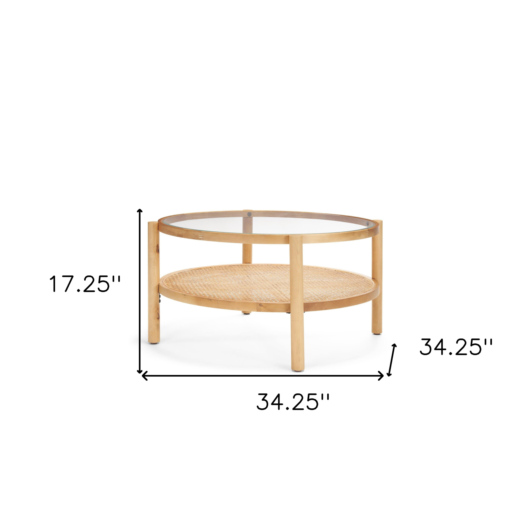 Give your living room, family room, or office the perfect anchor piece with this 34-inch clear and natural glass and solid wood round coffee table with shelf. The clear glass top of this table is a nice visual contrast to the high quality, natural solid wood of the frame. Includes a bottom shelf made of cane rattan that gives you additional storage and display space and adds a decidedly upscale island vibe to your space. It has an attractive design that will definitely breathe some fresh air into your interior. 17.25-inch h x 34.25-inch w x 34.25-inch d.