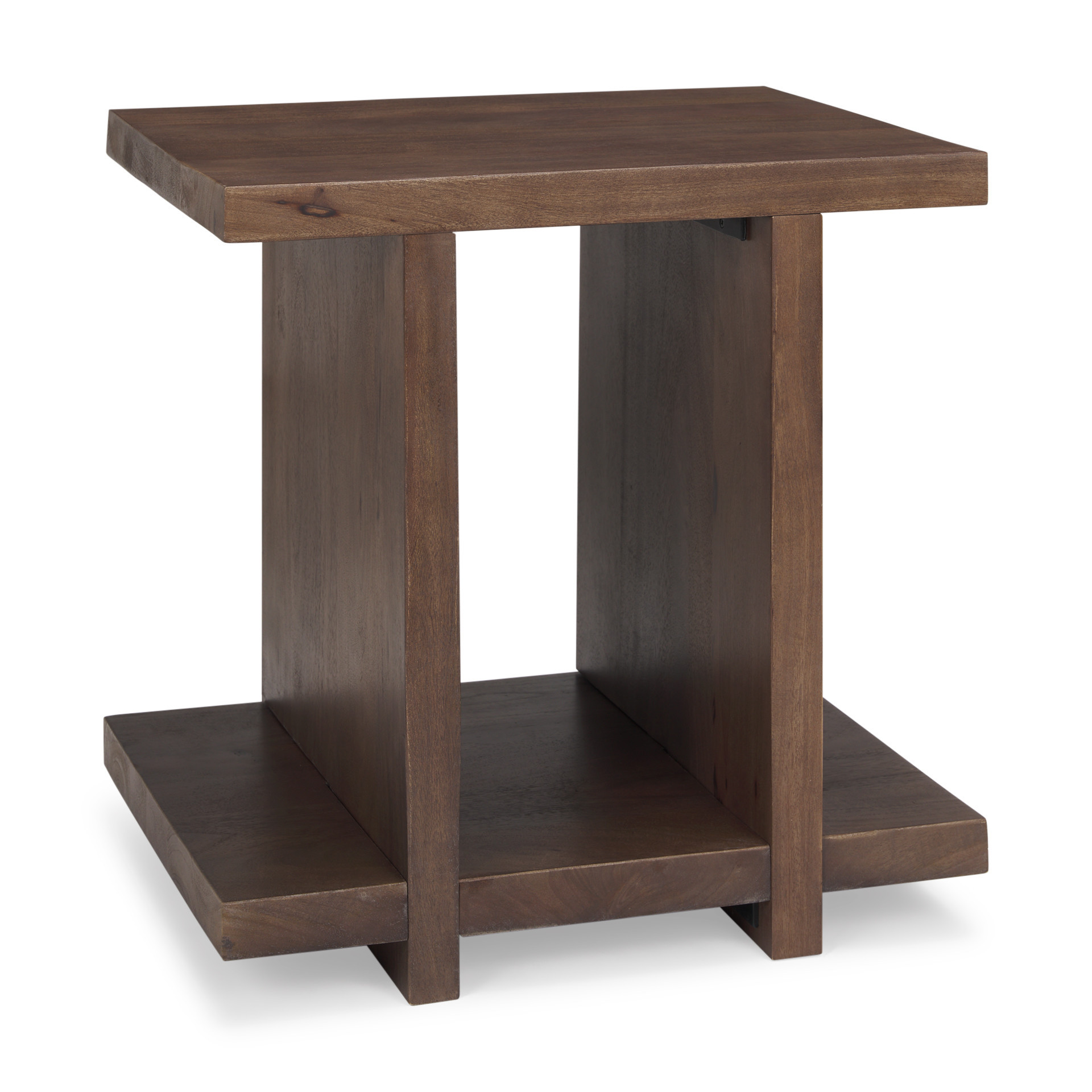 Show off your exquisite taste with this 22-inch brown solid wood sled end table with shelf. This table is made from solid wood in a brown color throughout the base and top. Help to keep your space organized with the included single shelf. A great accent on either side of the sofa or bed, this adorable end or side table is just what you need. You can match it with other pieces to get the ideal look for your place. 22-inch h x 18-inch w x 22-inch d.