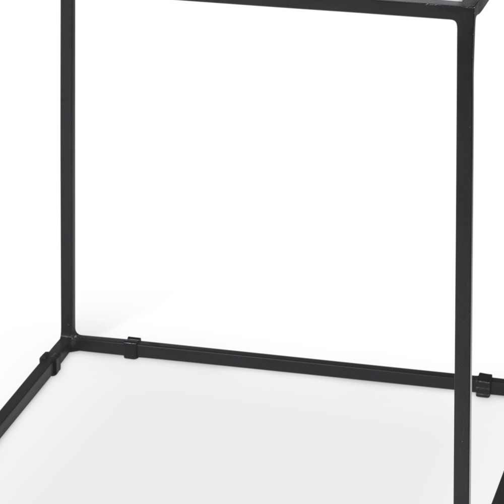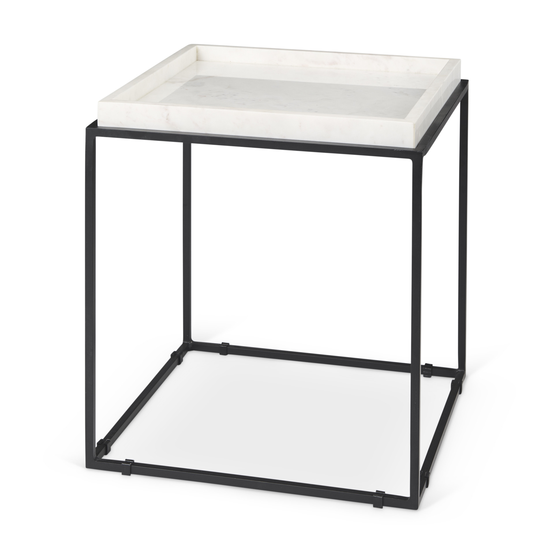 Distinctive in style the 20-inch white and black marble and metal square frame end table radiates a versatile charm. A matte black open geometric metal frame is finished off with a creamy white marble raised edges tray style top that is the epitome of quality construction and design. An ideal location for placing your snacks and drinks, and a place to keep your lamp, frames, or other accessories. This versatile table is a great modern accent for most any room. 20-inch h x 18-inch w x 18-inch d.