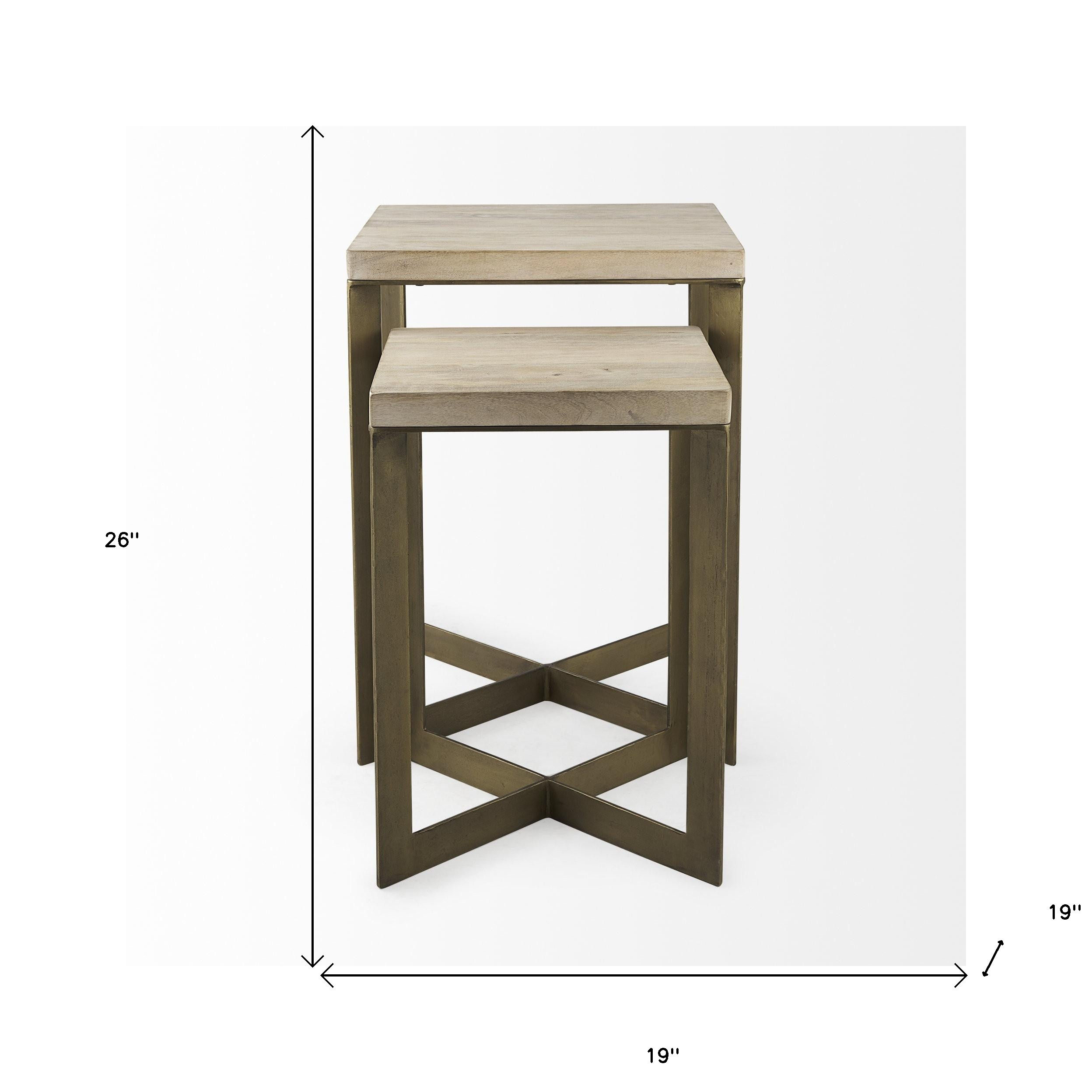 Optimize your space with the set of two natural and gold solid wood and metal square cross legs nested tables that nest into each other easily and fashionably when not in use. Quality construction from the unique geometric cross legs gold metal base combines with natural solid wood of the top to give this table a fresh and updated look. Side tables are a great way to flank your sofa, use as an accent next to your favorite chair, or can even be used bedside. 26-inch h x 19-inch w x 19-inch d.