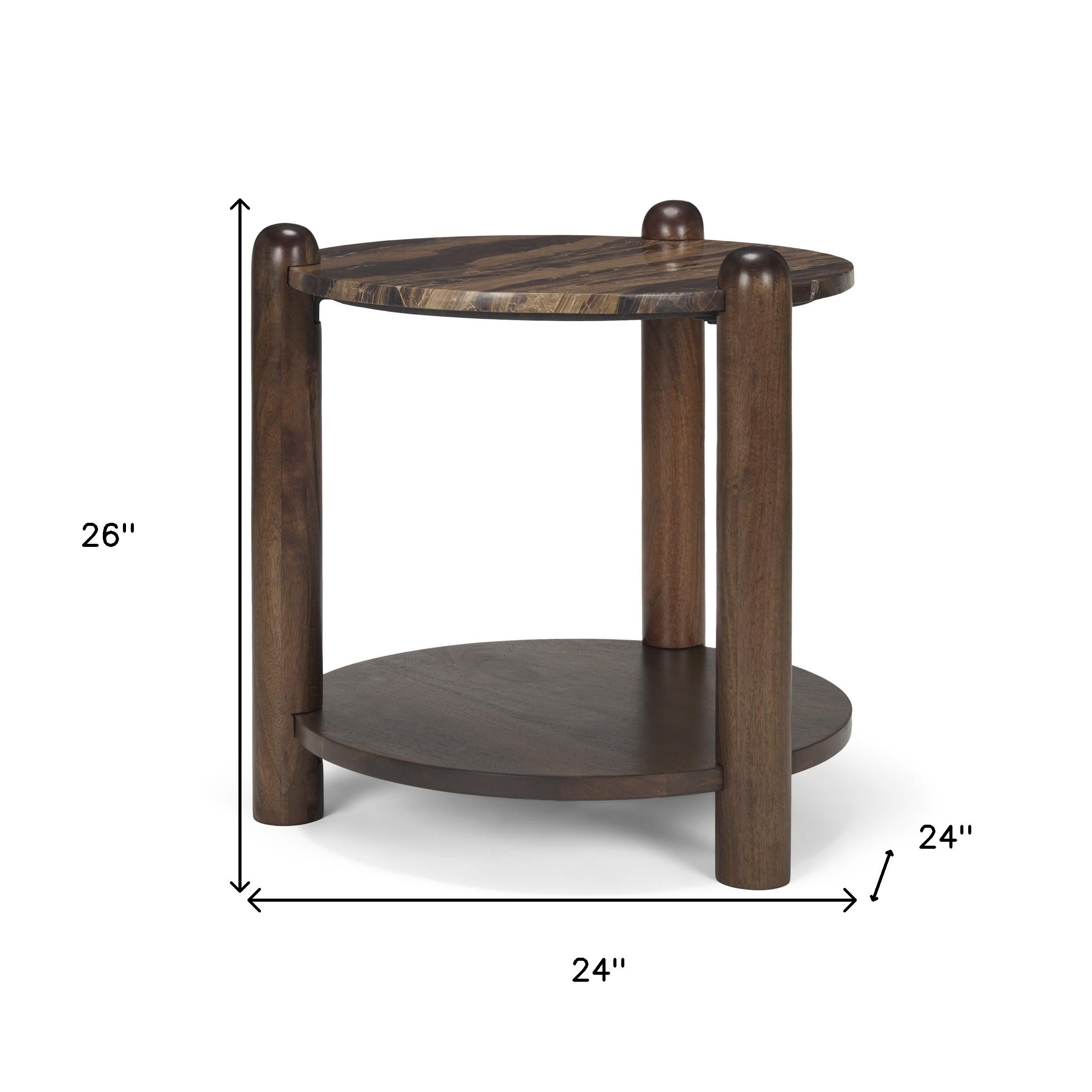 Distinctive in style the 26-inch brown marble and solid wood end table with shelf radiates a versatile charm. A sleek brown monotone color gives this solid wood and marble table a fresh and updated look. Help to keep your space organized with the included single shelf. Side tables are a great way to flank your sofa, use as an accent next to your favorite chair, or can even be used bedside. This versatile table is a great accent for most any room. 26-inch h x 24-inch w x 24-inch d.