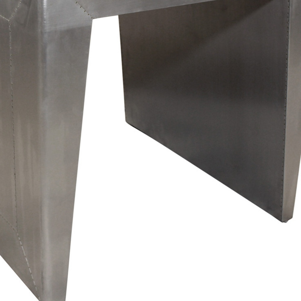 Distinctive in style the 24-inch silver aluminum and solid wood square sled end table radiates a versatile charm. The silver coloration runs throughout this good looking solid wood and aluminum table. A great accent on either side of the sofa or bed, this adorable end or side table is just what you need. You can also use it as an entryway table to hold your keys. 24-inch h x 24-inch w x 24-inch d.