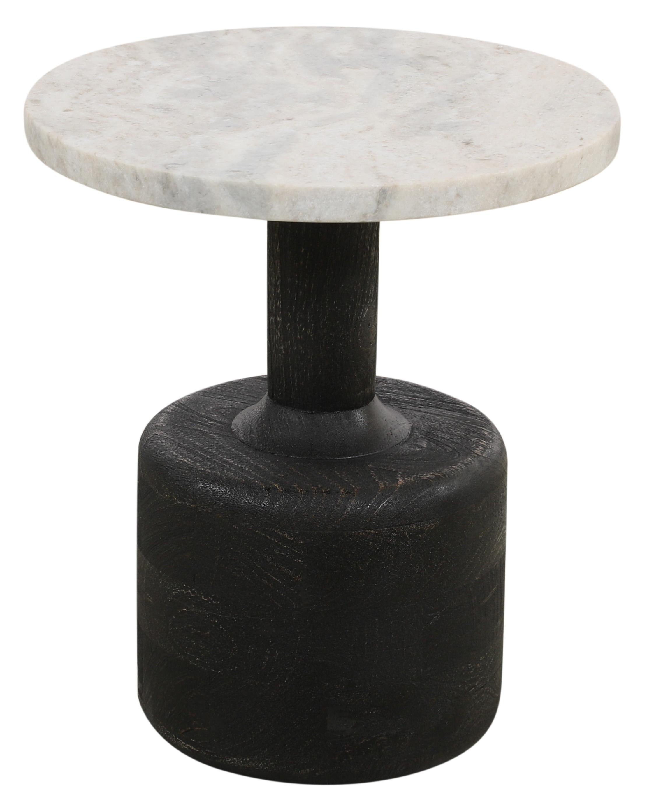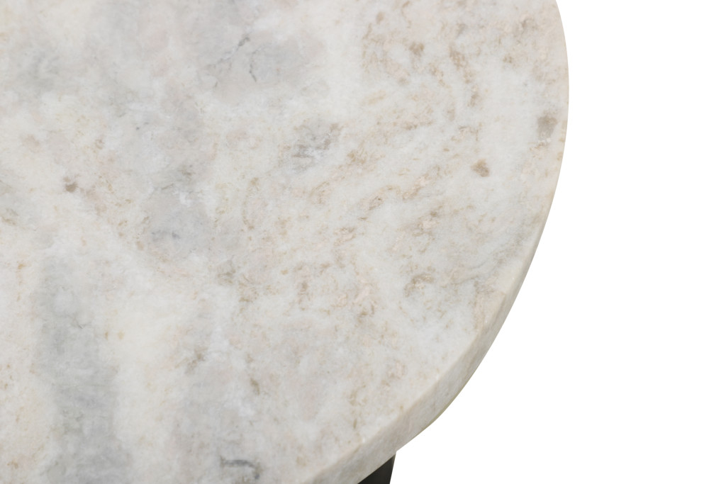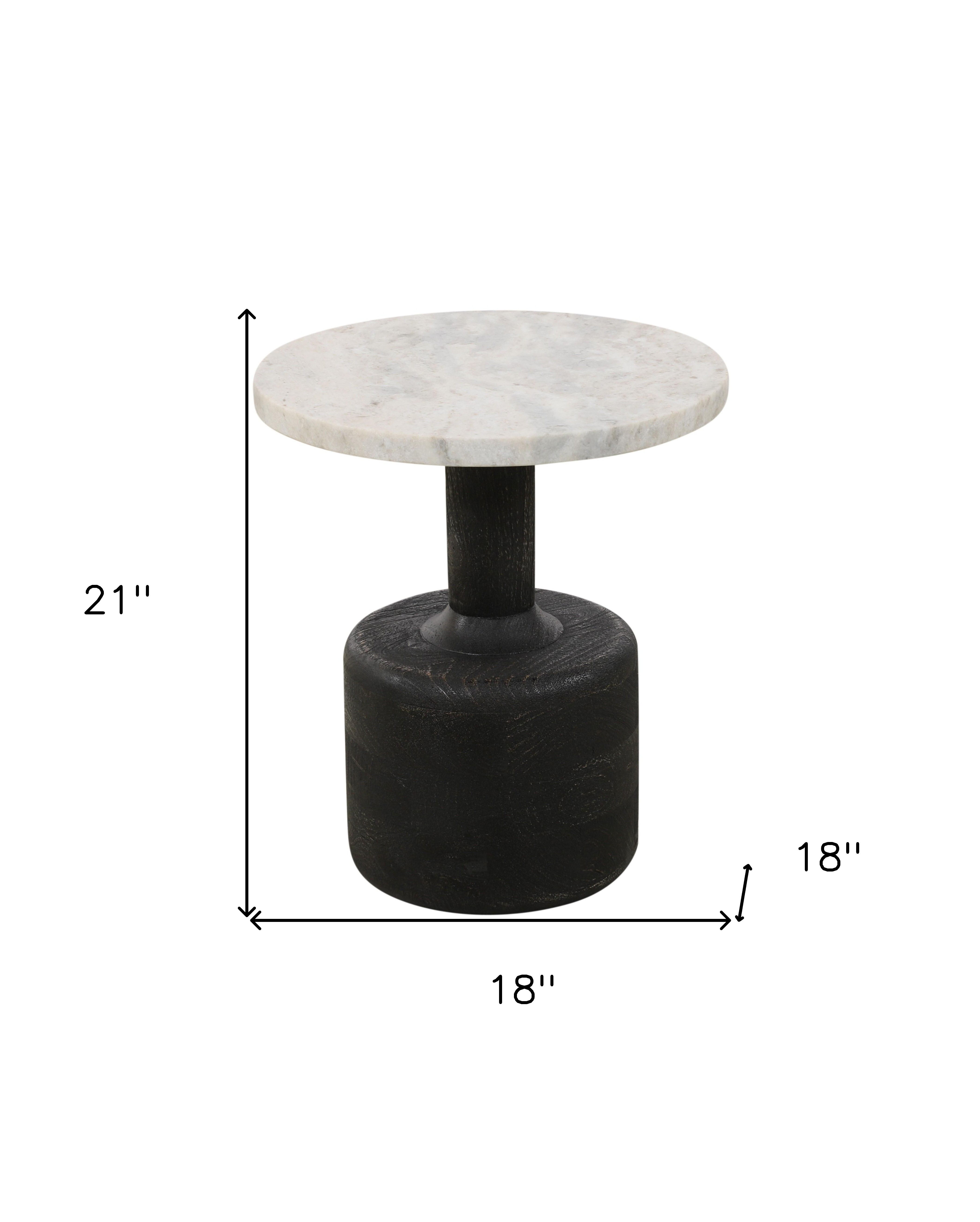 Show off your exquisite taste with this 21-inch white and black distressed marble and solid wood round pedestal end table. A black solid wood frame is finished off with a white marble top that is the epitome of quality construction and design. Complete with a purposefully distressed finish, this table has an aged, vintage, and rustic feel. Side tables are a great way to flank your sofa, use as an accent next to your favorite chair, or can even be used bedside. You can also use it as an entryway table to hold your keys. 21-inch h x 18-inch w x 18-inch d.