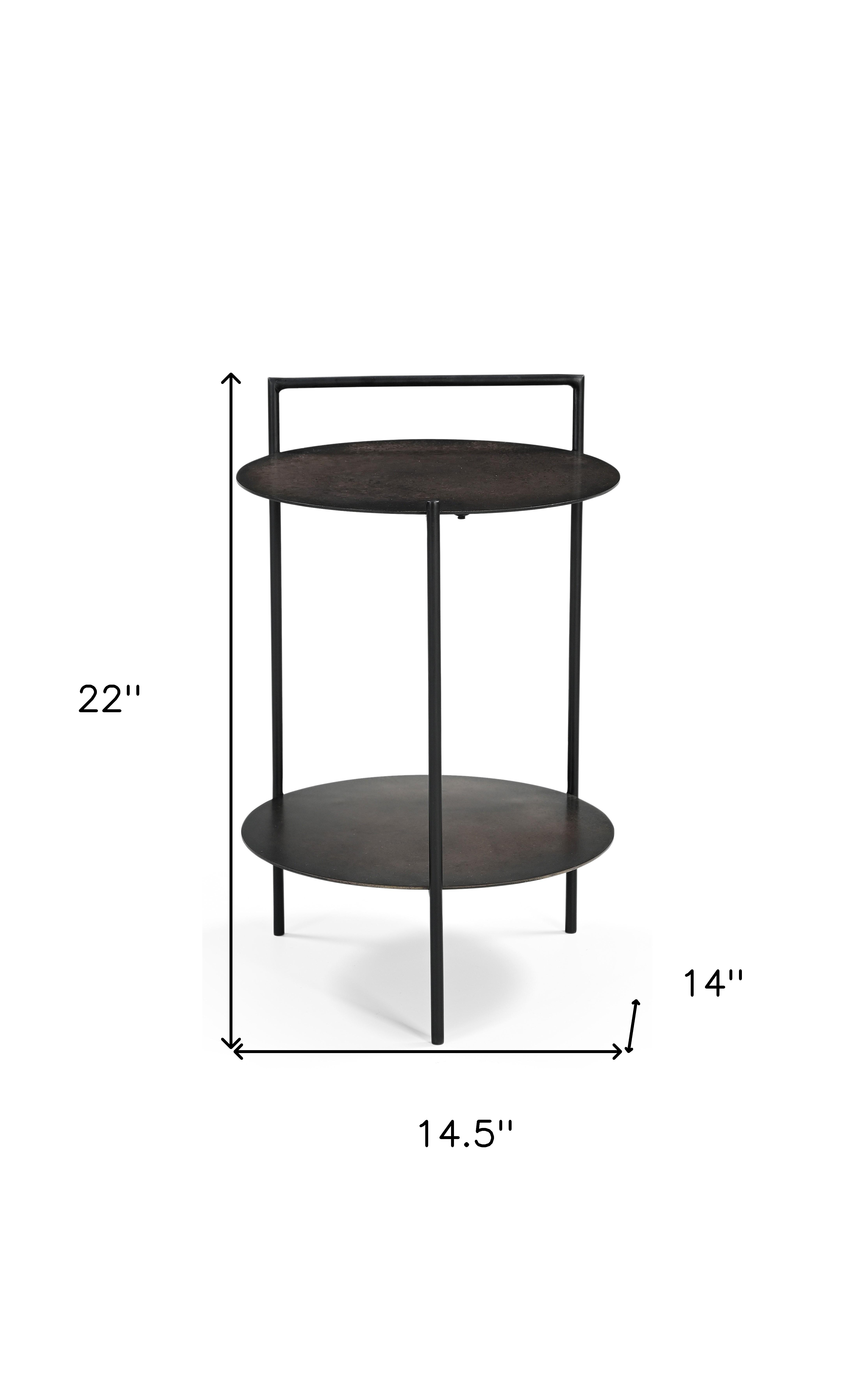 Distinctive in style the 22-inch copper iron round end table with shelf radiates a versatile charm. This table features quality construction from iron and an updated monotone color scheme with copper as the main color on both the top and the base. Help to keep your space organized with the included single shelf. Side tables are a great way to flank your sofa, use as an accent next to your favorite chair, or can even be used bedside. You can match it with other pieces to get the ideal look for your place. 22-inch h x 14.5-inch w x 14-inch d.