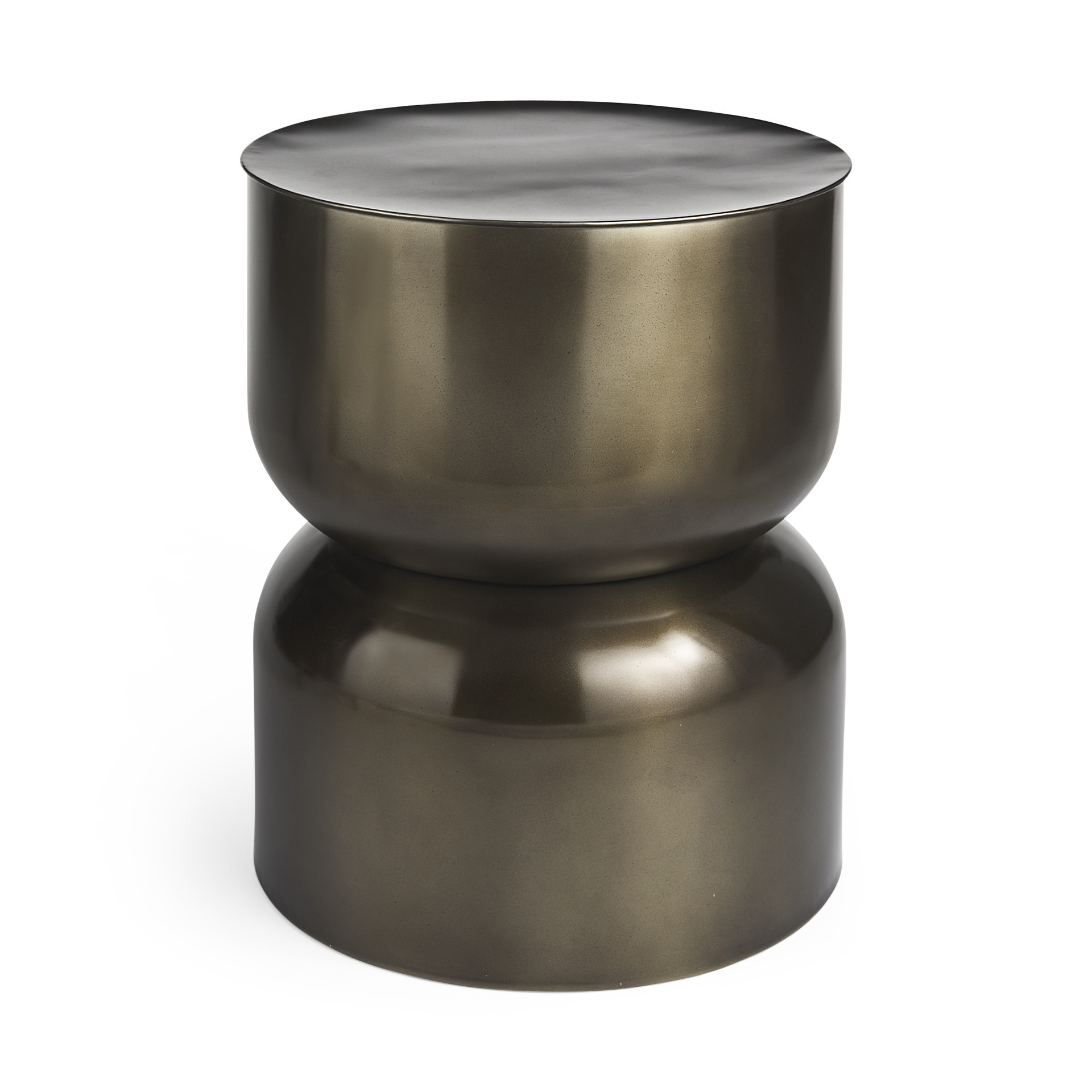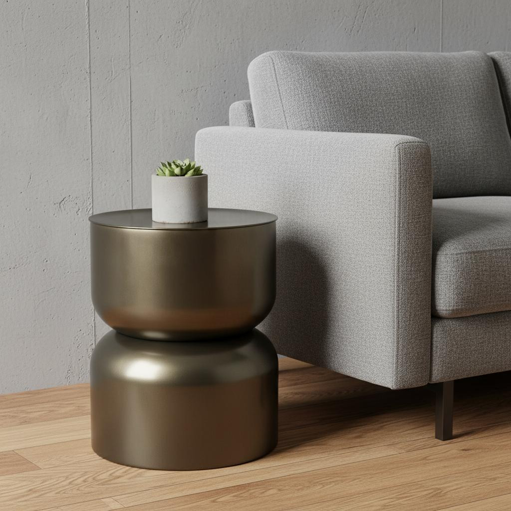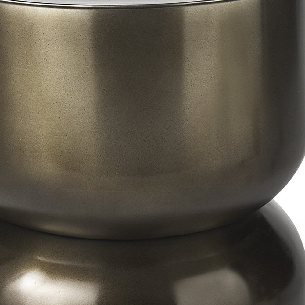 Distinctive in style the 20-inch antiqued gold iron round drum end table radiates a versatile charm. This table is made from iron with a brushed antiqued gold finish throughout the base and top. The modern drum shape is cinched in the middle to resemble an hourglass. Side tables are a great way to flank your sofa, use as an accent next to your favorite chair, or can even be used bedside. You can match it with other pieces to get the ideal look for your place. 20.00-inch h x 17.00-inch w x 17.00-inch d.