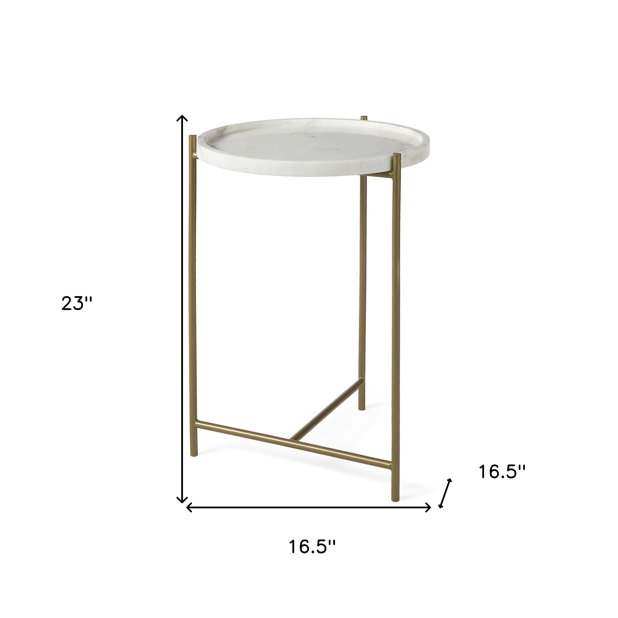 The 17-inch white and gold genuine marble and metal tray table is a stylish addition to any modern space. Featuring a stunning genuine marble top, this table offers both elegance and functionality. The sleek white surface beautifully contrasts with the luxurious gold metal base, creating a striking visual appeal. Perfect for serving snacks or displaying decor, it easily complements various interior design themes. Its compact size makes it versatile, allowing for easy placement in living rooms, bedrooms, or even outdoor areas. This tray table is not only a practical choice but also a statement piece that enhances your home's aesthetic charm. Elevate your decor with this exquisite blend of materials and finishes. 23.00-inch h x 16.50-inch w x 16.50-inch d.