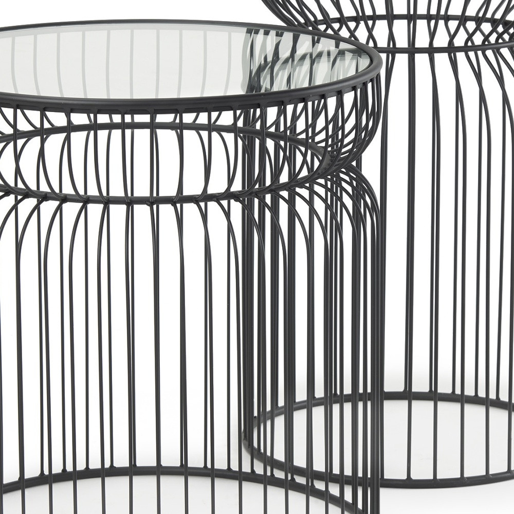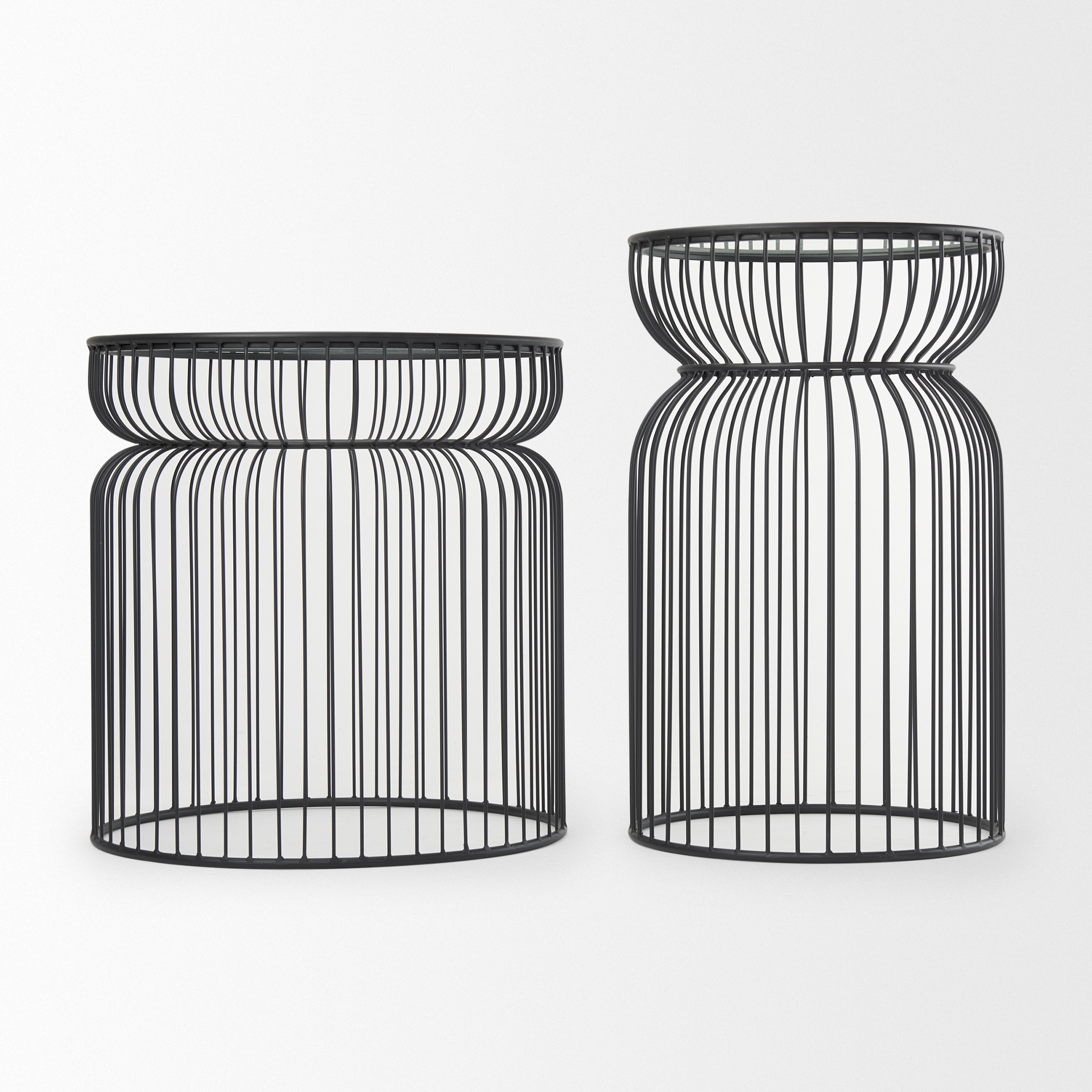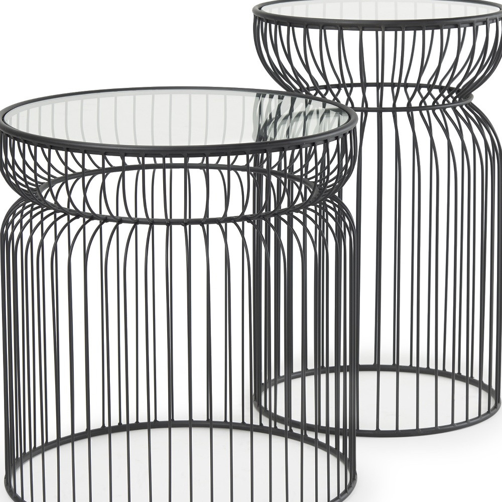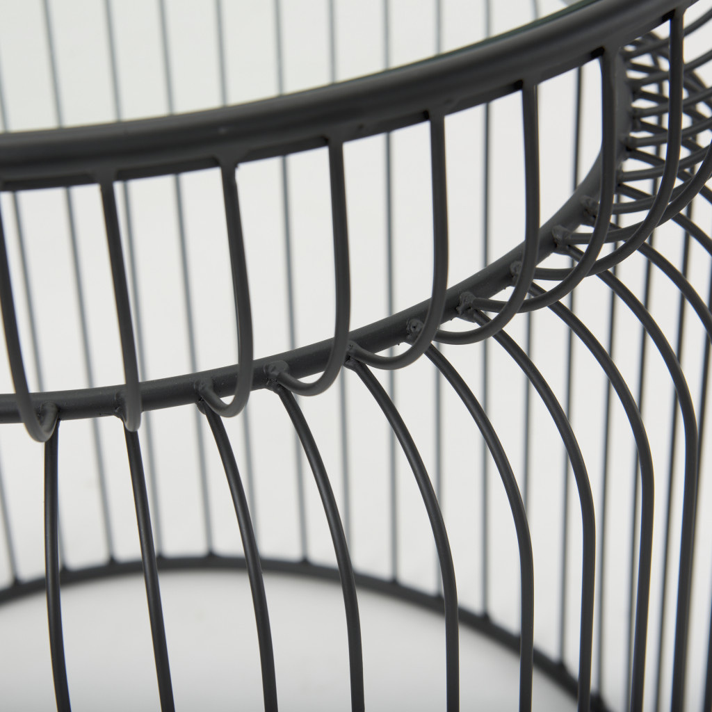 Increase your decorating options with this set of two clear and black tempered glass and metal round drum end tables that will enhance your space. This pair adds a modern, slightly industrial style to your space and can be used together or separately as you choose. The clear tempered glass top of these tables is a nice contrast to the high quality, matte black open metal wire cage design of the bases. Add some modern and unique style to your space with this set of two graduated size accent tables.