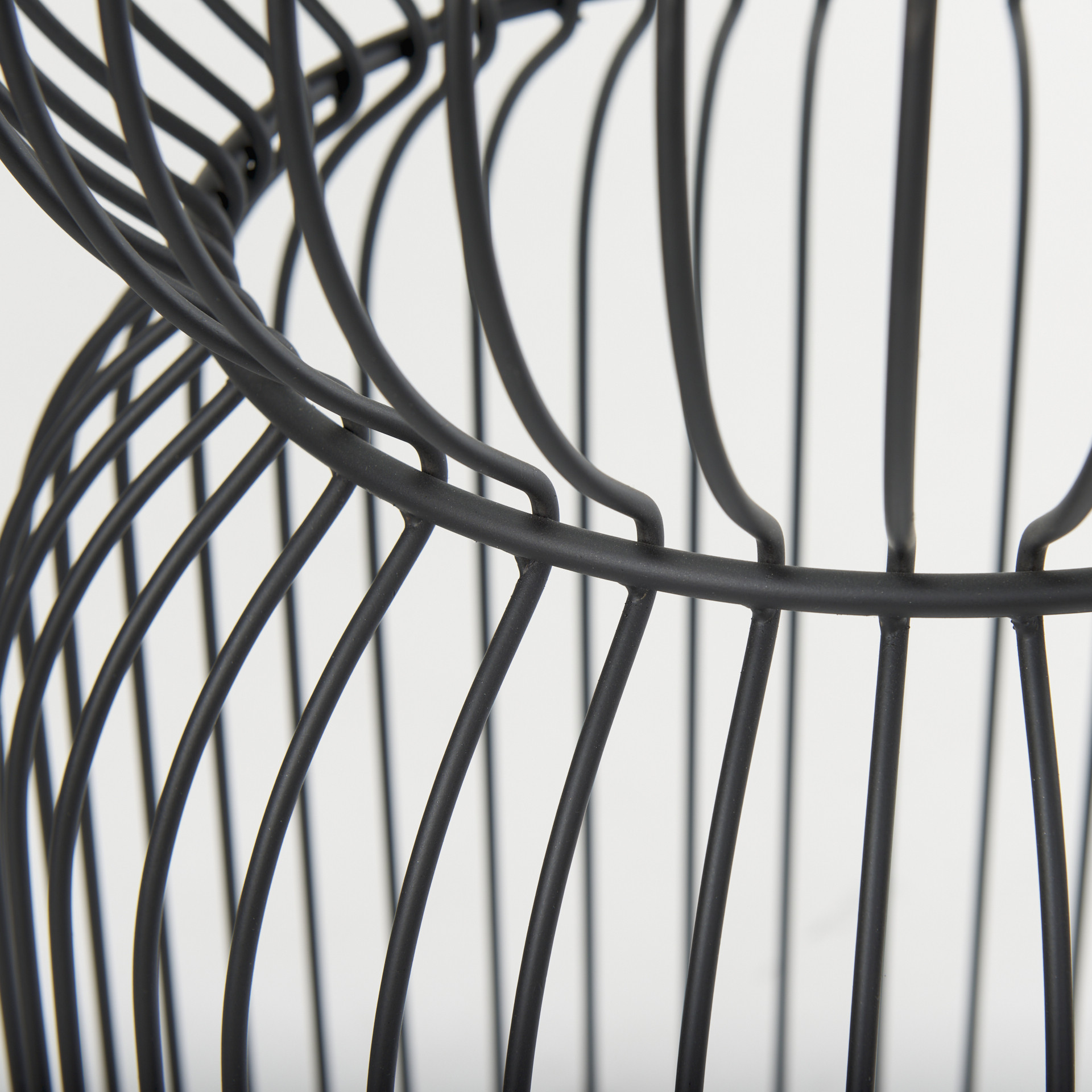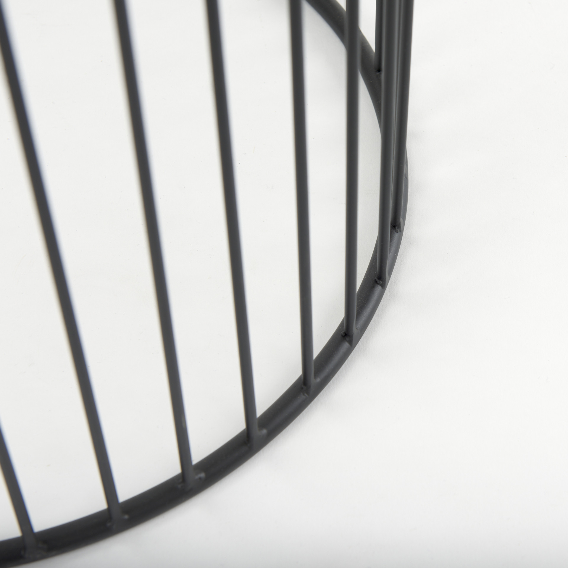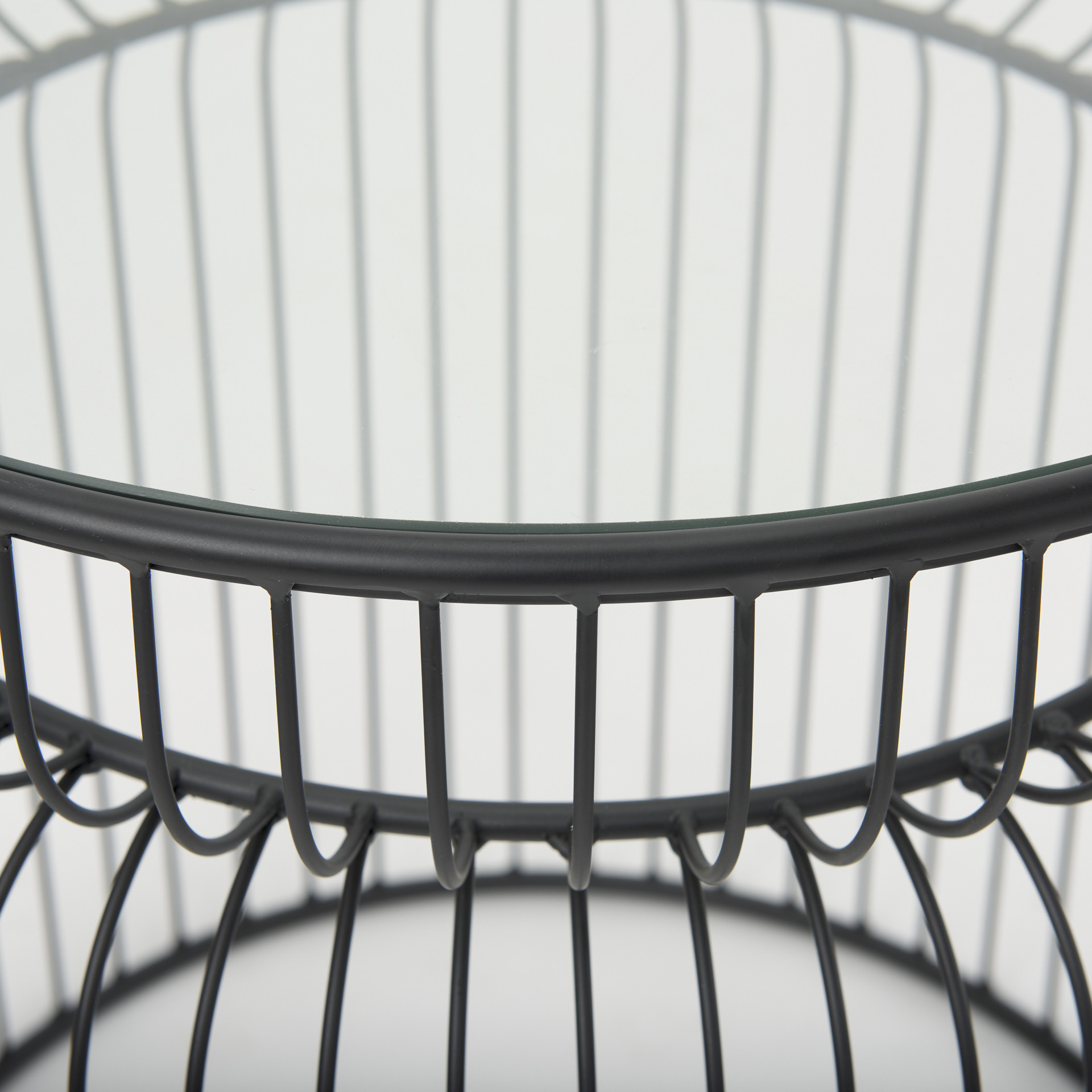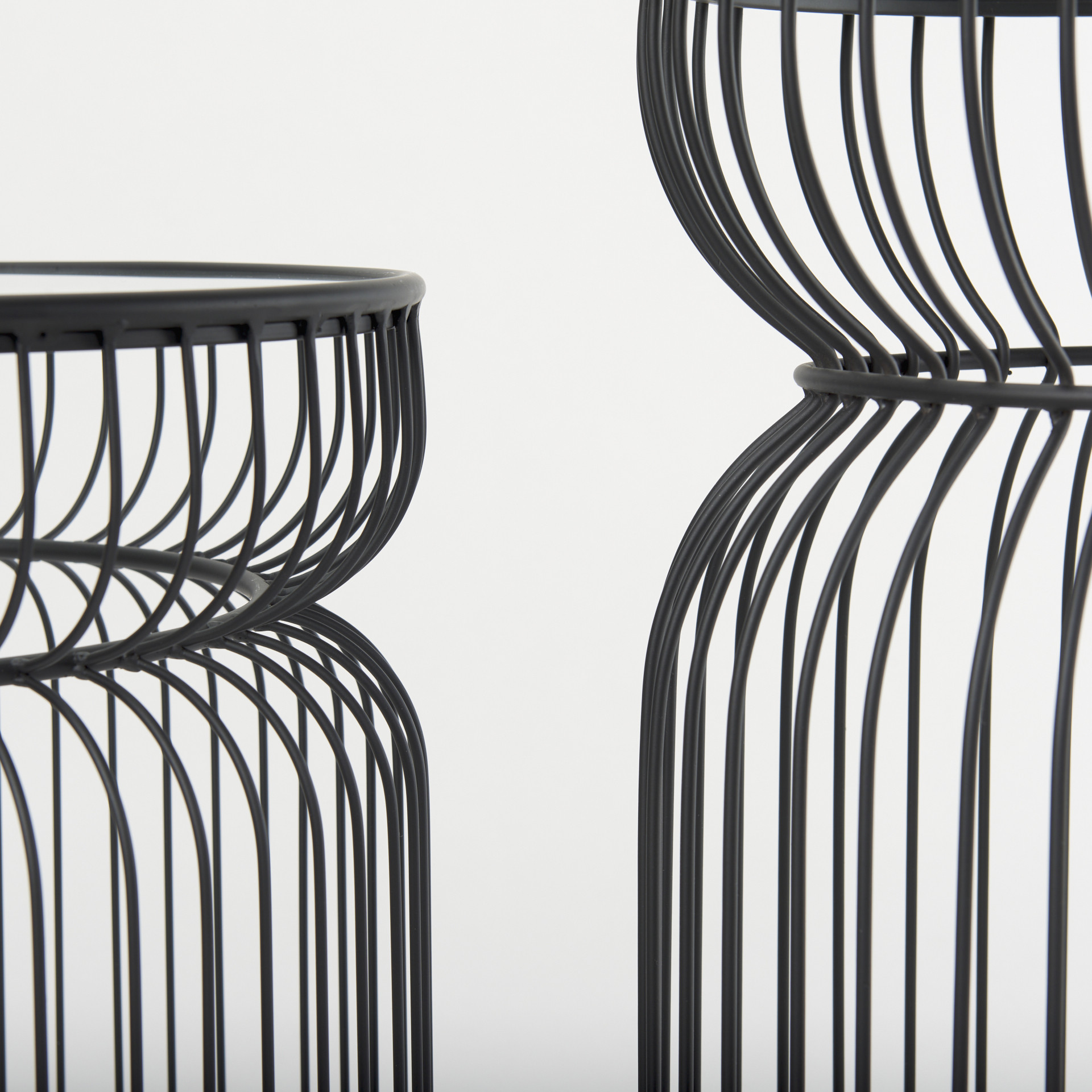 Increase your decorating options with this set of two clear and black tempered glass and metal round drum end tables that will enhance your space. This pair adds a modern, slightly industrial style to your space and can be used together or separately as you choose. The clear tempered glass top of these tables is a nice contrast to the high quality, matte black open metal wire cage design of the bases. Add some modern and unique style to your space with this set of two graduated size accent tables.