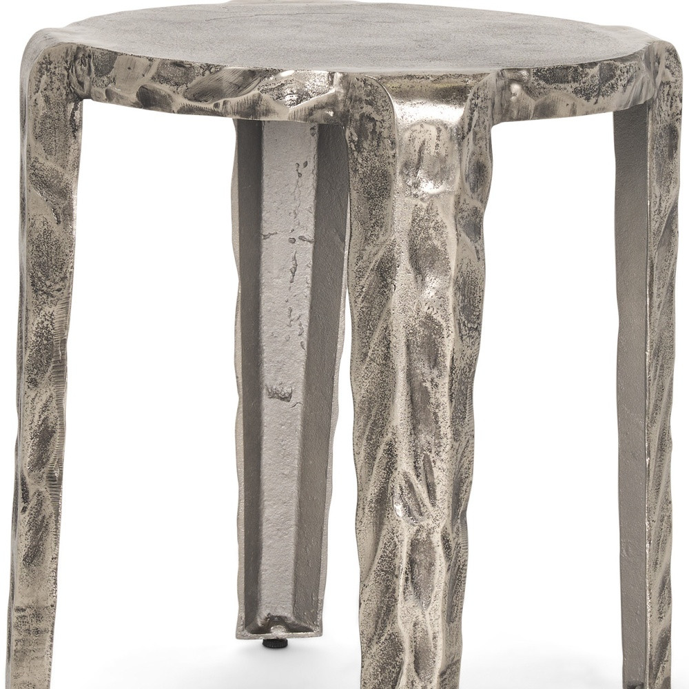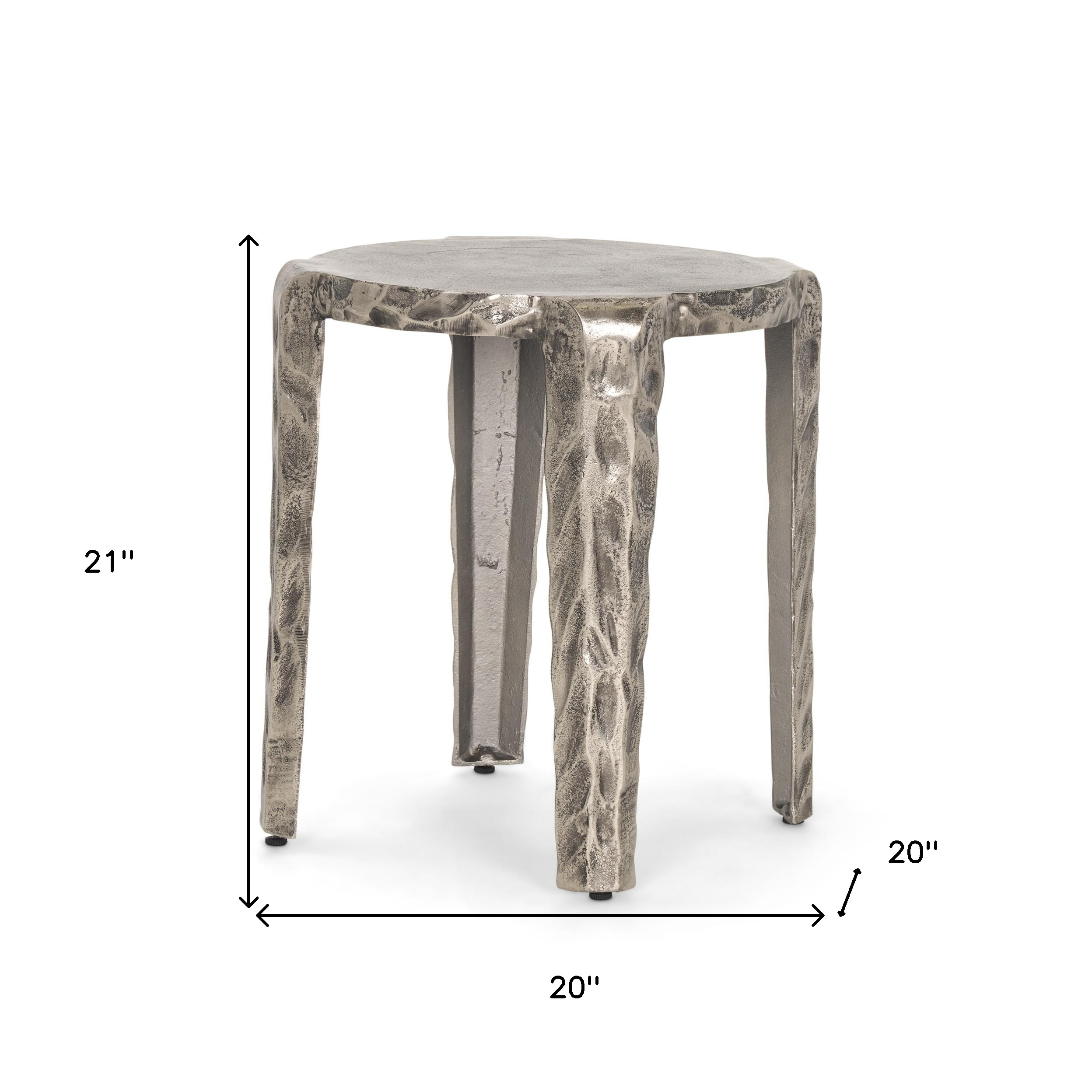 Show off your exquisite taste with this 21-inch silver distressed aluminum round end table. Made of aluminum, the silver coloration throughout gives this piece an updated and refreshing look. Complete with a purposefully distressed finish, this table has an aged, vintage, and rustic feel. A great accent on either side of the sofa or bed, this adorable end or side table is just what you need. You can also use it as an entryway table to hold your keys. 21.00-inch h x 20.00-inch w x 20.00-inch d.