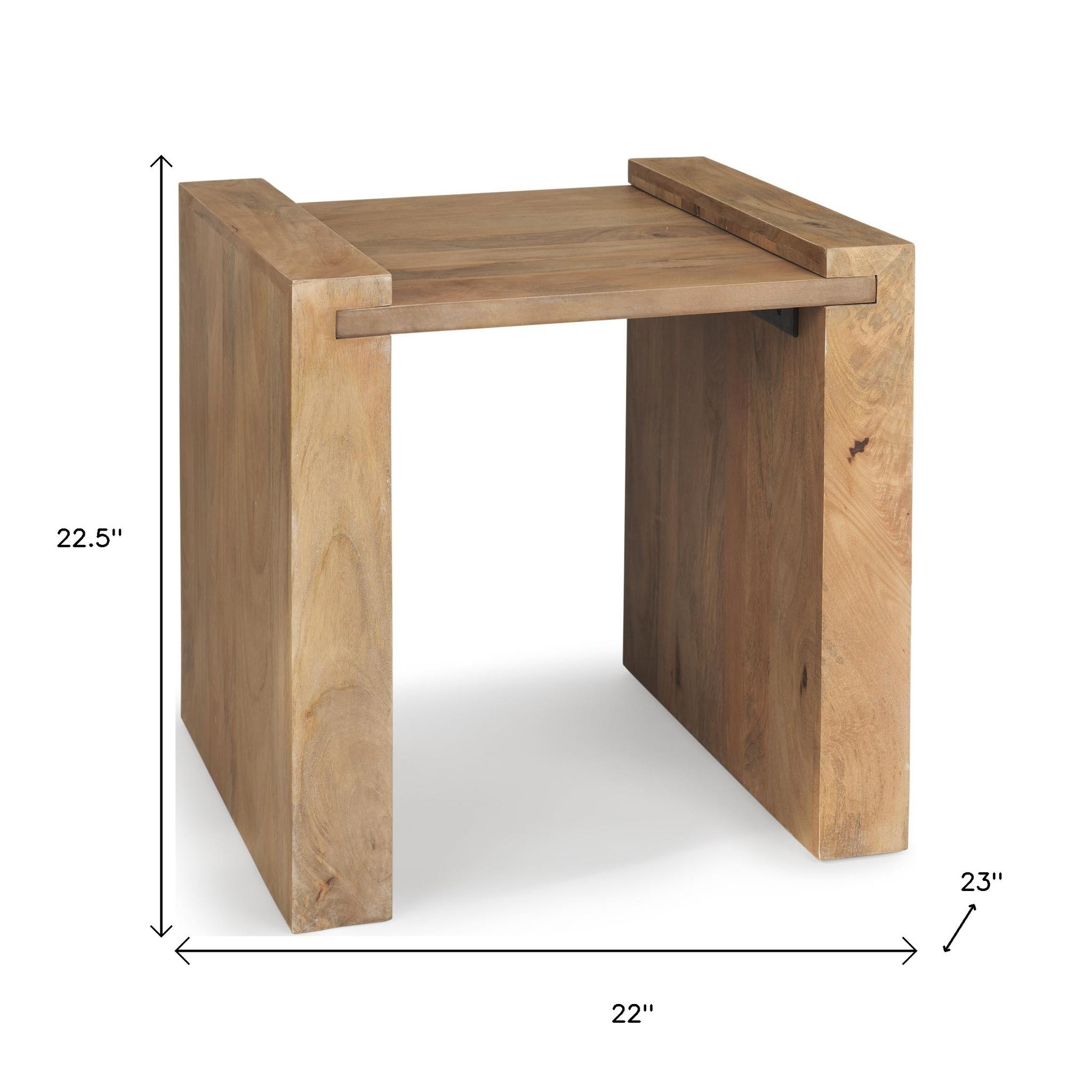 Distinctive in style the 23-inch natural distressed solid wood sled end table radiates a versatile charm. Made of solid wood, the natural coloration throughout gives this piece an updated and refreshing look. Complete with a purposefully distressed finish, this table has an aged, vintage, and rustic feel. An ideal location for placing your snacks and drinks, and a place to keep your lamp, frames, or other accessories. This versatile table is a great accent for most any room. 22.50-inch h x 22.00-inch w x 23.00-inch d.