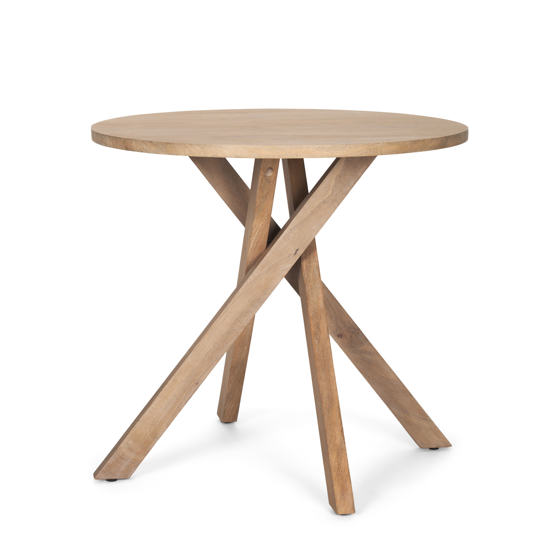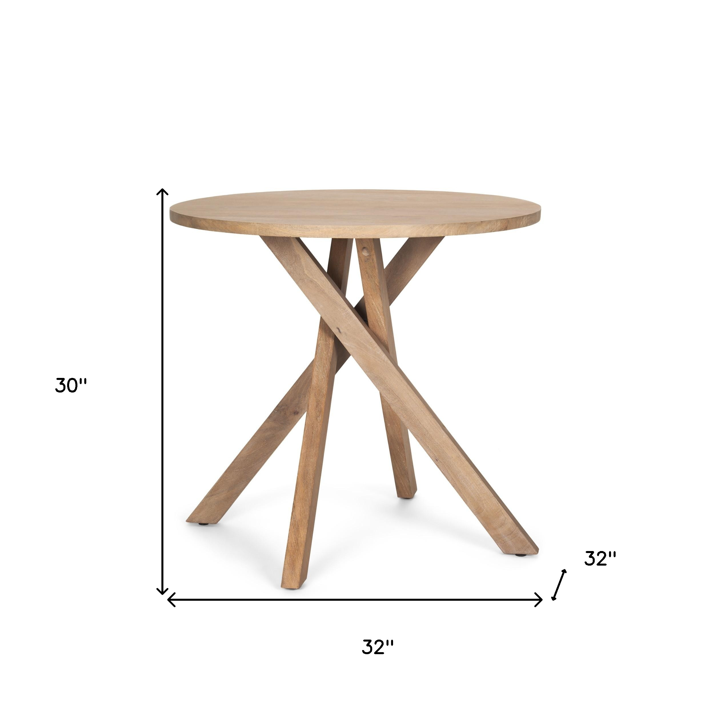 Show off your exquisite taste with this 30-inch natural distressed solid wood round cross legs end table. Made of solid wood, the natural coloration throughout gives this piece an updated and refreshing look. The purposefully distressed finish gives this table an authentically rustic feel. A great accent on either side of the sofa or bed, this adorable end or side table is just what you need. You can match it with other pieces to get the ideal look for your place. 30.00-inch h x 32.00-inch w x 32.00-inch d.