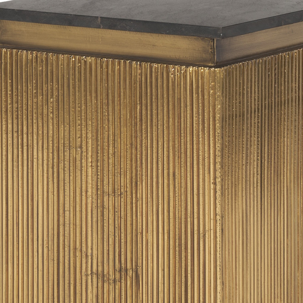 The 16-inch black and gold stone and metal tray table combines practicality and elegance in a compact design. Its modern style effortlessly enhances any living space, making it a versatile addition to your decor. The sturdy metal base features a striking gold finish, providing a beautiful contrast to the sleek black stone top. This tray table is perfect for serving drinks or displaying decorative items, adding functionality without compromising on aesthetics. With its unique blend of materials, this piece elevates the ambiance of your home while offering a convenient surface for everyday use. A stylish solution for small spaces, it fits seamlessly into various interior designs, ensuring you have the perfect spot to showcase your favorite essentials. 22.00-inch h x 16.00-inch w x 16.00-inch d.