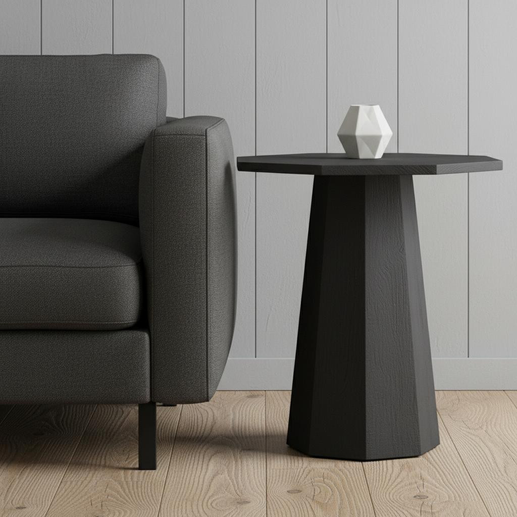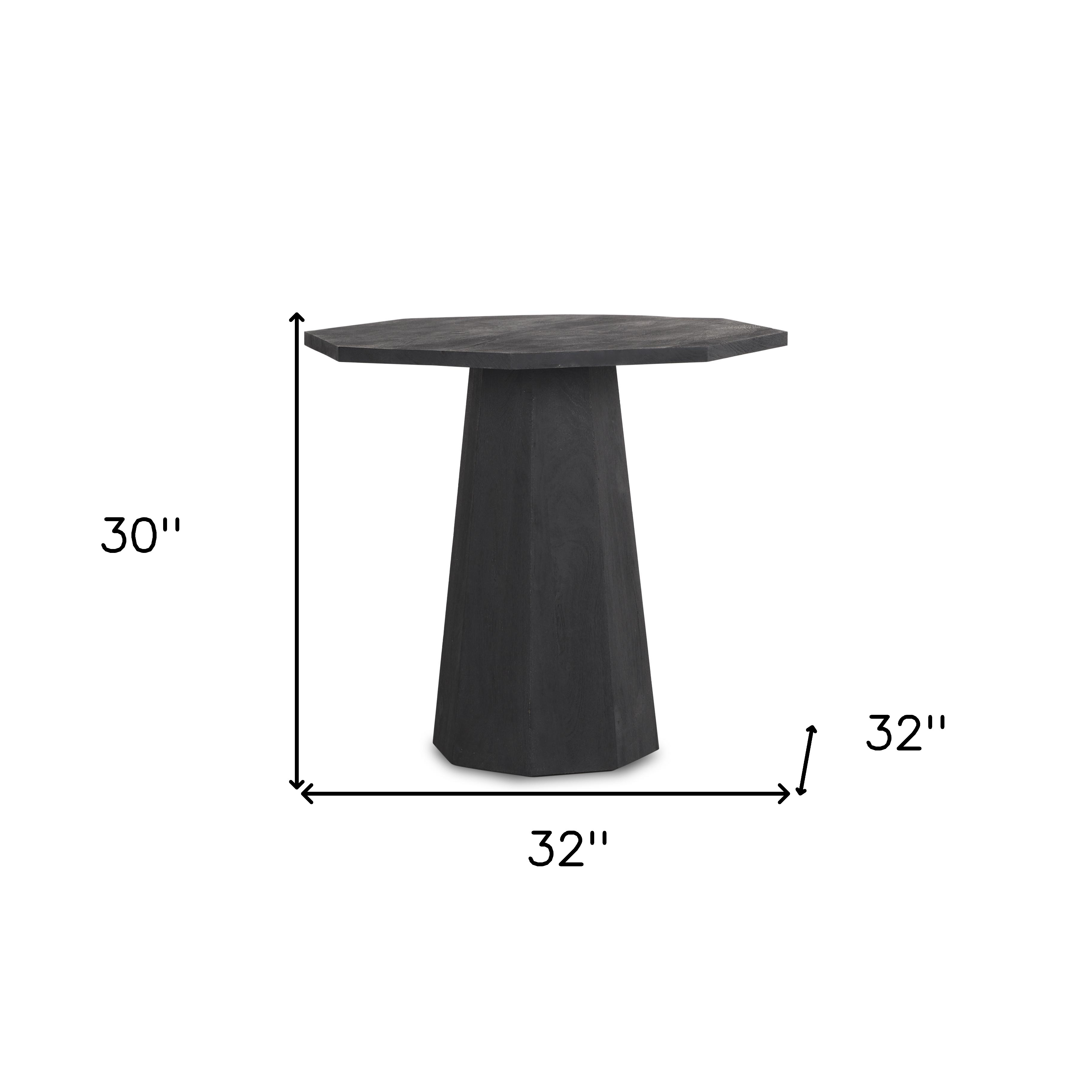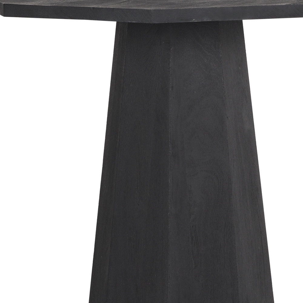 Distinctive in style the 30-inch black solid wood hexagonal pedestal end table radiates a versatile charm. Made of solid wood, the black coloration throughout gives this piece an updated and refreshing look. A great accent on either side of the sofa or bed, this adorable end or side table is just what you need. This versatile table is a great accent for most any room. 30.00-inch h x 32.00-inch w x 32.00-inch d.