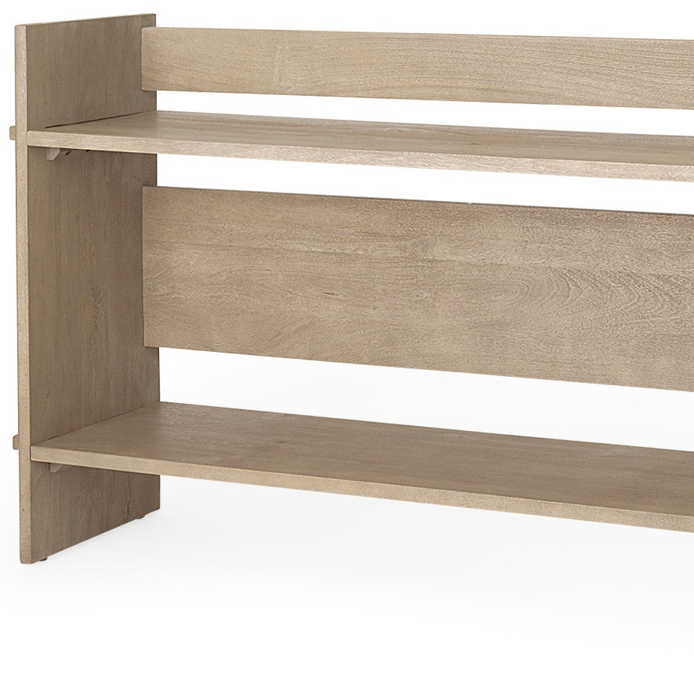 Transform your home with our elegant and versatile 76-inch light gray solid wood distressed solid console table with shelf. Don't miss out on the perfect finishing touch for your home. This rectangular table is ideal for up against the wall, can free stand in a room, or sit behind the sofa perfectly. This unit has a light gray genuuine hardwood tabletop. The solid of this unit is crafted with solid wood, leaving you with a console table that is of the finest quality and materials. Versatile in use, console tables can be used for a variety of purposes in a variety of rooms and settings. 36-inch h x 76-inch w x 16-inch d.