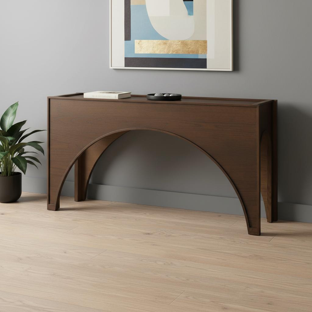 Make a statement in your entryway with our stunning 55-inch brown wood console table. This rectangular table features a unique decorative arch and is ideal for up against the wall, can free stand in a room, or sit behind the sofa perfectly. Versatile in use, console tables can be used for a variety of purposes in a variety of rooms and settings. 30-inch h x 55-inch w x 16-inch d.