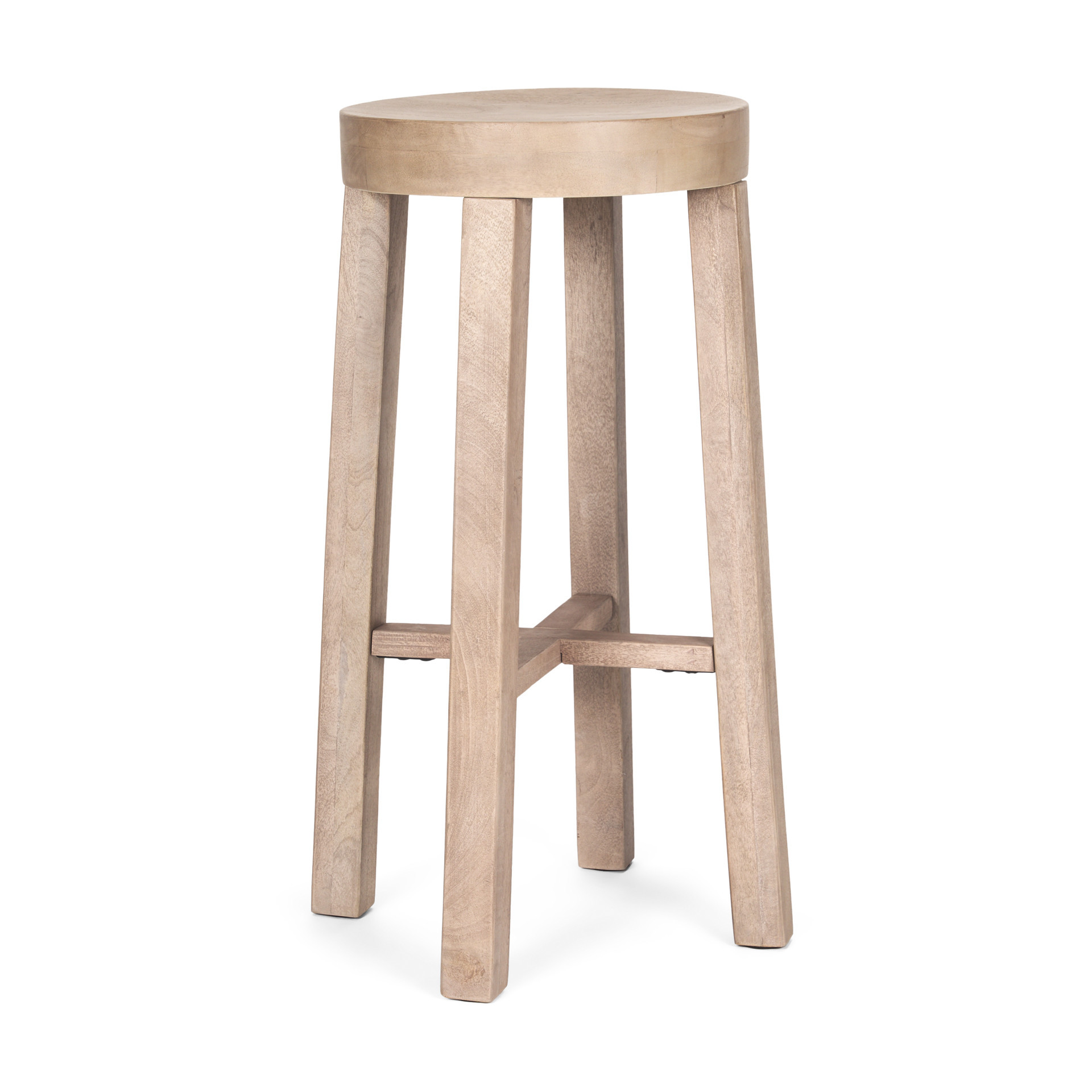 Bring a trendy bar vibe to your space, with this 30-inch natural solid wood backless bar height bar chair. A solid natural solid wood frame is finished off with a matching natural solid wood seat, giving this chair a chic monotone look. Designed to be good looking and practical, this backless bar chair features a round shaped seat. The round shape of the seat combines with a backless to give this chair a comfortable and fashionable look. 30-inch h x 18-inch w x 18-inch d.