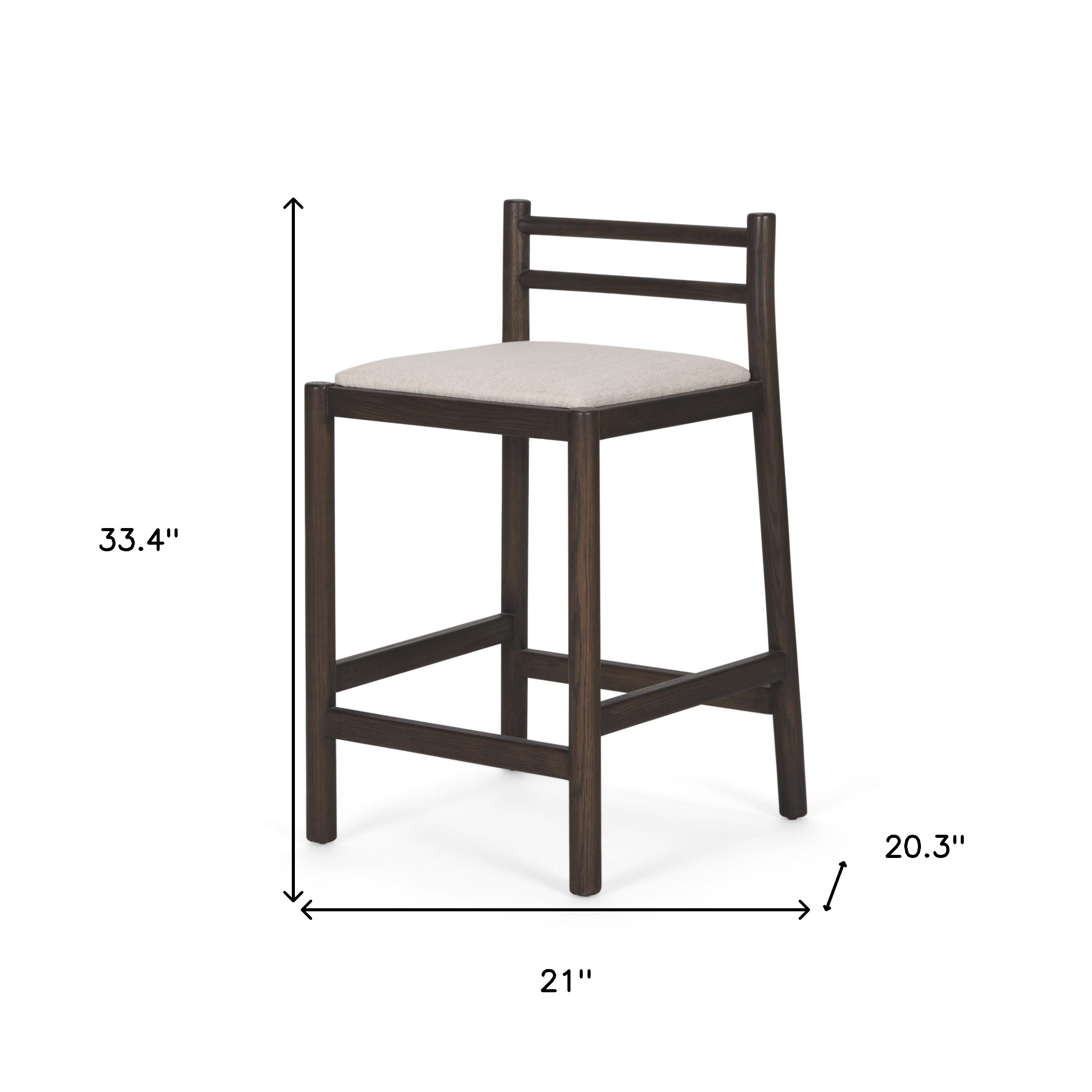 This 26-inch cream and dark brown fabric and solid wood low back counter height bar chair will be the perfect way to add some cool design and utility to your space similar to what you find in your favorite cafes or pubs. A dark brown solid wood frame is finished off with a cream upholstered seat that is the epitome of quality construction and design. Not only good looking and stylish, this chair features a rectangle shaped seat and a low back for the ultimate in comfort and enjoyment. 33.40-inch h x 21.00-inch w x 20.30-inch d.
